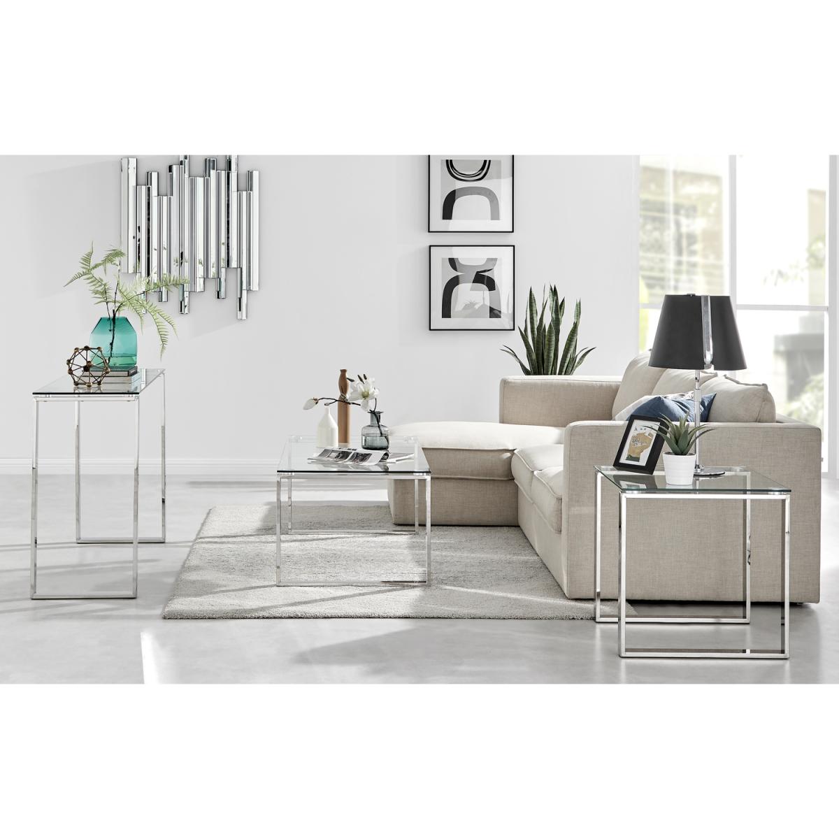 I’m really taken with how the chrome-and-glass table set keeps a room feeling light and uncluttered. The minimalist lines work equally well in contemporary, Scandinavian or industrial-inspired interiors, especially when paired with neutral upholstery and a muted rug. For practical styling, use the console as an entry-hall catch-all with a slim tray for keys and mail, then layer the coffee table with a couple of art books and a low vase to avoid blocking sightlines. The side table is perfect for a small lamp or stack of coasters, and because the surfaces are so easy to clean, it’s ideal in busy living spaces.