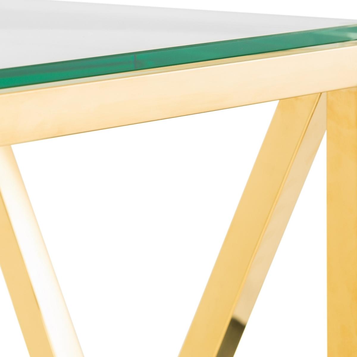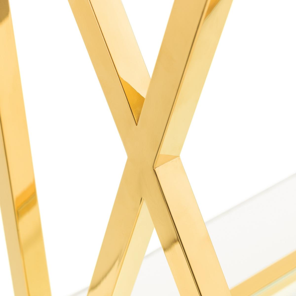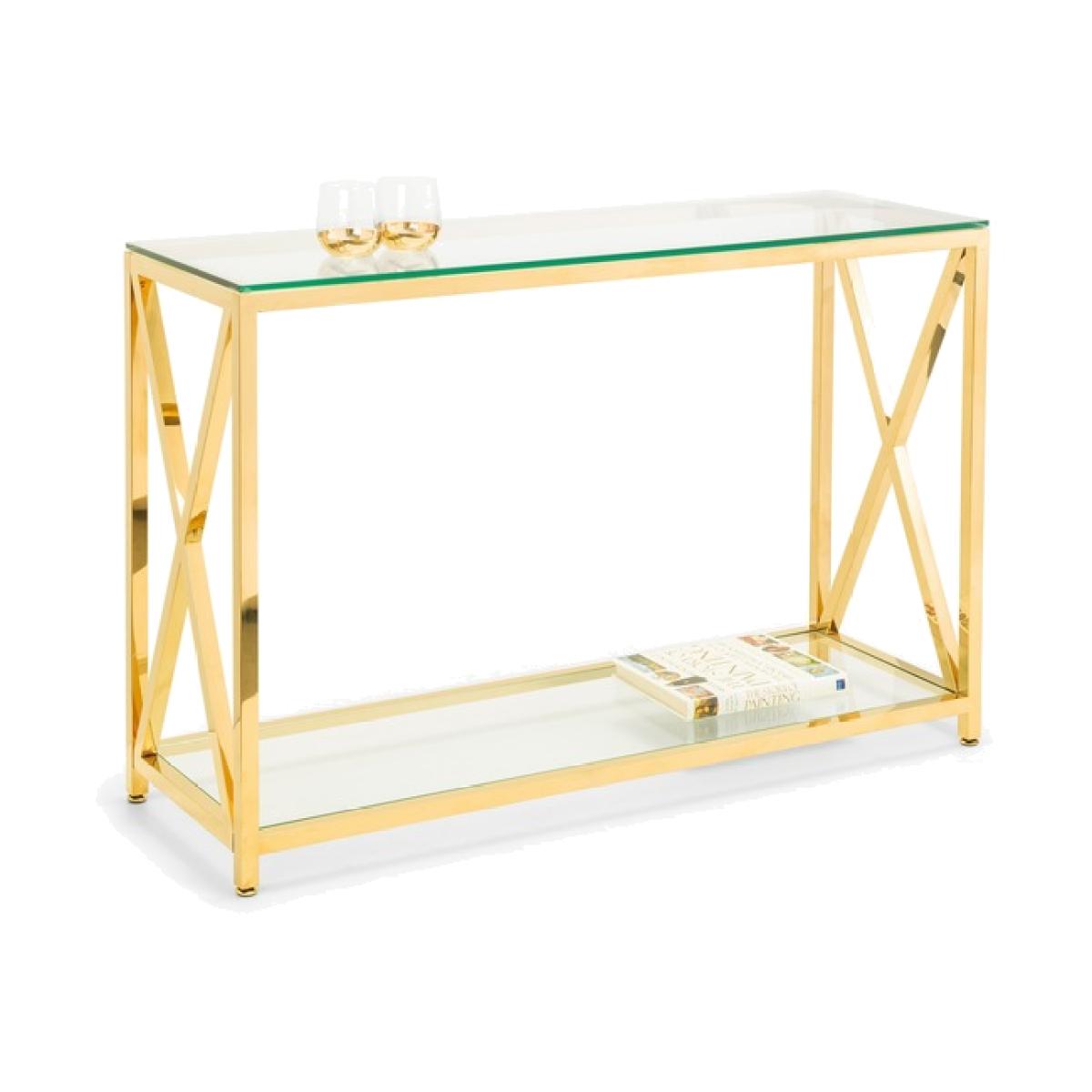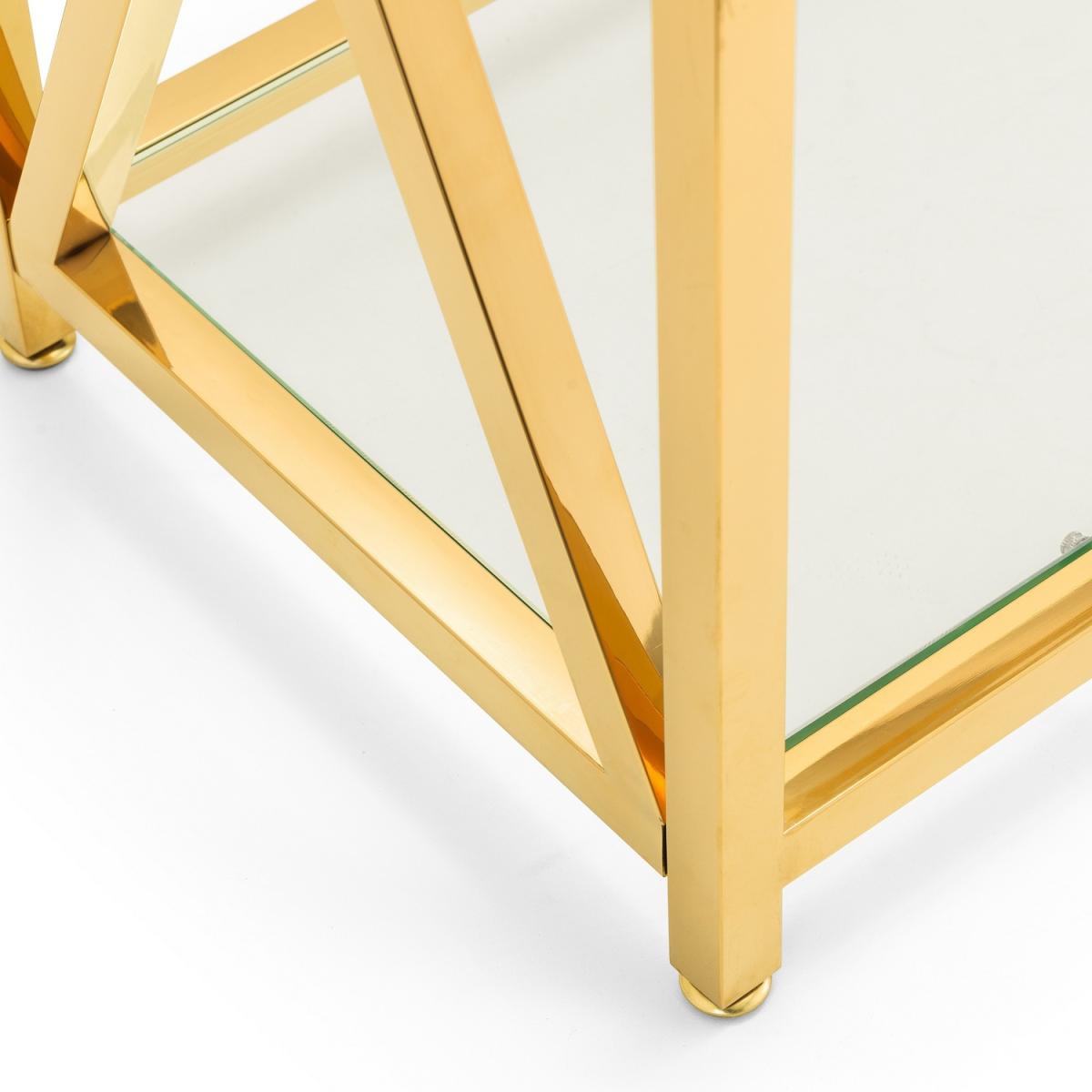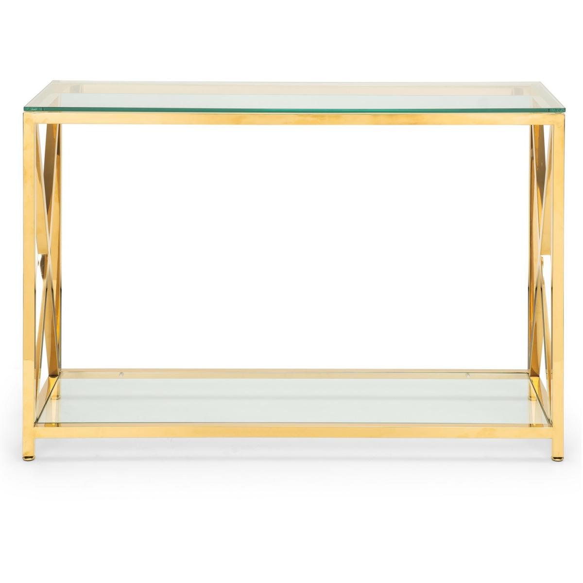 The lavish Miami occasional collection will add a touch of class and luxury to any home. Taking inspiration from the Art Deco period, the Miami features a striking cross-frame design. Crafted from a high-quality stainless steel frame and tempered glass, this console table provides a shelf underneath for additional storage.