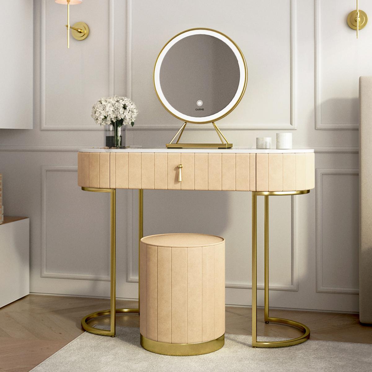 Make a statement with the Miami Deco cream velvet dressing table from the Carme Home Velvet dressing table collection. This luxury piece combines a bold aesthetic and elegance, making it a standout addition to your interior. With its rectangular shape and curved edges, this dressing table showcases modern beauty. The inverted art deco style gold legs add a touch of glamour, perfectly complemented by the matching gold tassel effect handle adorning the single spacious drawer. The white marble effect table top provides a luxurious surface for showcasing your beauty favourites. Enhancing your beauty routine, the Miami Deco dressing table includes a sleek removable circular gold mirror. Framed with a touch sensor activated, dimmable LED light, this mirror offers three different colour settings warm, day, and cool ensuring you get the perfect glow! For added comfort whilst you are getting ready this dressing table comes with a matching round padded velvet stool. The Miami Deco dressing table is a statement piece that elevates any bedroom or dressing room.