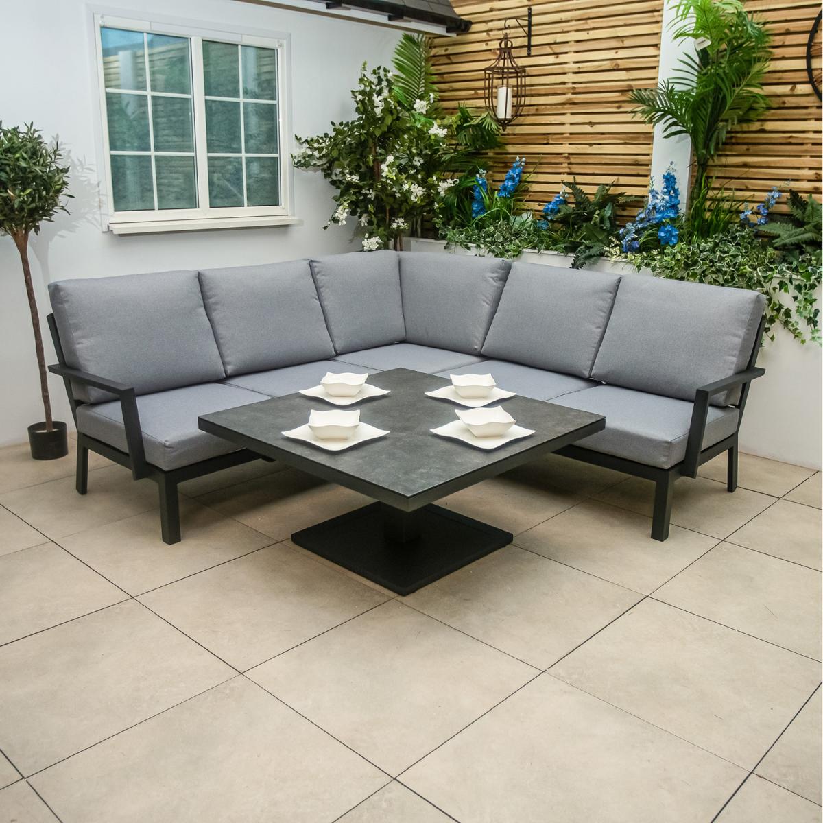 The Bracken Outdoors Miami Deluxe Aluminium Compact Range is a Lounge Set with a sleek modern design highly robust and stunning on the eye it is a perfect centrepiece for your outdoor space This set is made of a weatherproof anthracite powder coated aluminium frame and matching anthracite cushions also includes a gas strut operated height adjustable table for a higher dining height or a lower lounge style table The cushions are showerproof but we recommend any prolonged showers the cushions are removed and stored in a dry location Set Features 5 Seater Sofa Height Adjustable table Strong, lightweight aluminium frame Deep filled cushions Easy to clean Can be left outside all year with little maintenance (except for cushions) 5 year limited manufacturer warranty Dimensions Sofa H 77cm D 88cm W 223cm Table H 68cm D 95cm W 155cm 8mm thick glass