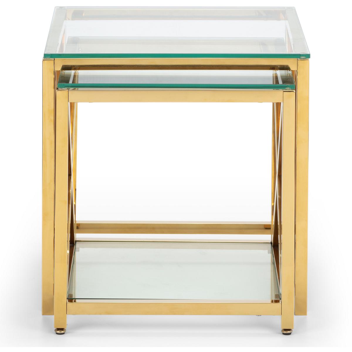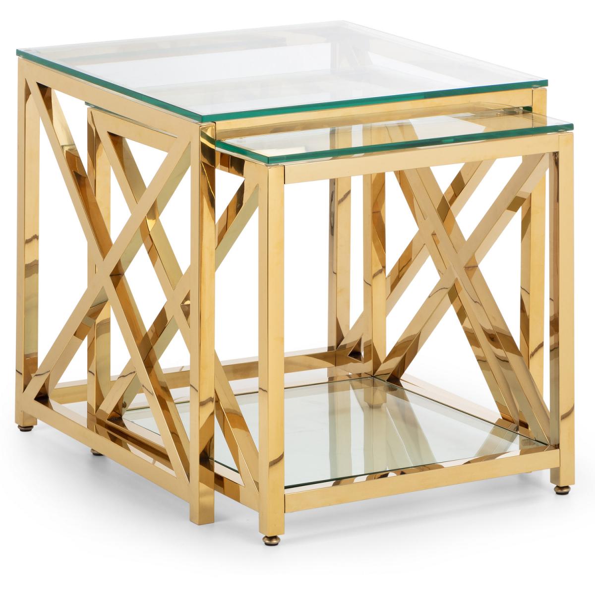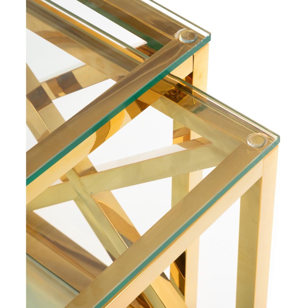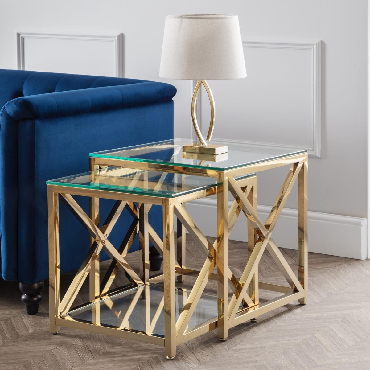 I love how these gold nest tables lift a room with their geometric metal frames and clear glass tops, giving you lightness without sacrificing sturdiness. The shiny finish works equally well in contemporary city lofts, art-deco inspired lounges or more traditional settings that need a modern touch. Styling-wise, pull the smaller table out as a temporary drinks station when guests arrive, then tuck it back beneath the larger one to save space. On the top, keep it simple with a low vase or neat stack of coffee-table books on a small tray. Pair with a richly textured rug or a jewel-toned sofa to balance the metallic sheen, and use both tables to introduce layers - height, texture and extra surface - without cluttering the room.