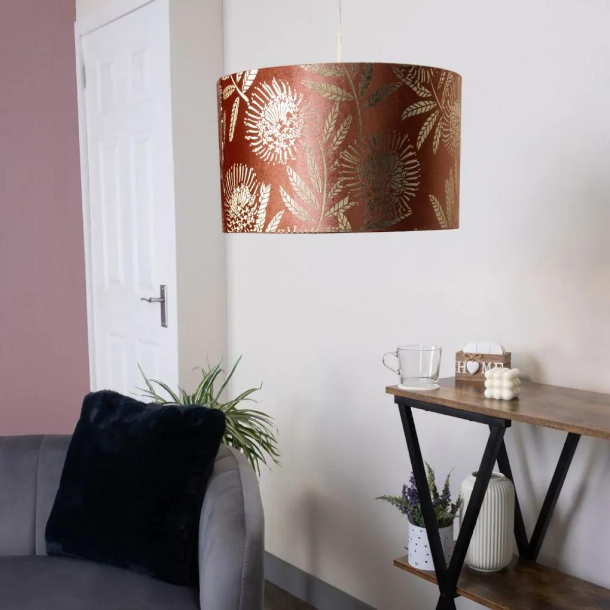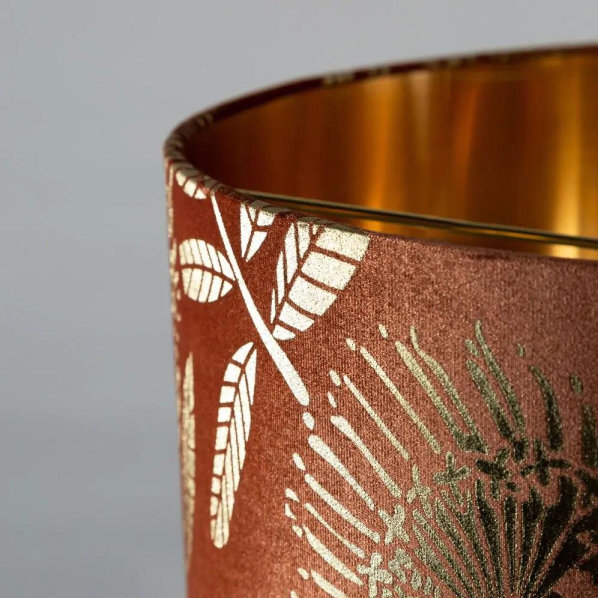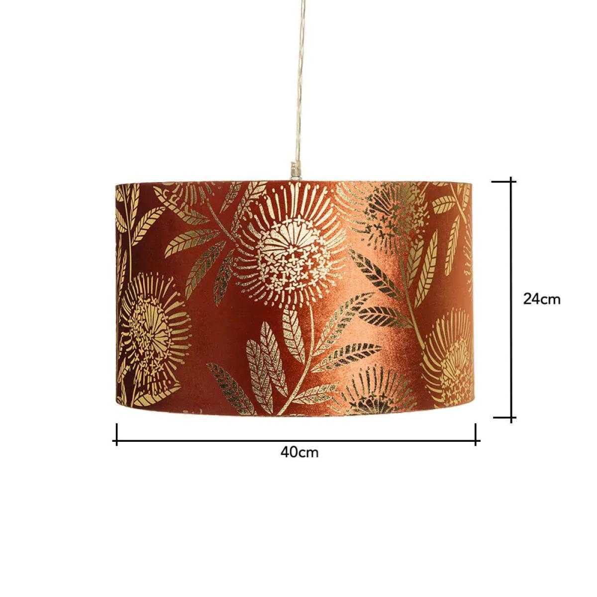 The Mica 40cm Velvet & Gold Print Easyfit Shade is a great lighting choice for any home. With no assembly required nor any hard-wiring, this lightshade can simply be fitted on your already installed light fitting. Making this shade a great option for rented homes. The unique orange colouring paired with the velvet-effect floral pattern makes this light stand out and bring a stylish edge to any home.