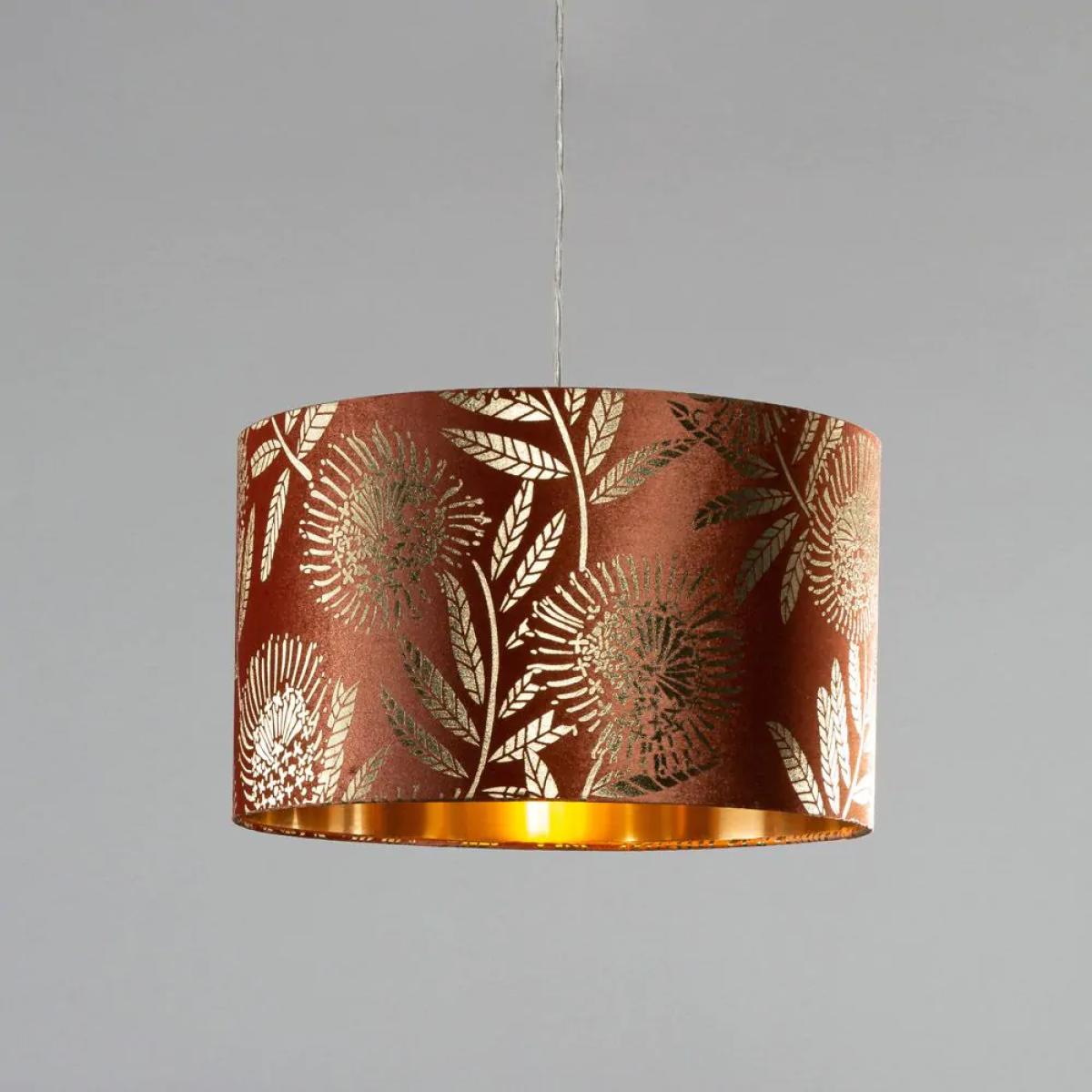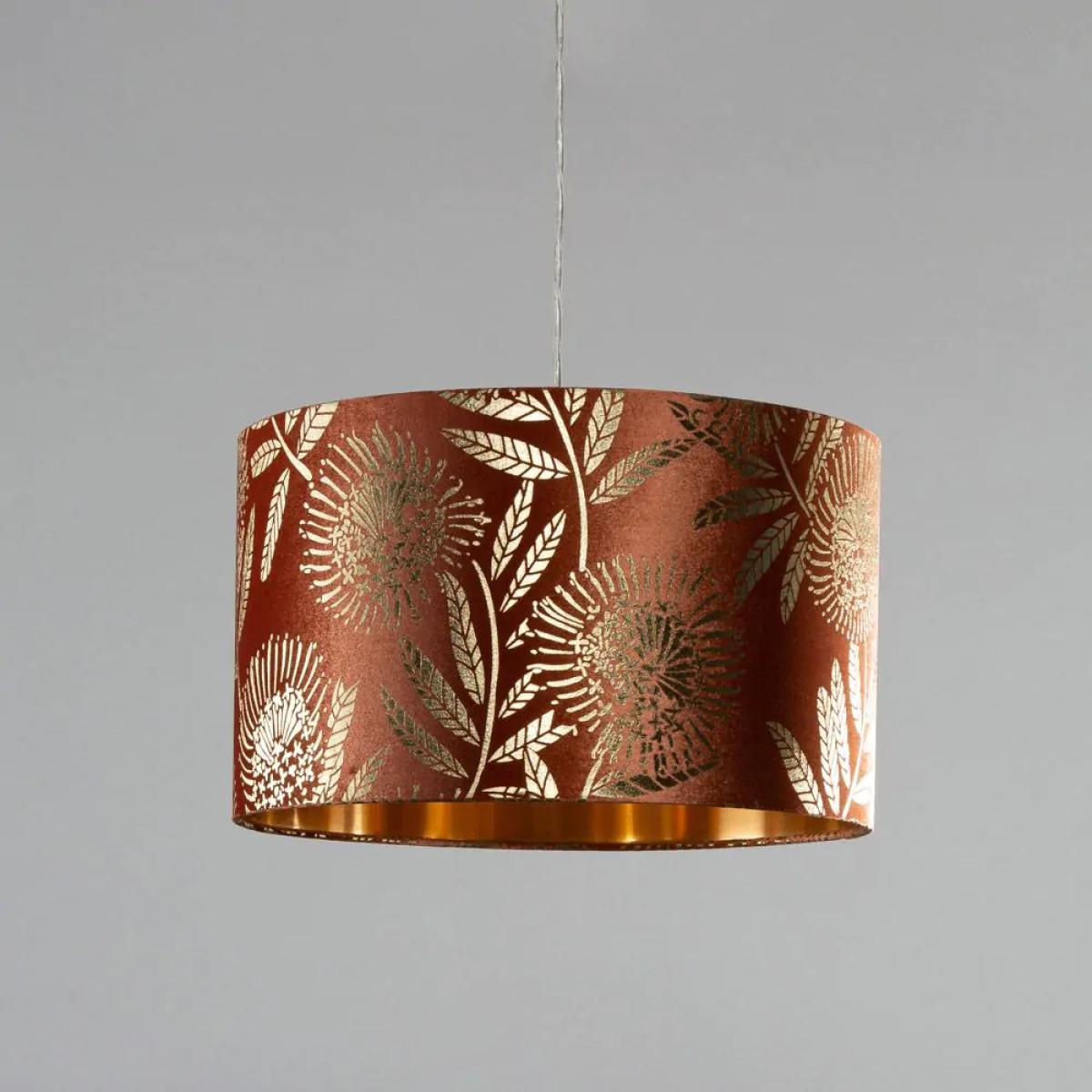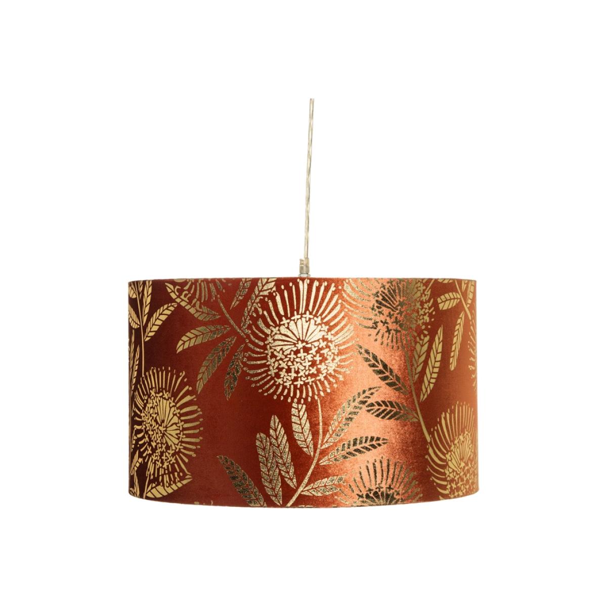 The Mica 40cm Velvet & Gold Print Easyfit Shade is a great lighting choice for any home. With no assembly required nor any hard-wiring, this lightshade can simply be fitted on your already installed light fitting. Making this shade a great option for rented homes. The unique orange colouring paired with the velvet-effect floral pattern makes this light stand out and bring a stylish edge to any home.