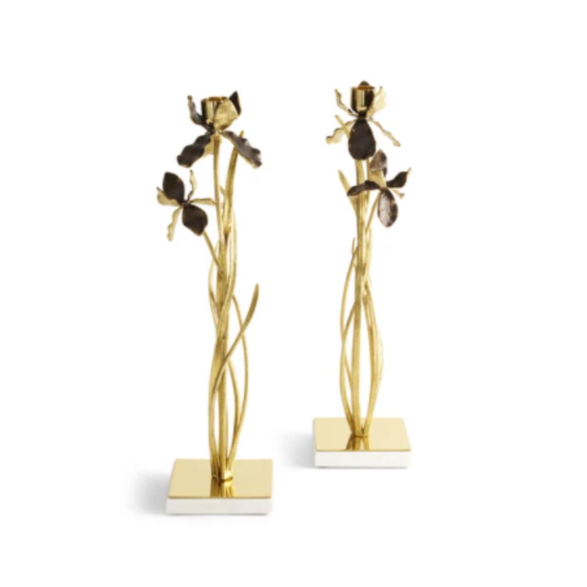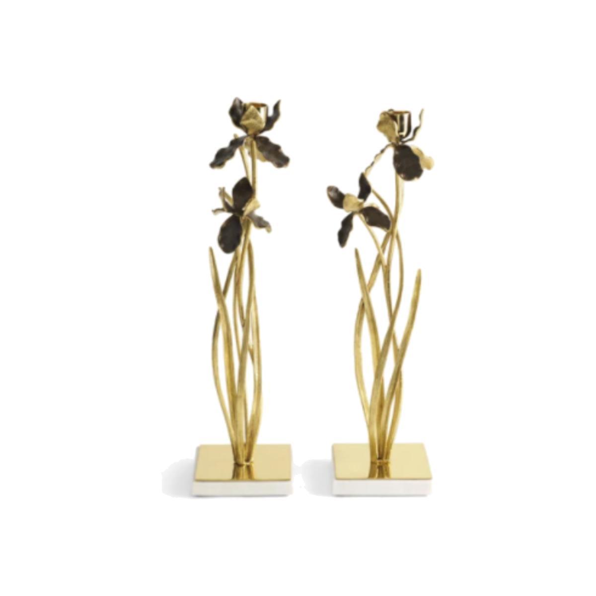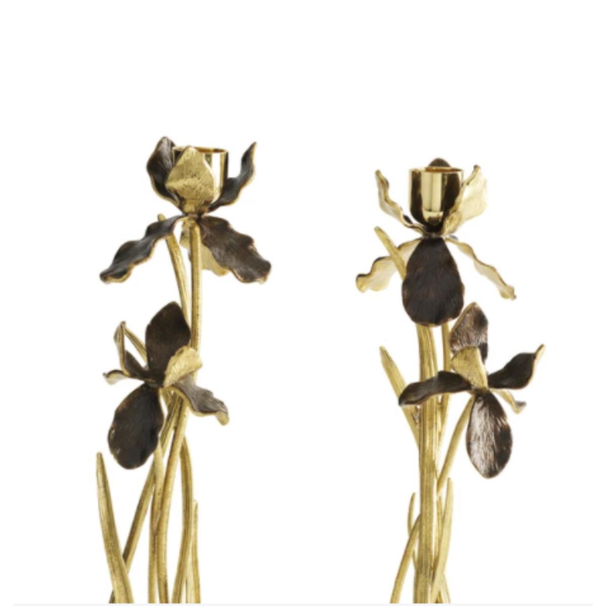 I love how these black iris holders combine sculptural elegance with a touch of nature-inspired charm. They work particularly well in contemporary or minimalist settings, adding a sophisticated focal point without overwhelming the decor. For styling, I suggest placing them on a mantelpiece, sideboard, or coffee table, either as a pair or as a statement piece on their own. Pairing them with simple, neutral-toned candles or grouping them with other metallic accents can create a refined look. They also work well in more eclectic interiors when paired with softer textiles or textured accessories, offering contrast and visual interest.