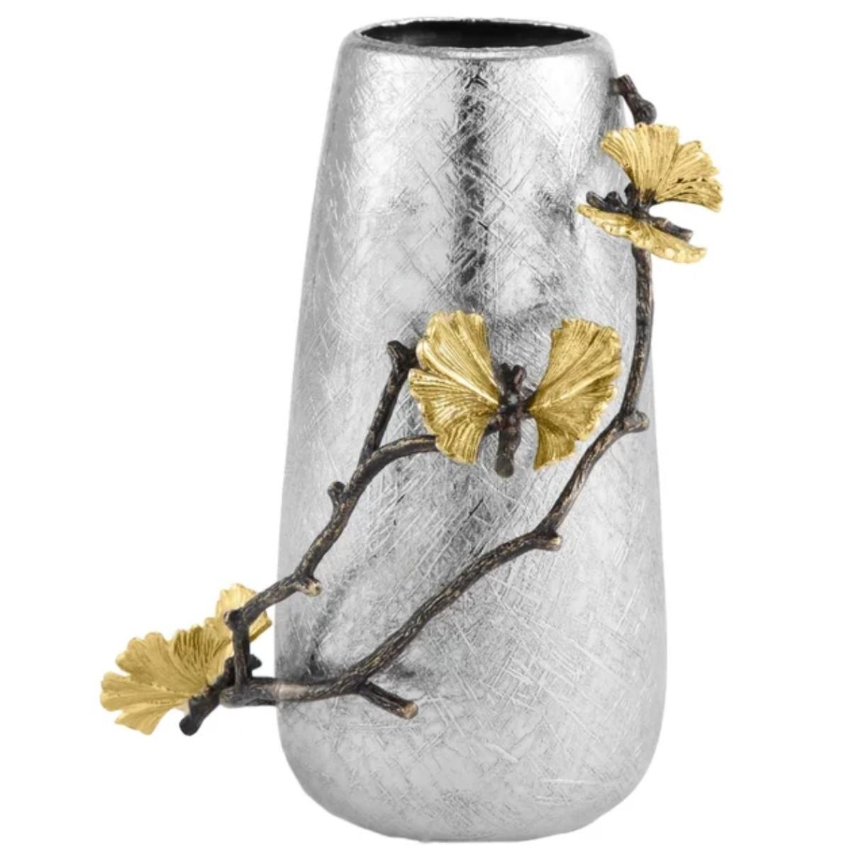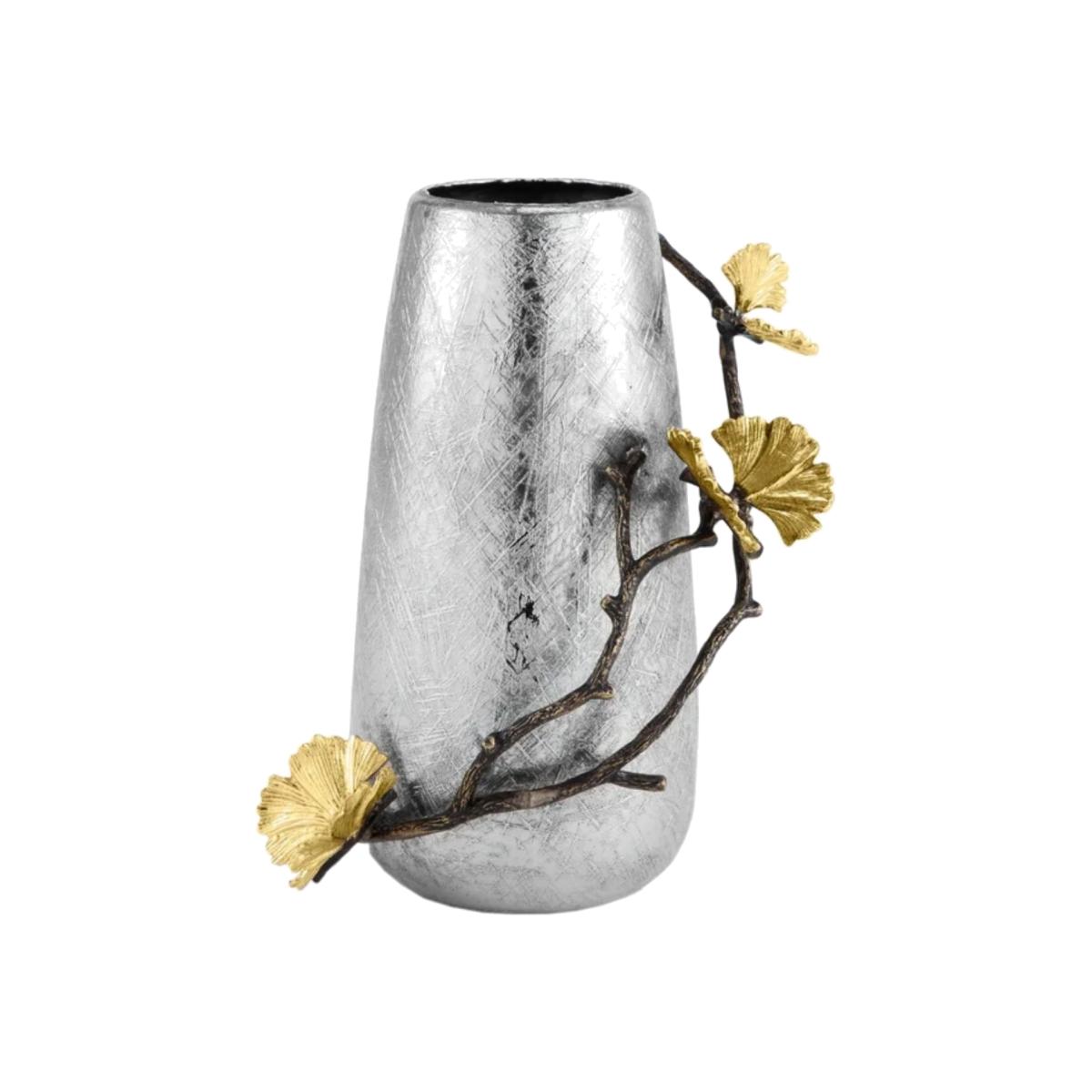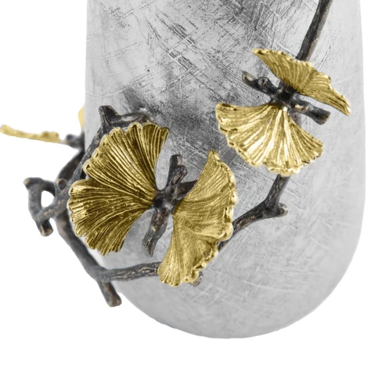The Butterfly Ginkgo Collection celebrates the representation of flora as fauna. Michael's fascination with a particular type of ginkgo tree, the ginkgo Biloba, or "Butterfly ginkgo", which grows with a double leaf reminiscent of a butterfly's wings, gave rise to a fantasia image of the plant. Executed at the highest level of handcraftsmanship, each piece is rendered in solid bronze with acid etched cocoon-shaped vessels. The pieces in the collection are a tour de force of Indian craft and capture the poetic spirit that is so deeply indicative of Michael's work.