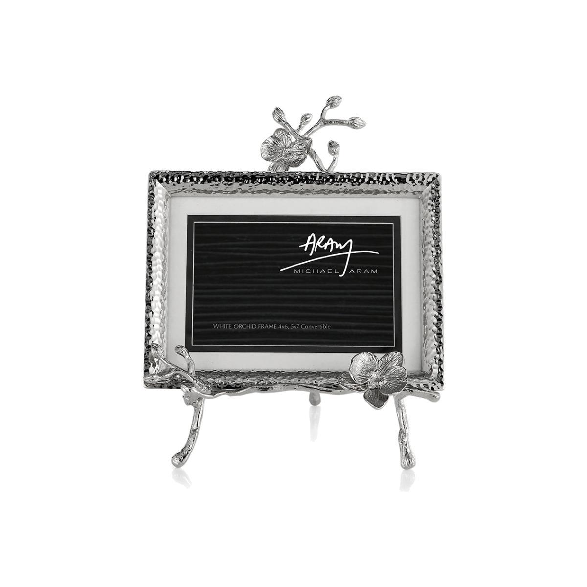 Create a statement in any room of the house with this stunning White Orchid convertible easel frame from Michael Aram. Handmade from nickel plate, this unique photo frame features an elegant easel which forms a freestanding frame. Inspired by the delicacy and grace of the orchid, this easel frame is adorned with luxuriously detailed orchids. To insert photograph, loosen screw first and then move tab, remove frame and place photograph, set tabs in correct position and then tighten screws, a screwdriver should always be used not tab.