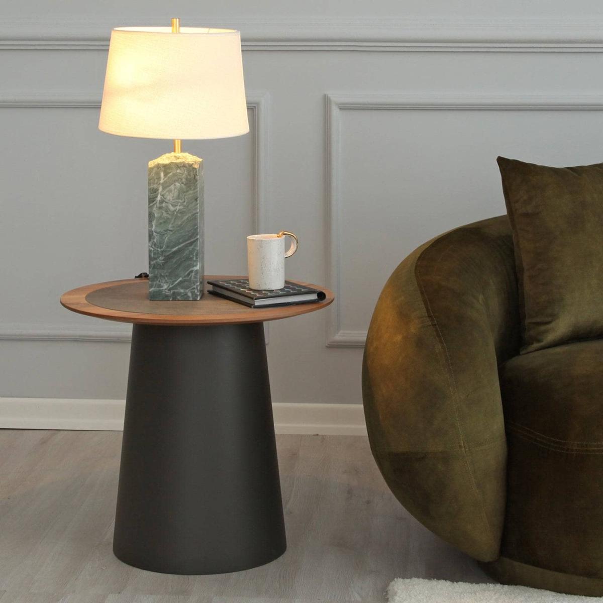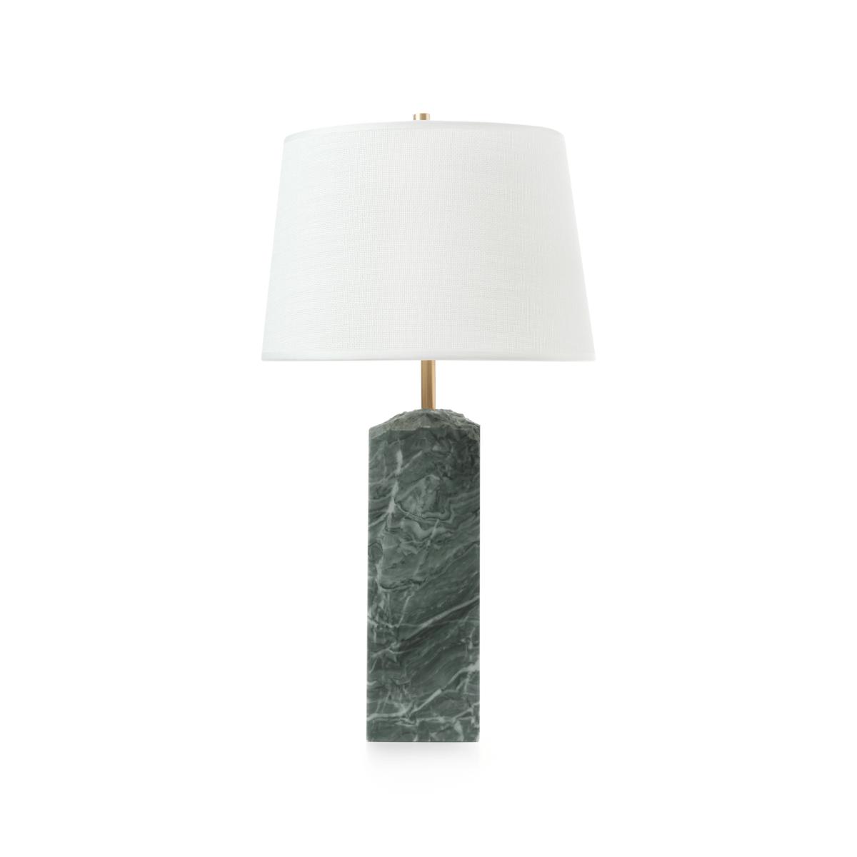 Our Michelango is a classically tall marble lamp with a modern update that will elevate any space. We love the sharp edges and design of this table lamp, which has a handmade linen lampshade and a green Manyas marble base. Because of Michelangelo's versatility, you can go sleek and modern with minimal styling or add a twist to a more traditional interior. A contemporary take on a marble lamp, each piece is unique, handcrafted from natural materials, and topped with a linen lampshade. Marble, as a natural material, has veins that distinguish each piece of stone.