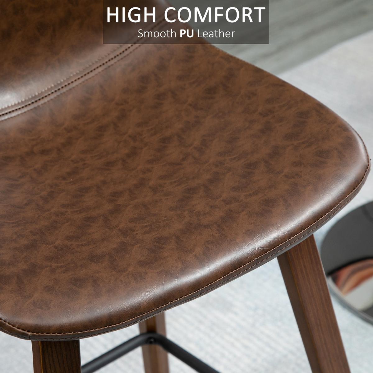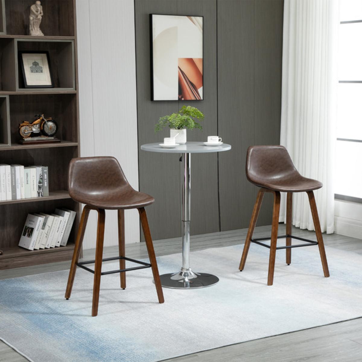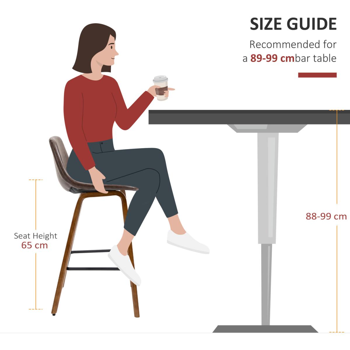 Take a seat in true retro style - thanks to these two bar stools from HOMCOM. Each barstool is covered with PU leather in a cool worn-out finish. The smooth surfaces are easy to clean. The curved backrest and footrest support your posture. Fitted with a wooden base, in an 'A' shape to keep steady. Two adjustable feet for continued balance.