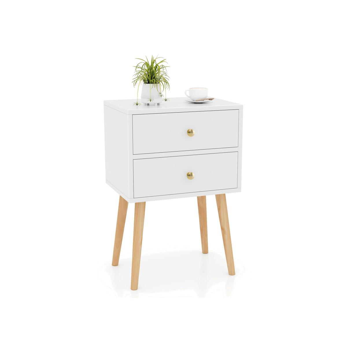 I really like how this mid-century-inspired side table pairs clean white panels with natural-wood legs, giving you both style and storage in a compact footprint. Its two drawers are ideal for stashing bedside essentials or remote controls, so it works equally well in a bedroom, hallway or next to a sofa in a small living room. For styling, keep the top clutter-free: a slim-profile lamp, a small potted plant and a neat stack of books add interest without overwhelming the scale. The neutral finish means it blends into Scandi, contemporary or minimalist schemes, while the brass knobs give it a subtle vintage nod.