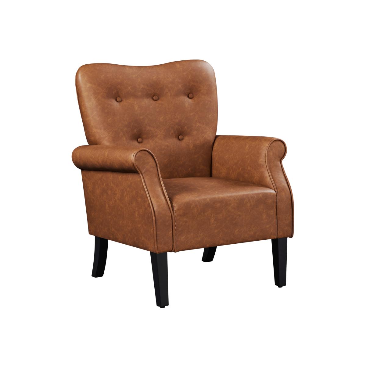This accent armchair is built on top of four solid rubberwood legs for long-lasting stability and durability. The soft cushion, made of faux leather and foam, ensures a cozy and comfortable sitting experience. Featuring a mid-century modern design, this upholstered armchair adds traditional charm to your home. A high, sheltering backrest, large seat cushion, and rolled arms offer plenty of comfort and support while reading, socializing, or simply relaxing. Imagine sinking into the chair after a long day at work it's the ideal addition to your living room, reading nook, bedroom, office, apartment, and more.