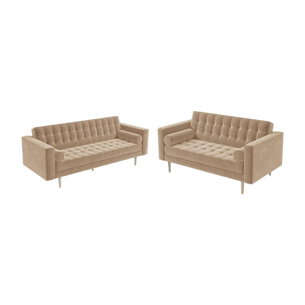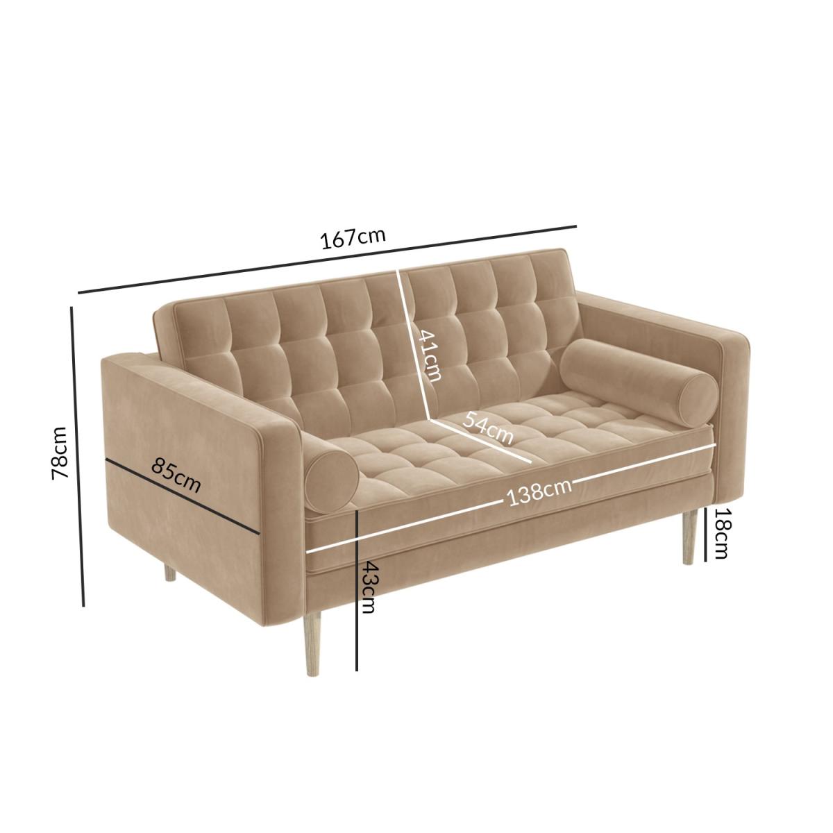 The Elba 3 seater sofa is a beautiful combination of classic and contemporary styling. Discover maximum comfort and minimum maintenance with this gorgeous, foam-filled sofa. The clean, square lines are inspired by the mid-century, whilst the double piping and buttoned back add just the right amount of opulence. The clean arms and tall tapered legs in a contrasting whitewash wood keeps the design fresh. It's finished beautifully in a sophisticated beige velvet. The sofa has been carefully crafted with a combination of tough materials, so you can rest easy. The frame has been made using solid eucalyptus wood and thick plywood. Whilst the interior consists of S springs and quality foam to create a durable and comfortable platform. The design sits upon solid birch legs in washed oak effect, which contrasts the neutral beige finish beautifully whilst giving the sofa a floating effect that is ideal for enhancing the look of space in smaller rooms. The sofa is complete with two bolster cushions, adding that finishing touch of luxury and comfort. The sofa will require minor assembly, it shouldn't take longer than 20 minutes as it's simply a case of fixing the tapered legs into position. 3 Seater Sofa Information Material: Solid birch, solid eucalyptus wood & thick plywood Finish:Beige Velvet Filling: Foam Assembly required: Yes – less than 20 minutes 2 Seater Sofa Description Mid-century inspired design with a fresh and modern twist Double piping and deep button detailing incorporate a touch of traditional styling Sophisticated beige velvet finish Tapered whitewash birch legs contrast beautifully keeping the design fresh Included bolster cushions add comfort and elegance S spring base and layers of foam provide both a comfortable and firm place to relax All about me The Elba 2 seater sofa is a beautiful combination of classic and contemporary styling. The clean, square lines are inspired by the mid-century, whilst the double piping and buttoned back add just the right amount of opulence. The clean arms and tall tapered legs in a contrasting whitewash wood keeps the design fresh. It's finished beautifully in a sophisticated beige velvet. The sofa has been carefully crafted with a combination of tough materials, so you can rest easy. The frame has been made using solid eucalyptus wood and thick plywood. Whilst the interior consists of S springs and quality foam to create a durable and comfortable platform. The design sits upon solid birch legs in whitewash , which contrasts the rich beige velvet finish beautifully whilst giving the sofa a floating effect that is ideal for enhancing the look of space in smaller rooms. The sofa is complete with two bolster cushions, adding that finishing touch of luxury and comfort. The sofa will require minor assembly, it shouldn't take longer than 20 minutes as it's simply a case of fixing the tapered legs into position. 2 Seater Sofa Information Material: Solid birch, solid eucalyptus wood & thick plywood Finish:Beige Velvet