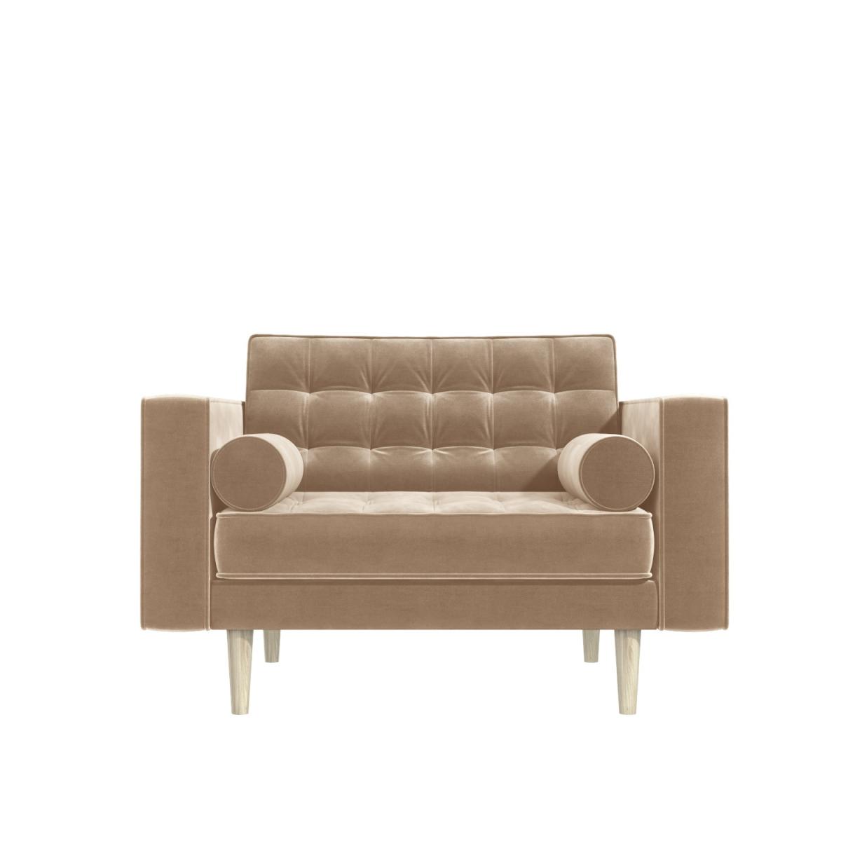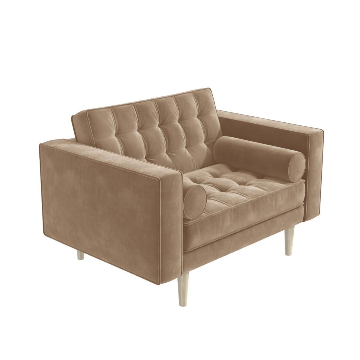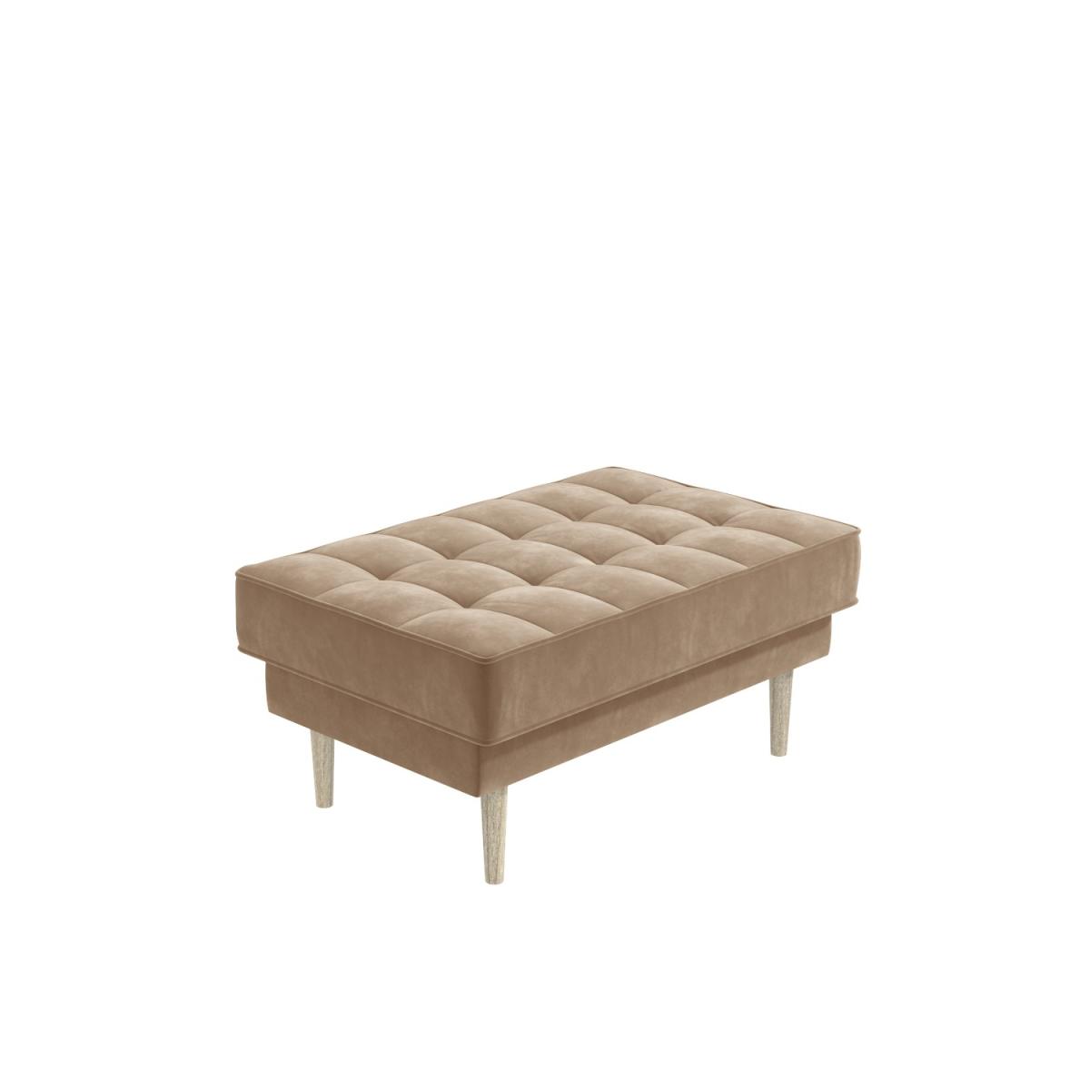 Beige loveseat and footstool with 2 bolster cushions Upholstered in soft velvet with deep button detailing Seating is filled with a comfortable high-density foam Stylish dark wood legs add a mid-century modern feel Loveseat cushion covers are removeable & washable Easy to assemble, simply screw the legs into place Need to know Loveseat information Max supported weight: 100kg per seat Product weight: 28kg Seats: 2 Colour: Beige Finish: Velvet upholstery Material: Velvet fabric, eucalyptus and plywood frame Assembly required: Yes - just the legs Footstool information Max supported weight: 100kg Product weight: 10.5kg Colour: Beige Finish: Velvet upholstery Material: Velvet fabric, eucalyptus and plywood frame Assembly required: Yes - just the legs