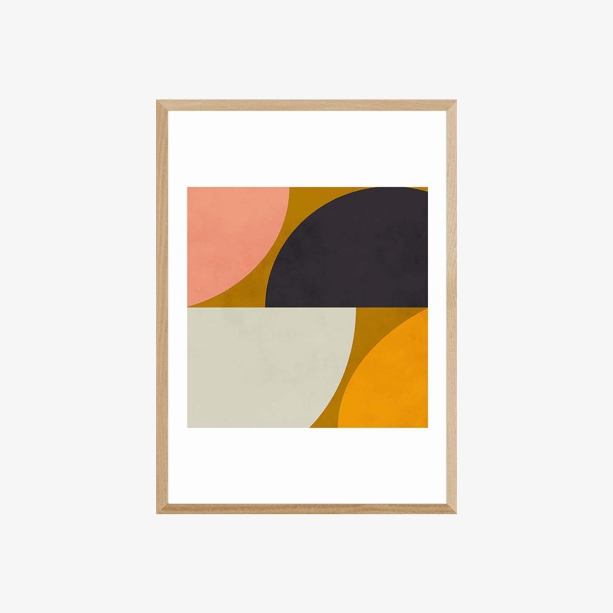 Add a touch of mid-century to any space with this geometric half-circle print. Inspired by minimalist design, the artwork features coloured half circles that combine to create an elegant display of colour and balance. This art will add an artistic touch that is guaranteed to catch the eye. Only giclée printing processes are used for this print resulting in the highest quality museum-level colours and sharpness. Choose between a number of different coloured frames and three sizes for the perfect print for your space.