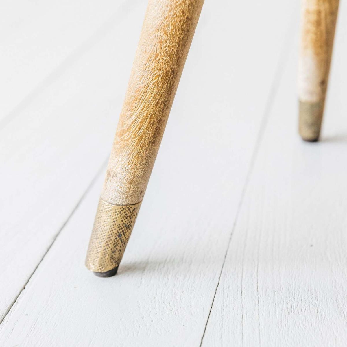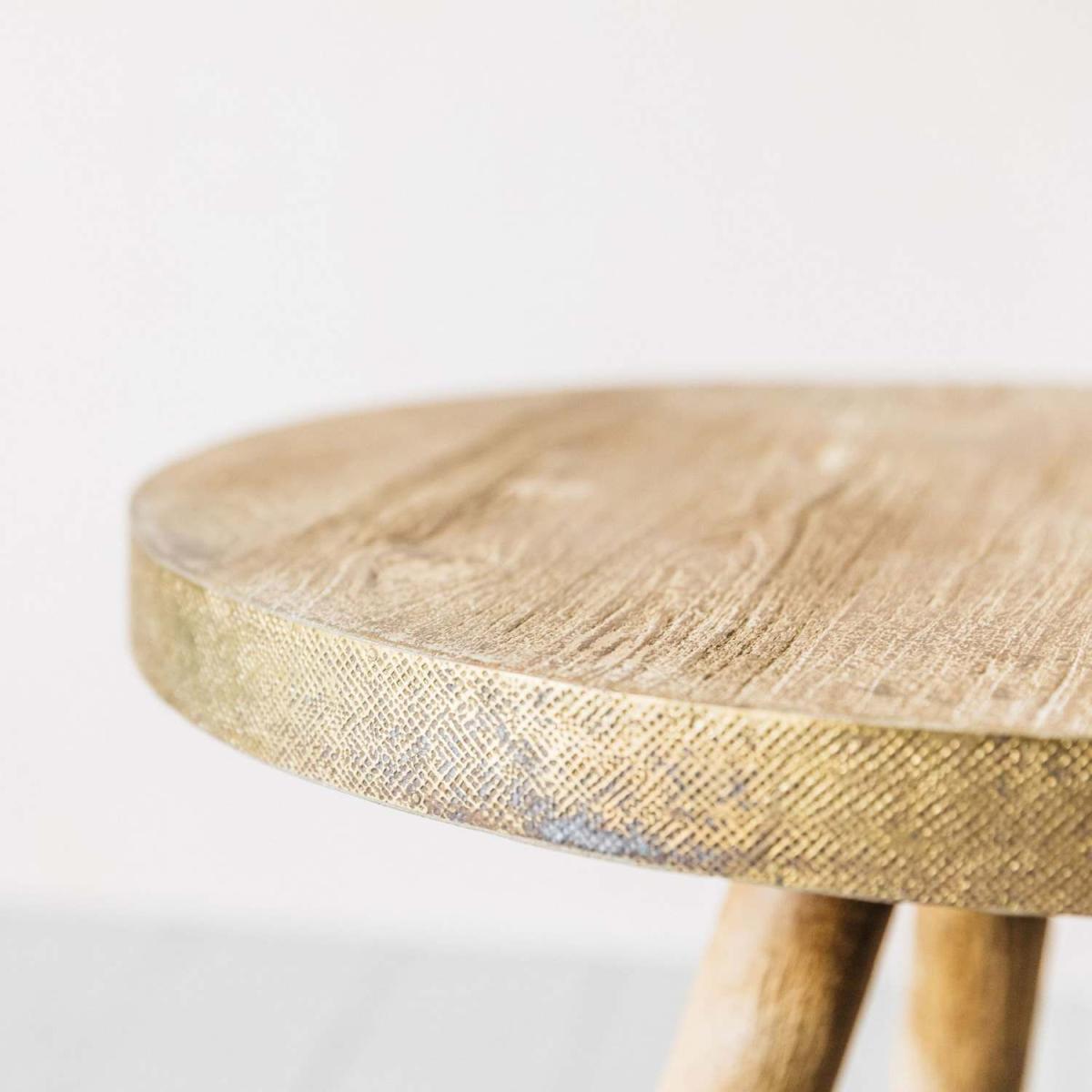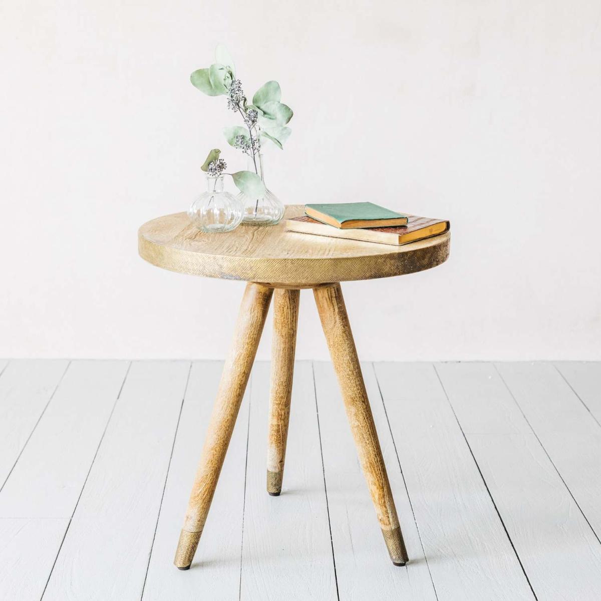 This contemporary Midas Side Table with a round table top, a distinct tripod leg design and a gold trim is the perfect addition to any living space. A simple light wood design with a subtle gold wash highlights the beaten brass edging.