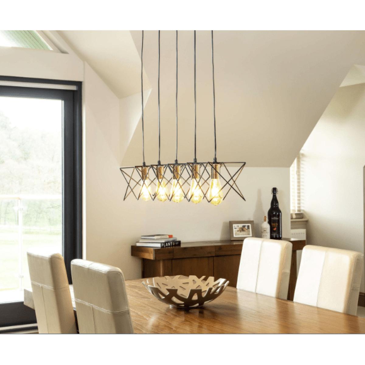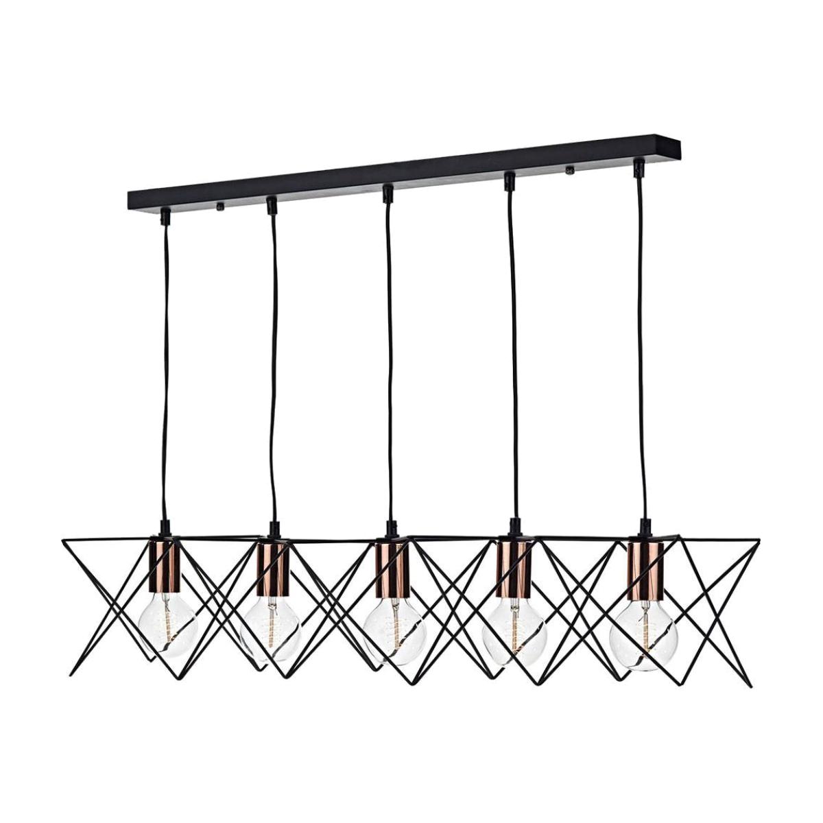 Add an industrial feel to your home with the Midi 5 Light Bar Pendant from Dar Lighting. This piece features 5 lights suspended from a ceiling bar with a gorgeous matt black finish throughout, complemented by copper detailing on the lamp holders. The open metal work frame showcases the decorative light bulbs housed within. The Midi Pendant Light has a maximum drop of 1280mm, is 190mm in width and 930mm in length. It requires 5 x GLS ES light bulbs with a maximum wattage of 40w. Dar Product Code: MID0522 Add an industrial feel to your home with the Midi 5 Light Bar Pendant from Dar Lighting. This piece features 5 lights suspended from a ceiling bar with a gorgeous matt black finish throughout, complemented by copper detailing on the lamp holders. The open metal work frame showcases the decorative light bulbs housed within. The Midi Pendant Light has a maximum drop of 1280mm, is 190mm in width and 930mm in length. It requires 5 x GLS ES light bulbs with a maximum wattage of 40w. Dar Product Code: MID0522