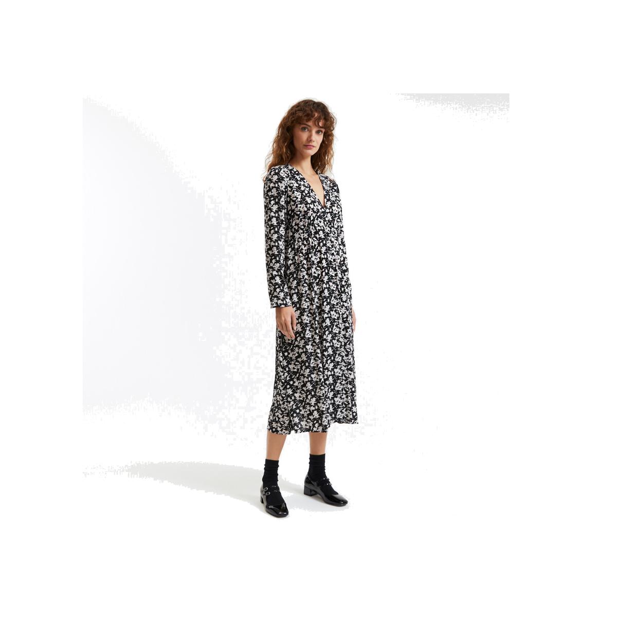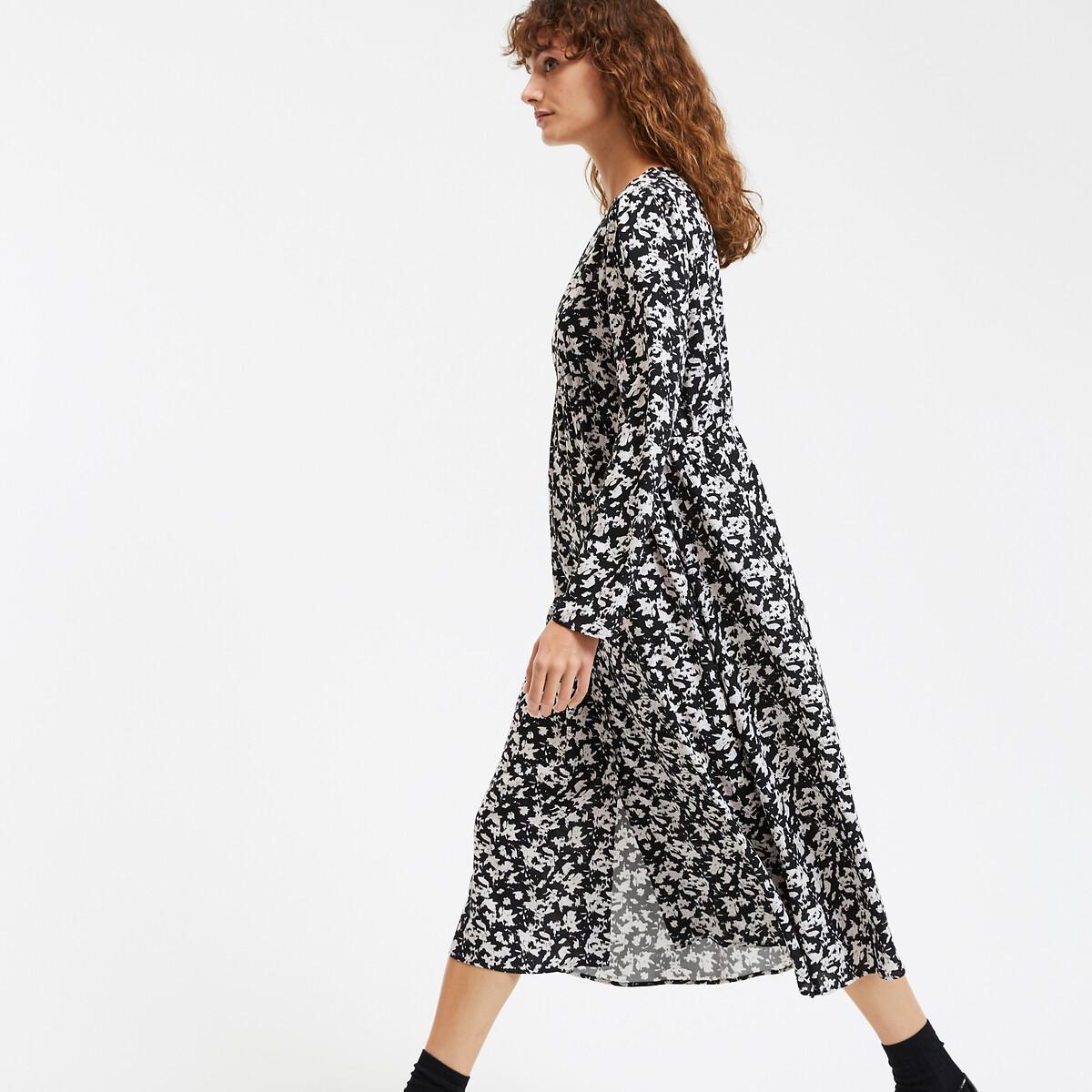 This printed dress features button fastening below the neckline, seaming under the bust, long sleeves and a v-neck. Gathered sleeve caps. Product details • Style: shift • Midi, 3/4 length • Long sleeves • V-neck • Graphic print Fabric content and care advice • 100% viscose • Machine washable at 30°C on a delicate cycle • Iron at a medium temperature • Do not bleach • Do not tumble dry • Do not dry clean • Textile sourced from sustainably managed forests. Lenzing™ Ecovero™ viscose fibres are textile fibres produced from FSC® or PEFC™-certified wood pulp derived from responsibly managed forests. Reforestation is achieved by replanting trees in these forests at a sustainable rate.