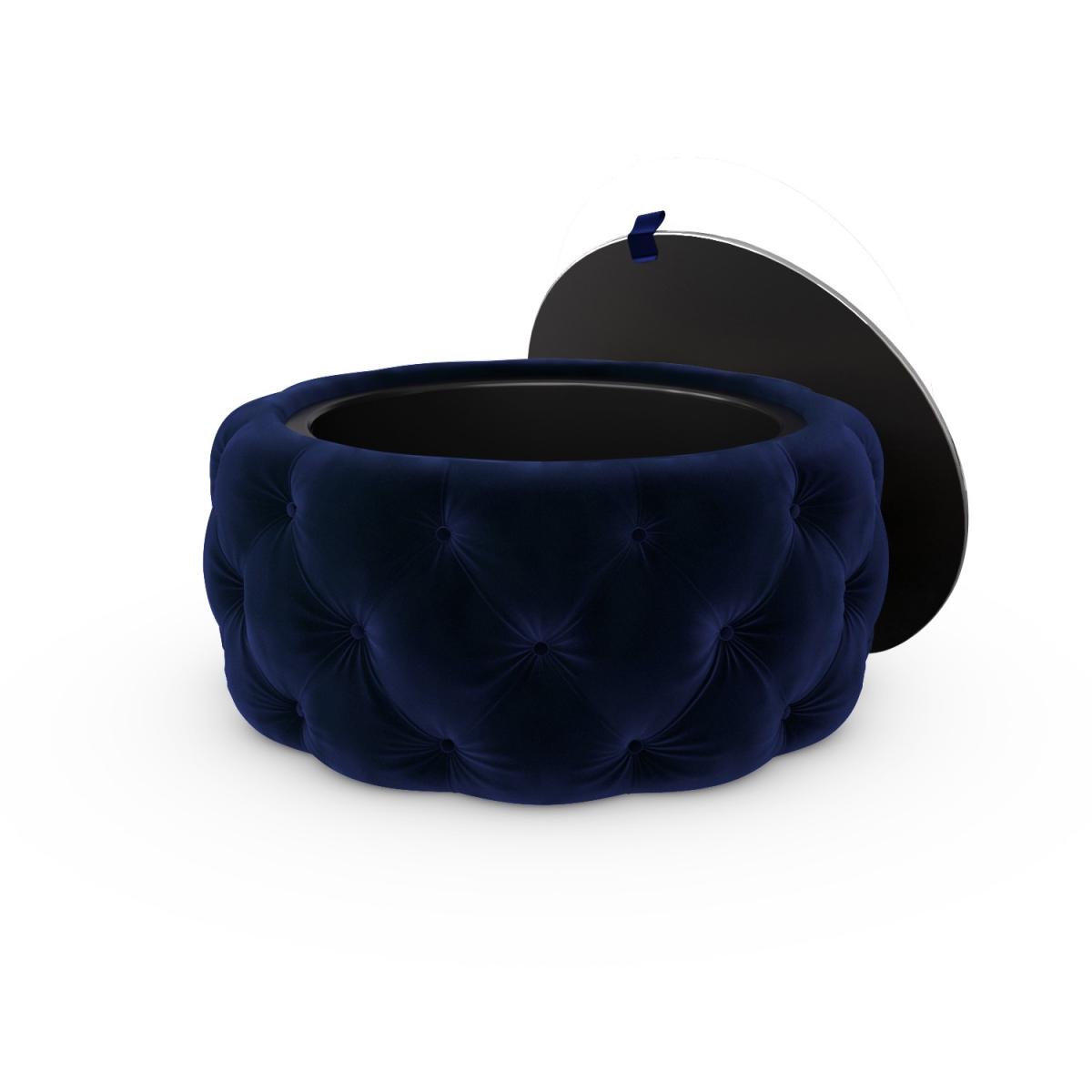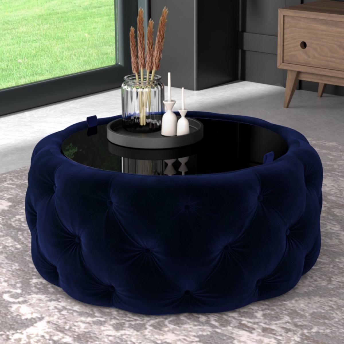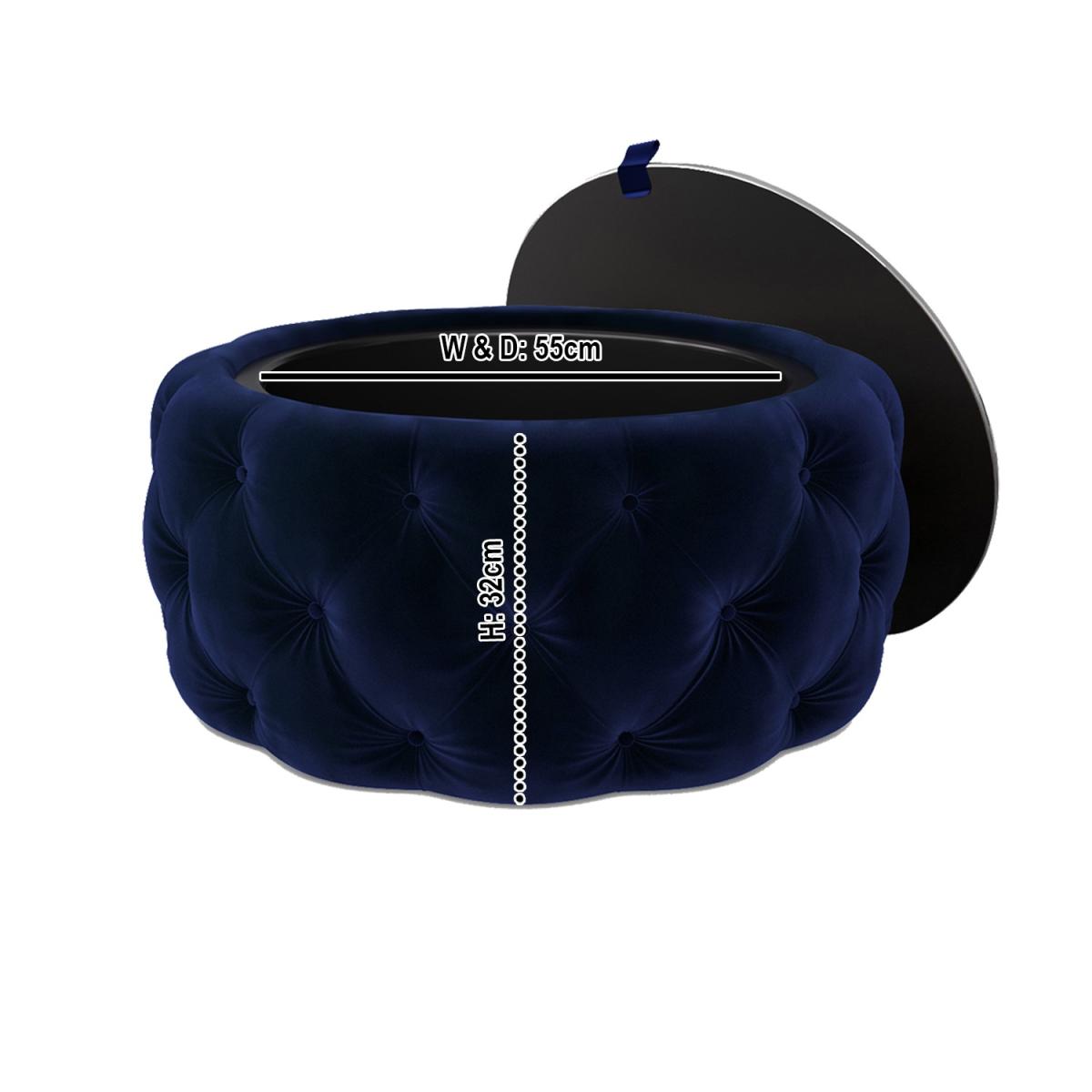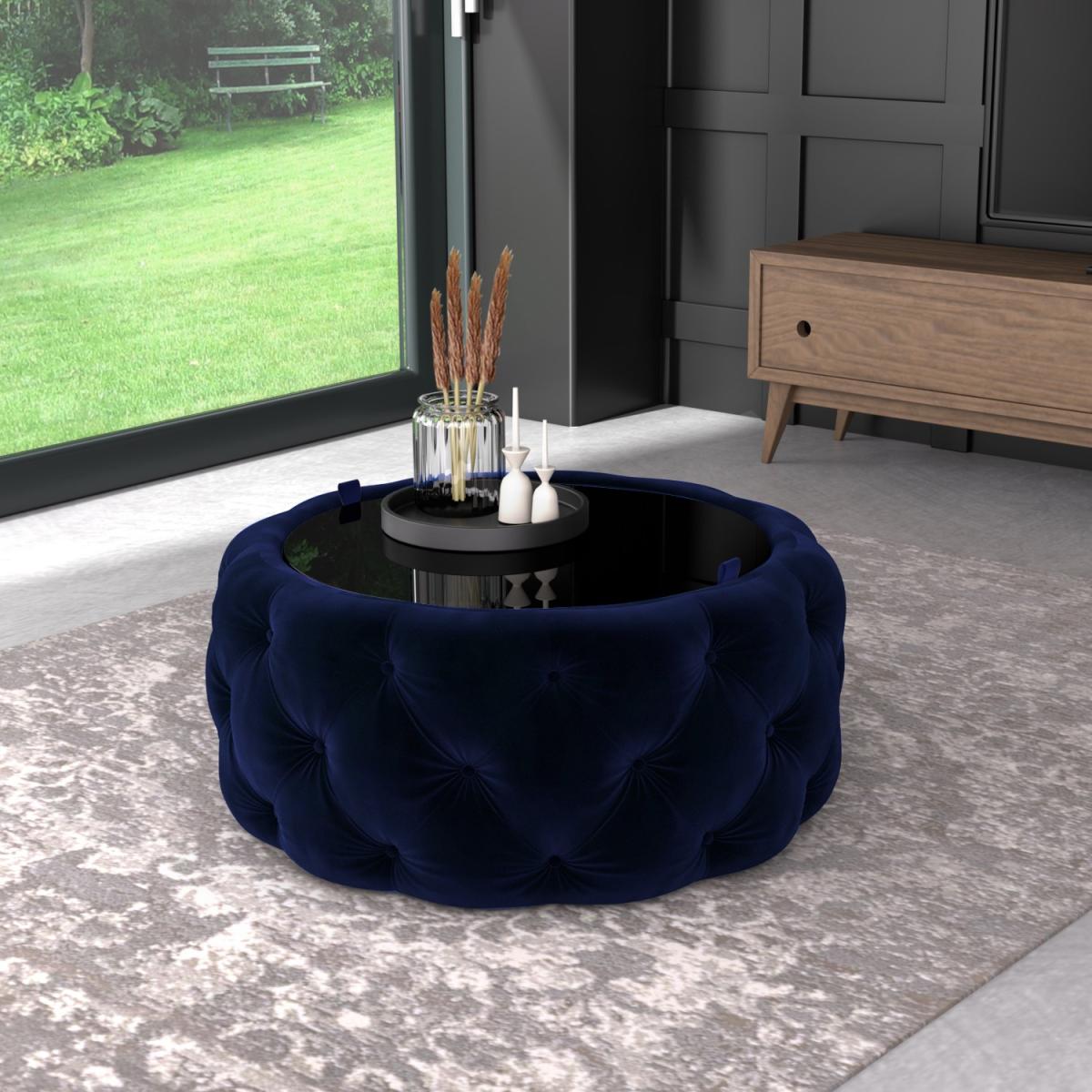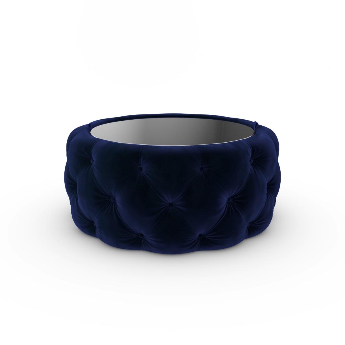 Features we love Round coffee table with mirrored top and storage Deep button detailing suits any room. Mirrored lid lifts to reveal a storage compartment. Rich blue velvet adds a luxurious feel to spaces. Available in other fabrics colours and shapes. Need to know. Dimensions. H41 x W96 x D76 cm Interior dimensions. H33 x W73 x D55 cm Shape. Round Colour. Navy blue Finish. Velvet upholstery and tempered glass top Material. Eucalyptus and plywood frame and velvet polyester fabric Assembly required. No..