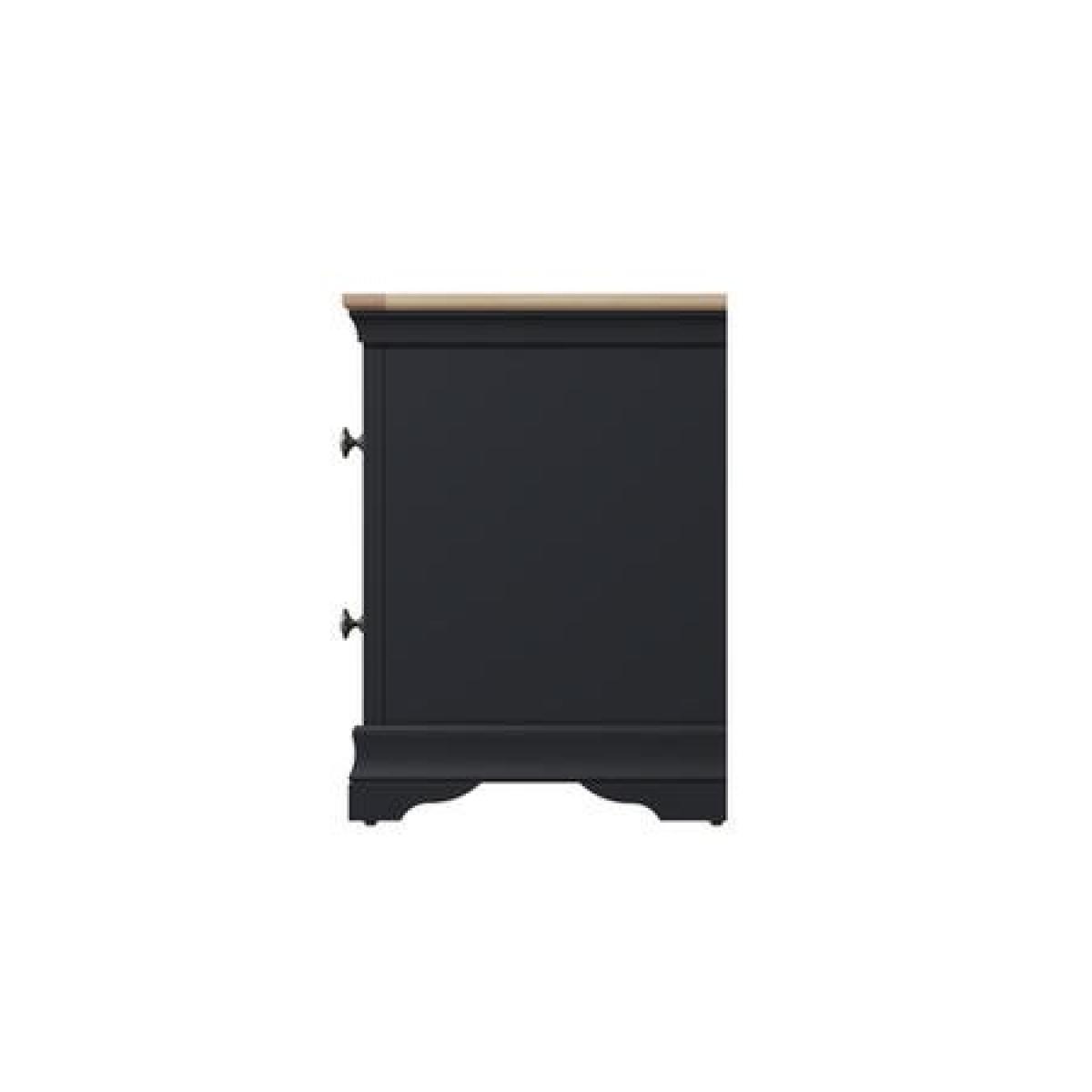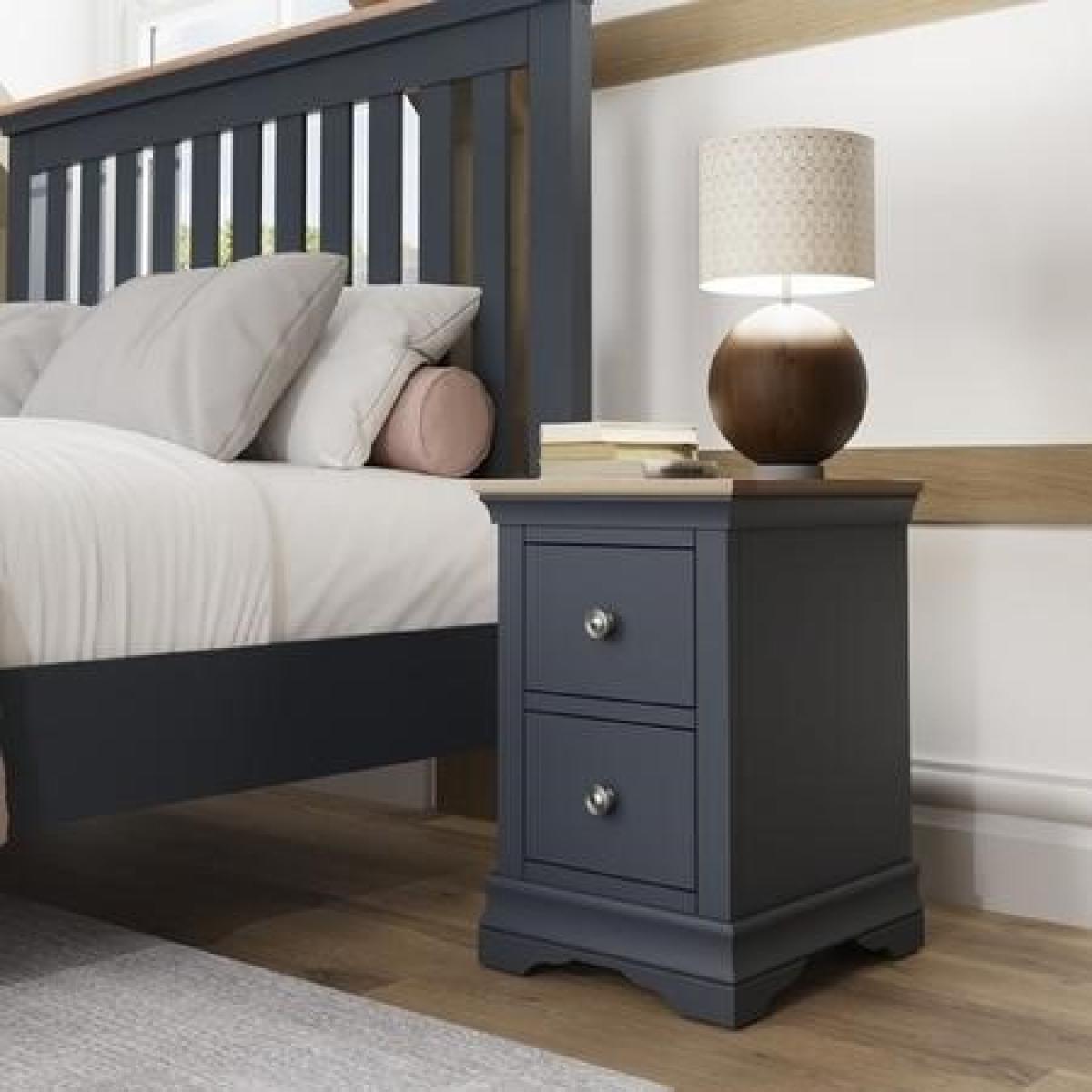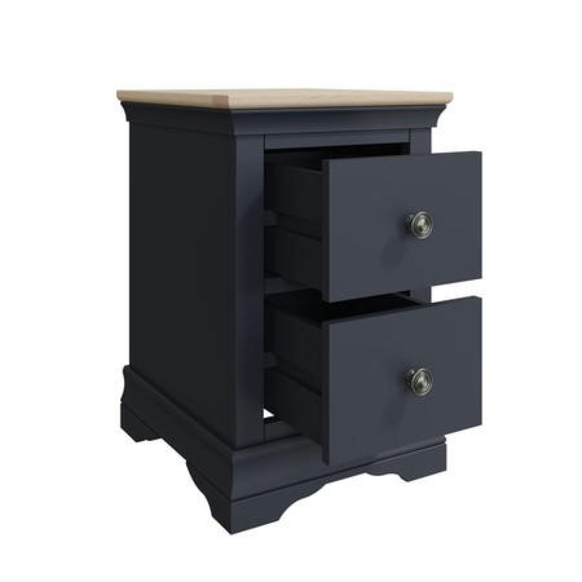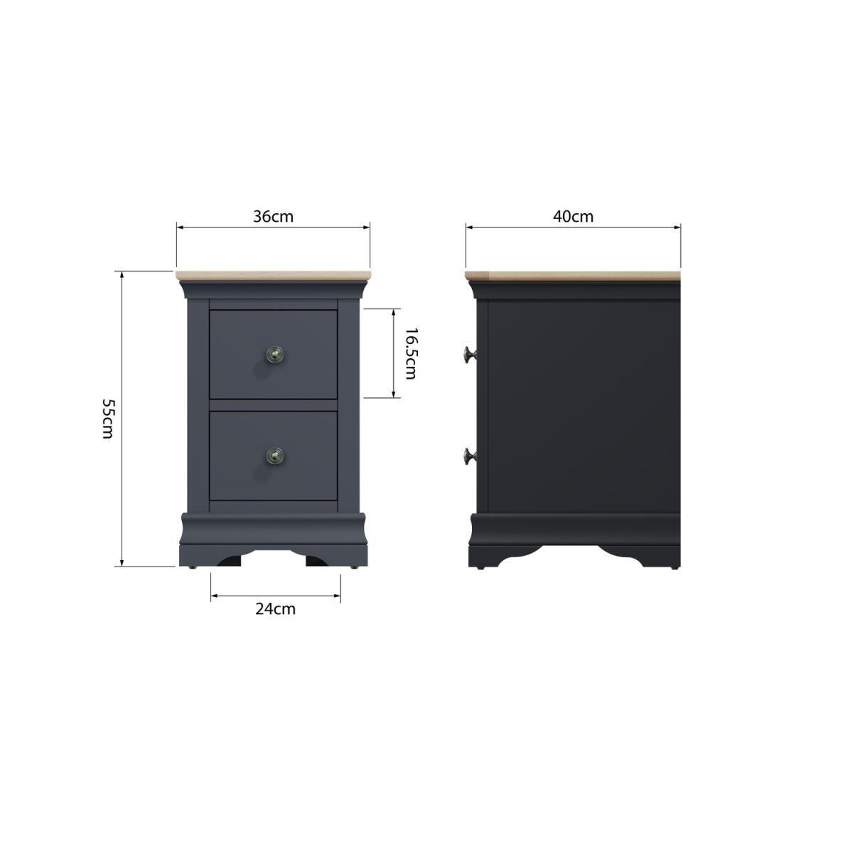 All about me The Midnight Grey Paint and Oak 2 Drawer bedside table perfectly blends contemporary style with classic charm, making it a charming addition to any bedroom. Thoughtful design extends to subtle details, such as the elegantly detailed feet and rounded pewter handles, which enhance the overall aesthetic. Need to know Dimensions:W36 x D40 x H55 cm Weight: 13 kg Colour: Grey Finish: Painted Material:Oak & Painted Assembly required: No Packaging dimensions (1 box): W45 x D42 x H60 cm