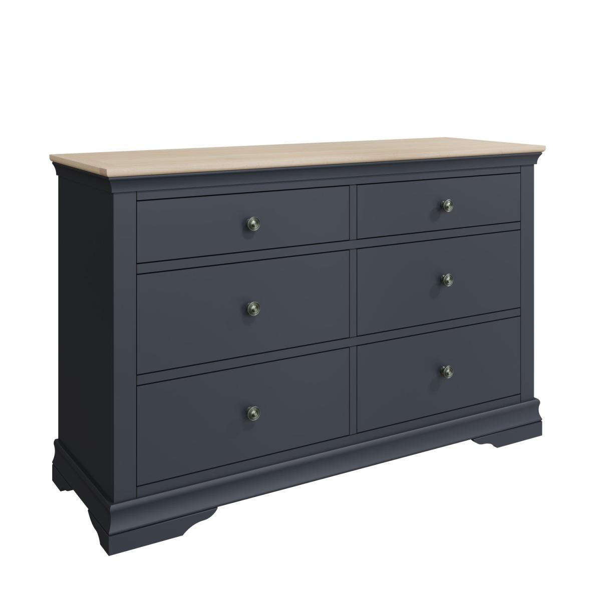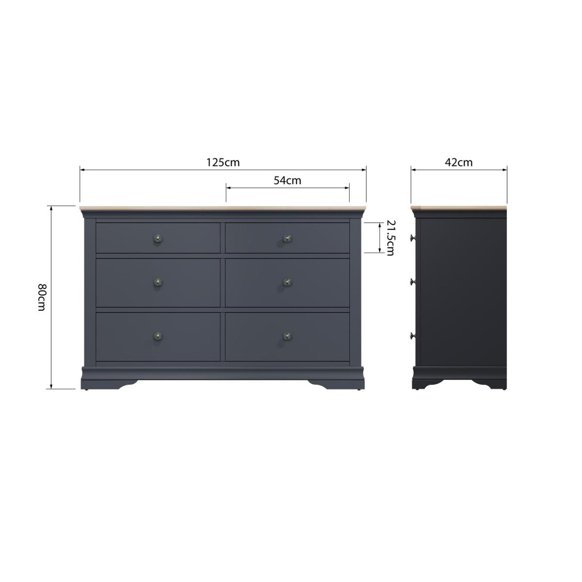 All about me This Midnight Grey Paint and Oak 6 Drawer chest table perfectly blends contemporary style with classic charm, making it a charming addition to any bedroom. Thoughtful design extends to subtle details, such as the elegantly detailed feet and rounded pewter handles, which enhance the overall aesthetic. Need to know Dimensions:W125 x D42 x H80 cm Weight: 49 kg Colour: Grey Finish: Painted Material:Oak & Painted Assembly required: No Packaging dimensions (1 box): W132 x D48 x H86 cm