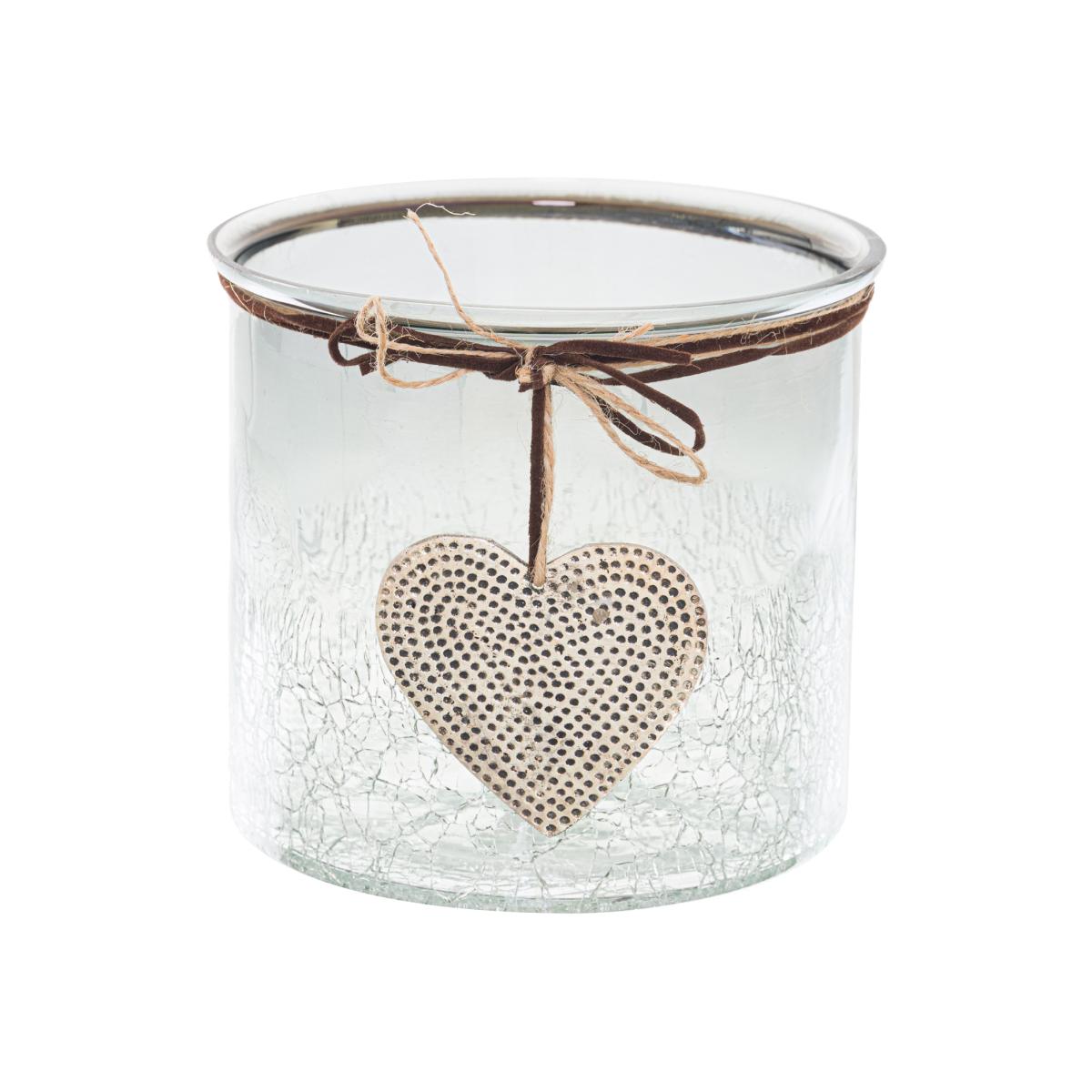A sleek candle holder that could be a vessel for much more, use it for trinkets, fairy lights or for sweets. The grey midnight tones ombre to a transparent crackled glass, a stunning and subtle feature. Not forgetting the hammered effect heart attached by leather look string.