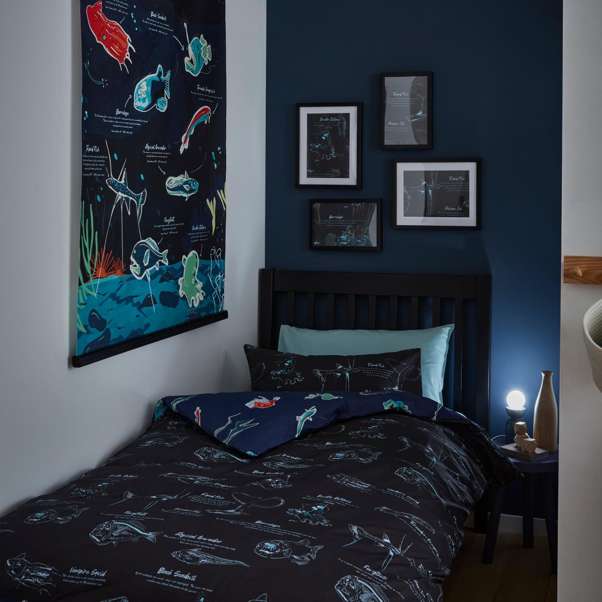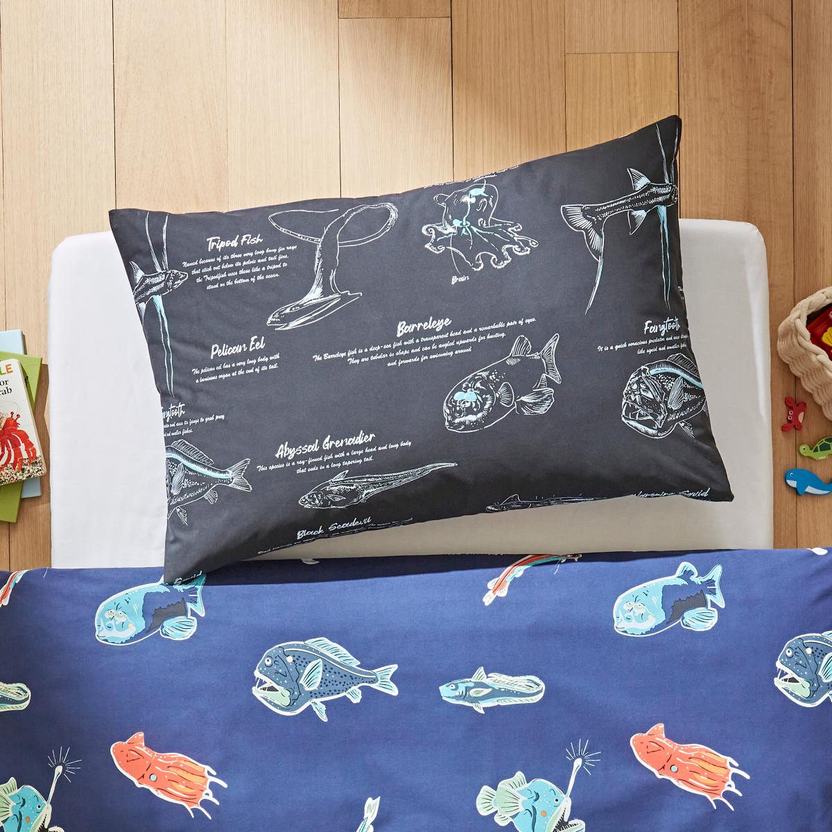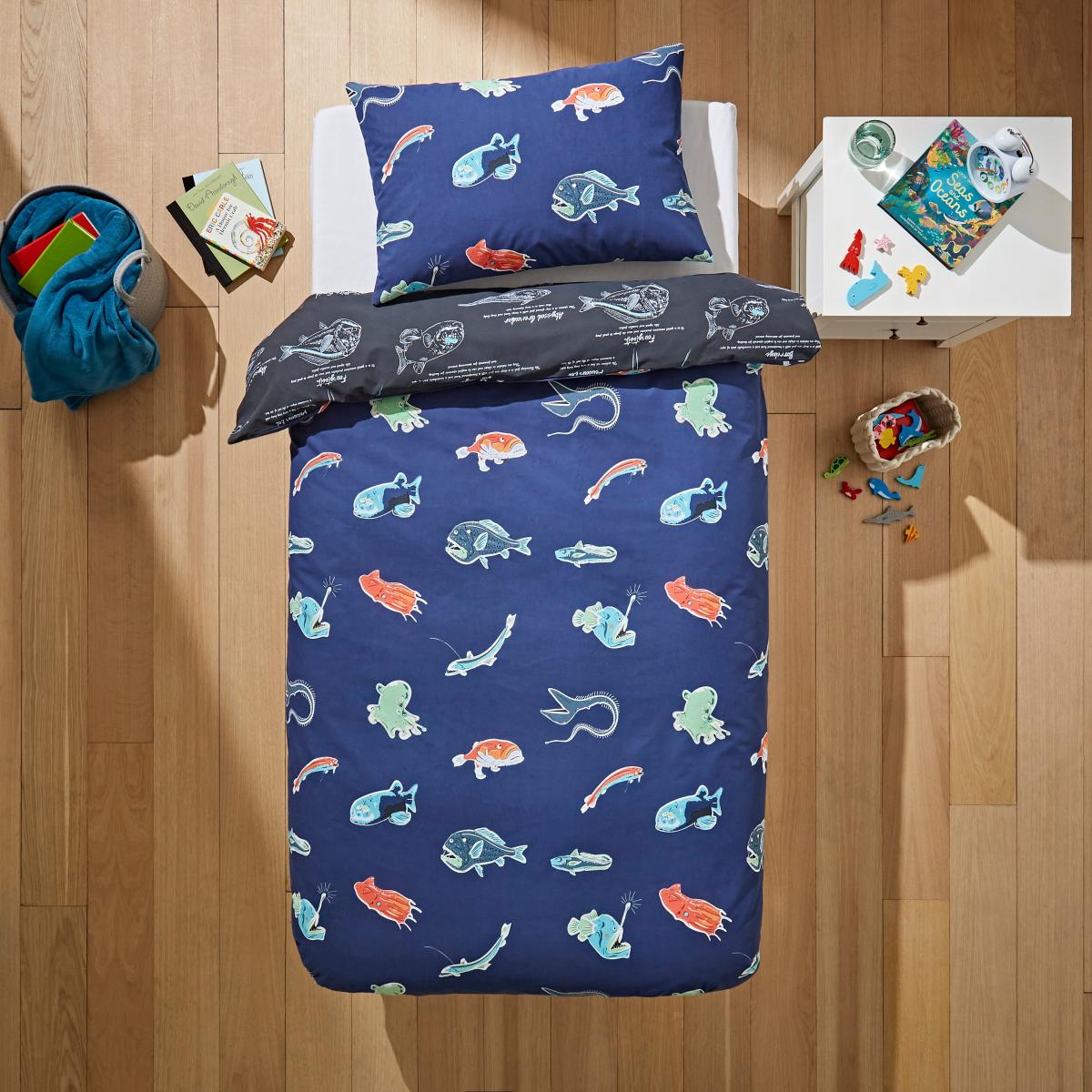 In collaboration with the Natural History Museum Give your little one a bedding of dreams with this super cool Natural History Museum Midnight Zone inspired duvet cover and pillowcase set. This bedding set is cleverly crafted with a reversible design, with a colourful deep sea life design on one side and a fun facts print on the other, so your sea lover can switch their bedding up whenever they desire. Made from soft and cosy polycotton with a 144 thread count, which is easy to machine wash. This duvet cover and pillowcase set comes complete with a standard pillowcase which is also reversible and is finished with a secure button closure for an uninterrupted night sleep. MADE IN GREEN by OEKO-TEX® is a unique product label to trace the countries and production facilities - search the product label for more information. Natural History Museum x Dunelm Did you know that more people have walked on the moon than have been to the deepest part of the ocean? The midnight zone is near the very bottom of the sea. It is called this because no light can penetrate down there. Darkness, crushing pressure and low temperatures are the norm. But even in these extreme conditions, there is life. Animals that live in the deep sea have evolved enhanced senses that help them to find food, search for mates and avoid predators. From the Black seadevil and Tripod fish to the Dumbo octopus and Vampire squid, these incredible creatures have made this unforgiving habitat their home. Very little is known about the behaviour of these species because it is so difficult to study them in their natural environment but with continued exploration of the deep ocean, scientists hope to learn more about these fascinating creatures. © The Trustees of the Natural History Museum, London 2023. All Rights Reserved.