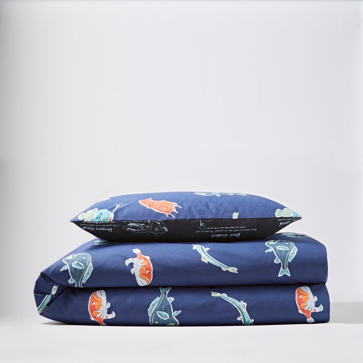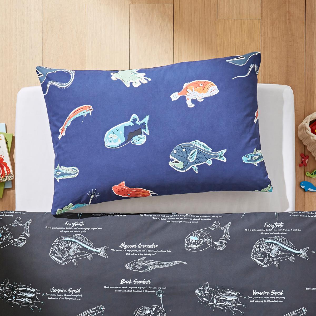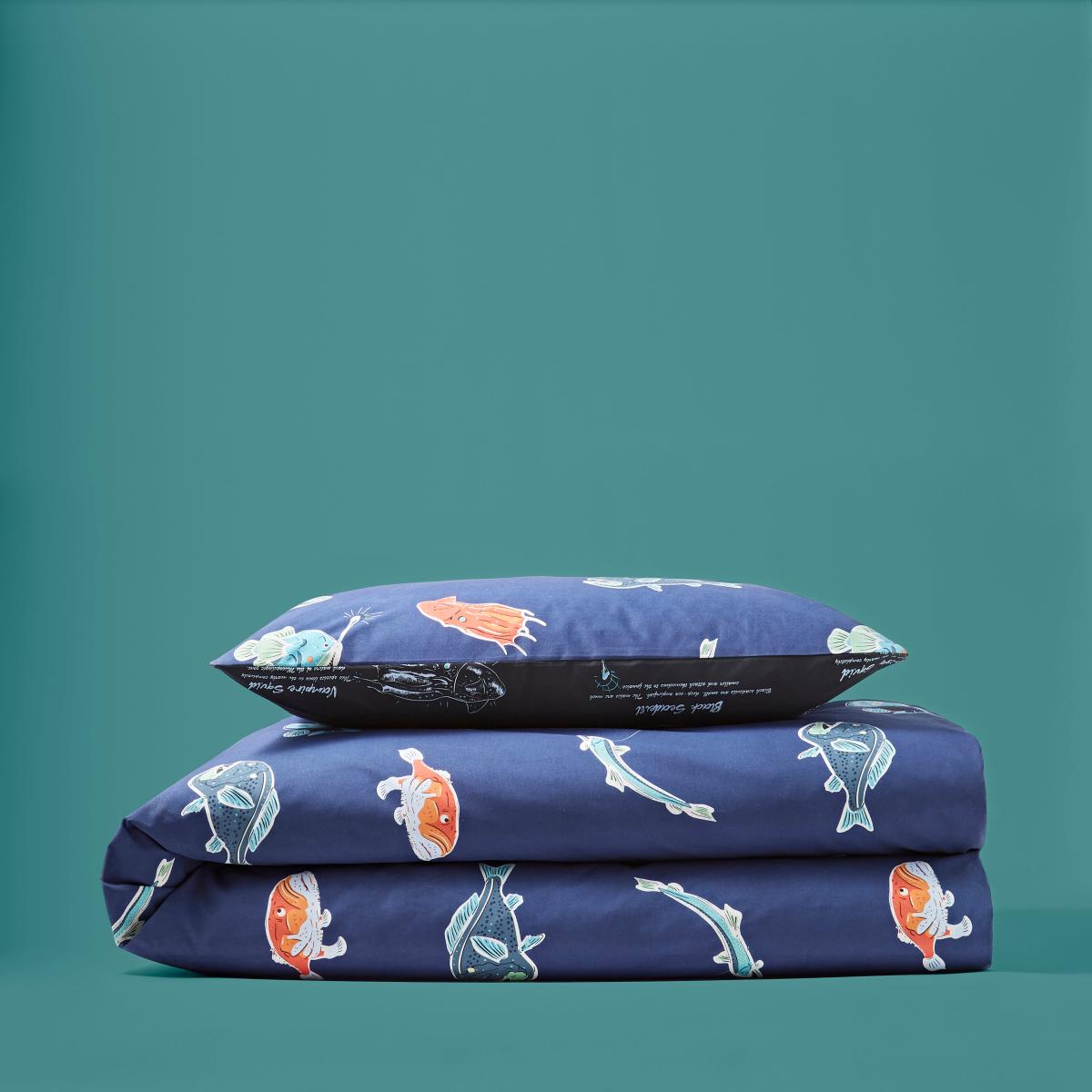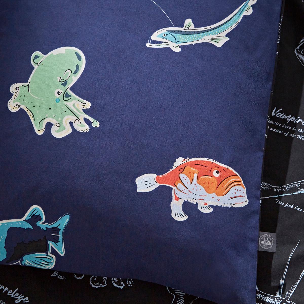 In collaboration with the Natural History Museum Give your little one a bedding of dreams with this super cool Natural History Museum Midnight Zone inspired duvet cover and pillowcase set. This bedding set is cleverly crafted with a reversible design, with a colourful deep sea life design on one side and a fun facts print on the other, so your sea lover can switch their bedding up whenever they desire. Made from soft and cosy polycotton with a 144 thread count, which is easy to machine wash. This duvet cover and pillowcase set comes complete with a standard pillowcase which is also reversible and is finished with a secure button closure for an uninterrupted night sleep. MADE IN GREEN by OEKO-TEX® is a unique product label to trace the countries and production facilities - search the product label for more information. Natural History Museum x Dunelm Did you know that more people have walked on the moon than have been to the deepest part of the ocean? The midnight zone is near the very bottom of the sea. It is called this because no light can penetrate down there. Darkness, crushing pressure and low temperatures are the norm. But even in these extreme conditions, there is life. Animals that live in the deep sea have evolved enhanced senses that help them to find food, search for mates and avoid predators. From the Black seadevil and Tripod fish to the Dumbo octopus and Vampire squid, these incredible creatures have made this unforgiving habitat their home. Very little is known about the behaviour of these species because it is so difficult to study them in their natural environment but with continued exploration of the deep ocean, scientists hope to learn more about these fascinating creatures. © The Trustees of the Natural History Museum, London 2023. All Rights Reserved.