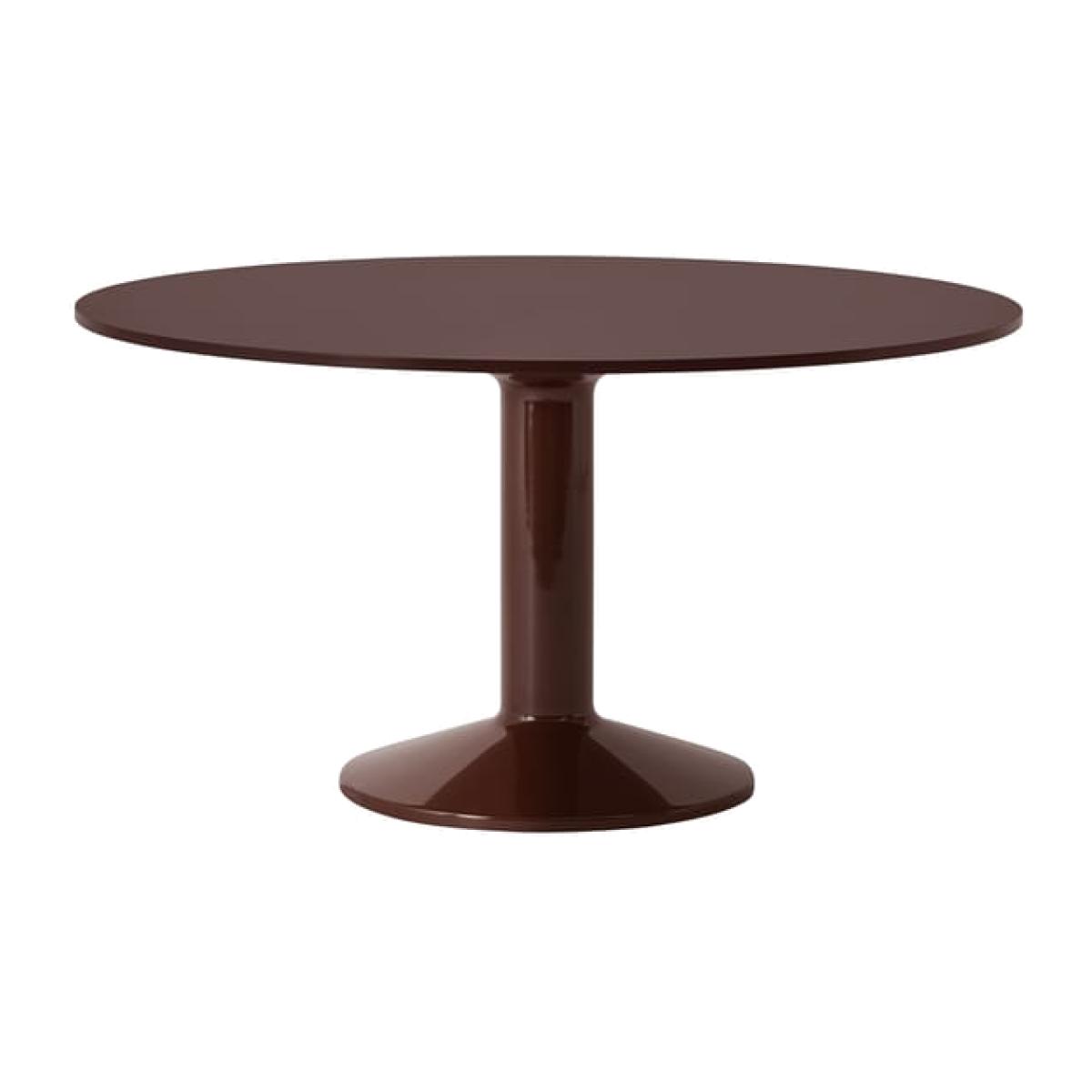 A natural focal point of the home, Midst is a convivial, round dining table where friends and family gather - and there's always room for one more guest! Its refined silhouette is simple yet distinctive, enhanced by distinct details and contrasting materiality. The MDF top is covered with linoleum: matt and silky, this material stands out for its extreme resistance and ease of maintenance. The monolithic Steel Base has a high-gloss finish. TAF Studio designers: ''Midst Table is a meeting of the poetic and the functional. A central gravitational point, its round shape naturally draws us towards its middle, encouraging a meeting of minds and eyes. The form and construction of Midst Table were inspired by an iconic architectural feature: the Column, fusing physical stability with a sense of elegance.'' In detail: Variation : Matt red (linoleum) / Glossy red Base, legs Brand : Muuto Designer : TAF Studio Type : Round table Colour : Tray:Deep red, matt finish (linoleum) / Base, legs: Deep red, high-gloss finish Material :Tray in MDF with linoleum finish (silky-matt appearance) - Base: powder-coated steel (high-gloss finish) - Rubber protection ring under the base. Dimensions :Ø 140 x H 73.5 cm Weight : 182.6 lb Characteristics : Linoleum Tray: silky matte finish, extreme resistance, easy care Show less