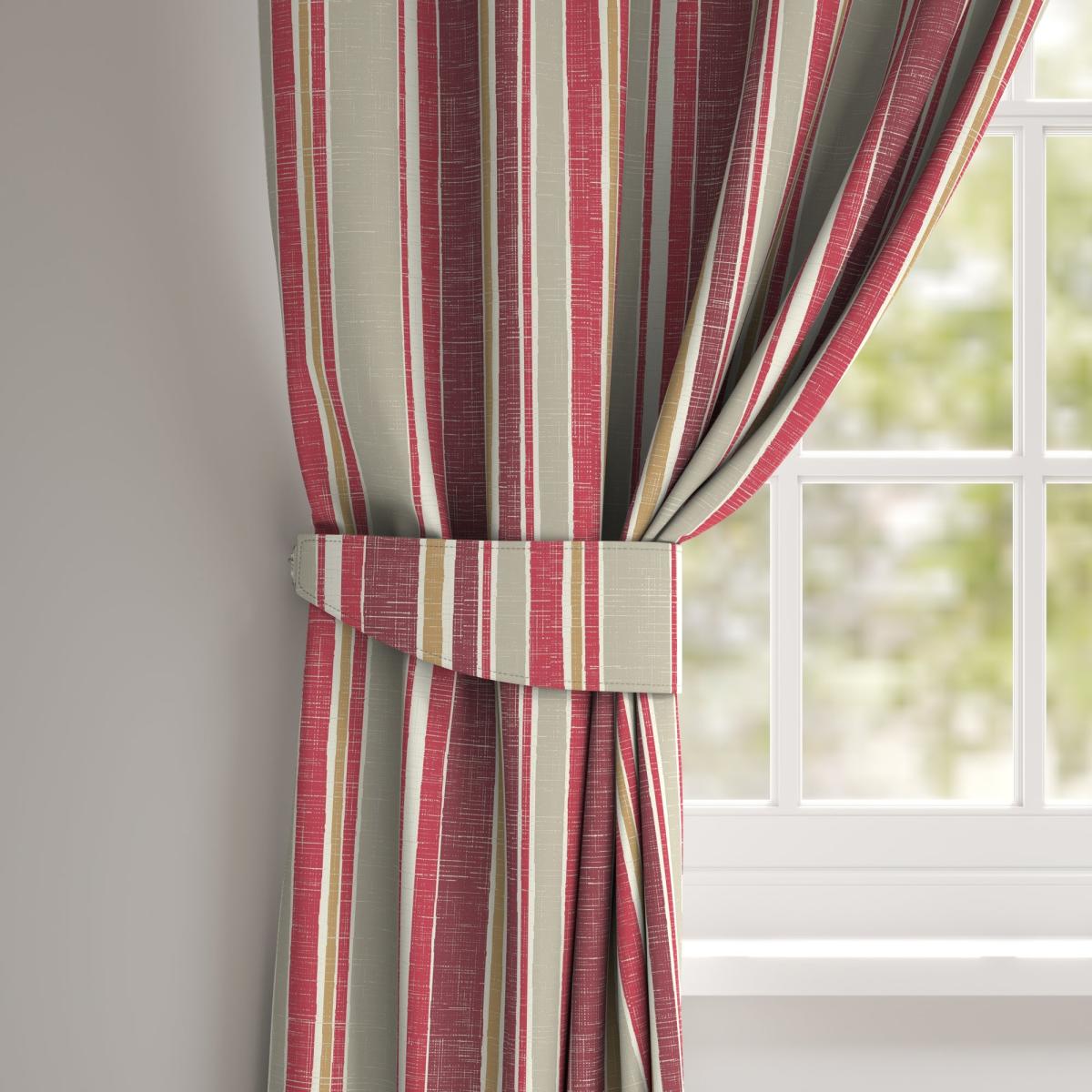 Revitalise your curtains with the inviting charm of our Midsummer Pattern Made to Order Tiebacks. Meticulously crafted from fire-retardant fabric, these tiebacks seamlessly blend safety and style, ensuring your curtains achieve a neat and polished appearance. Individually sold, each tieback offers the option of a sleek plain or an elegant piped edge, allowing you to customise the look to suit your preferences. The versatile striped pattern introduces warmth and colour to any room setting with its textured stripe. The warm and natural palette effortlessly complements various room decors, adding a wonderful splash of design that brings a modern touch to any space. Suitable for both residential and commercial use, these tiebacks are proudly made in the UK, bringing unparalleled quality and sophistication to your window treatments. Available in both a plain and piped design, this tieback can be paired with our matching Made to Measure Curtain to give your home, office or commercial space a beautifully co-ordinated finish. Book an appointment with one of our expert consultants who will guide you through the process of creating your very own Made to Order Tieback. *If you are unsure on testing requirements for your chosen environment, check with a qualified fire officer what testing is required & that this meets your needs.