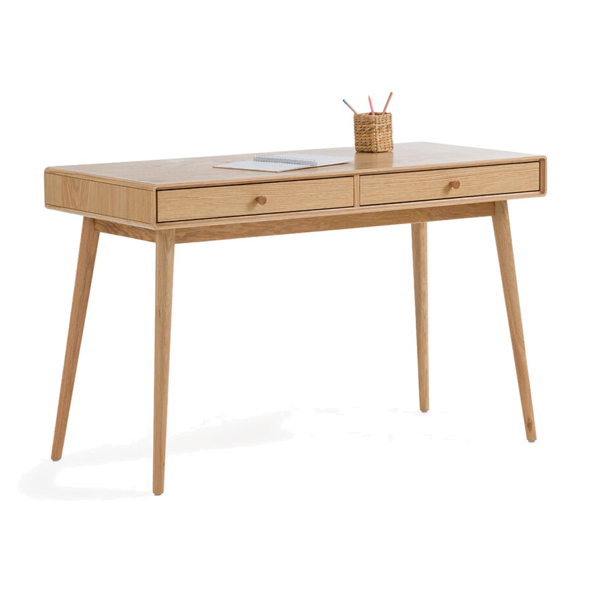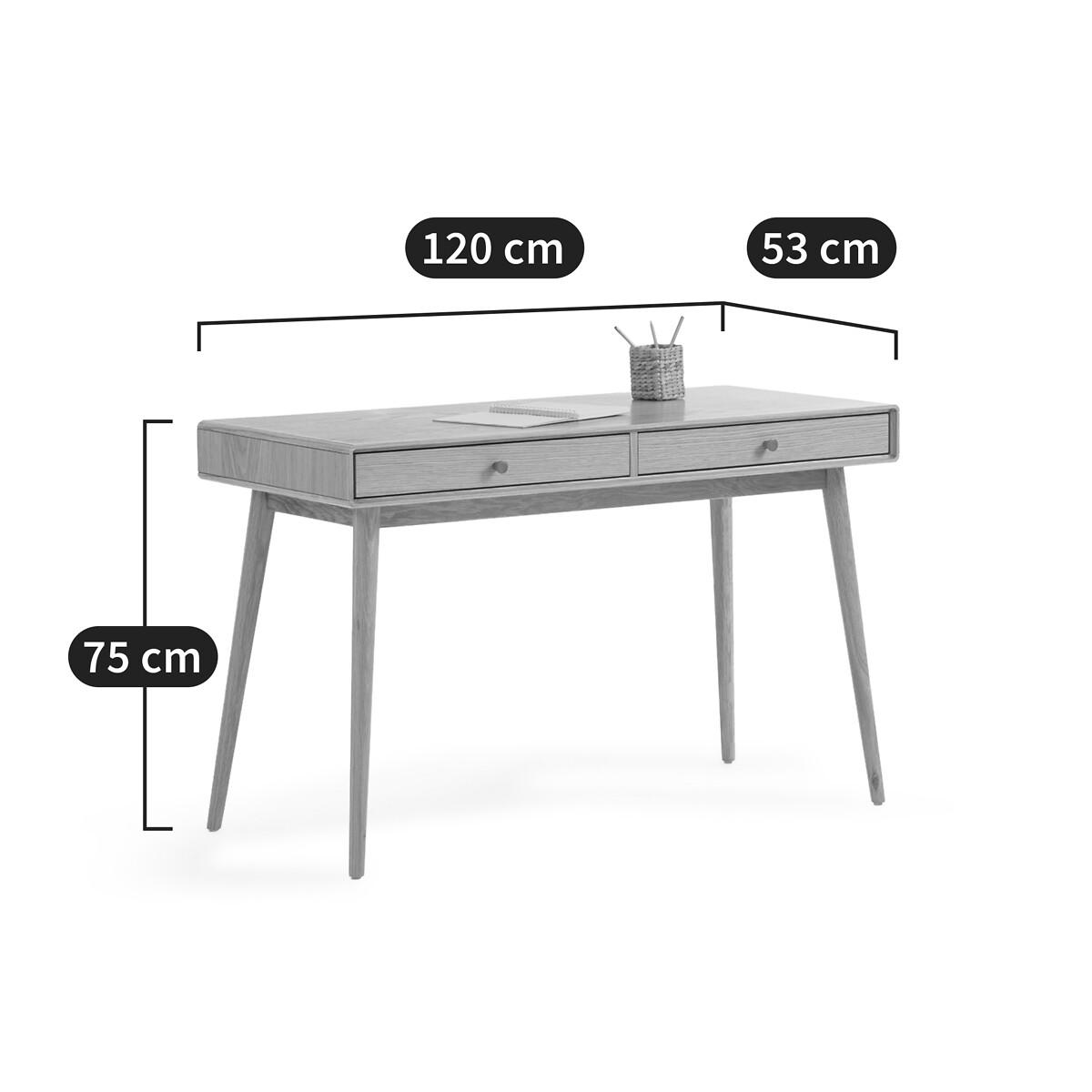 Make way for Scandinavian style with the Miji desk. Very practical thanks to its 2 drawers. An exclusive by La Redoute Interiors. Product Details • 2 drawer unit in oak veneered MDF, FSC® certified • Legs and handles in solid oak, FSC® certified • Nitrocellulose varnish finishDimensions. Overall • Width: 120cm • Height: 75cm • Depth: 53cm • Weight: 25kg. Usable space • Drawer: L54.5 x H6 x D37.3cm • Height of legs: 64cm • Assembly required. • WOOD FROM SUSTAINABLY MANAGED FORESTS. FSC® certified wood comes from forests that are environmentally, socially and economically well managed. Dimensions and weight of parcel1 parcel • L130 x H20 x D63cm. 29kg.