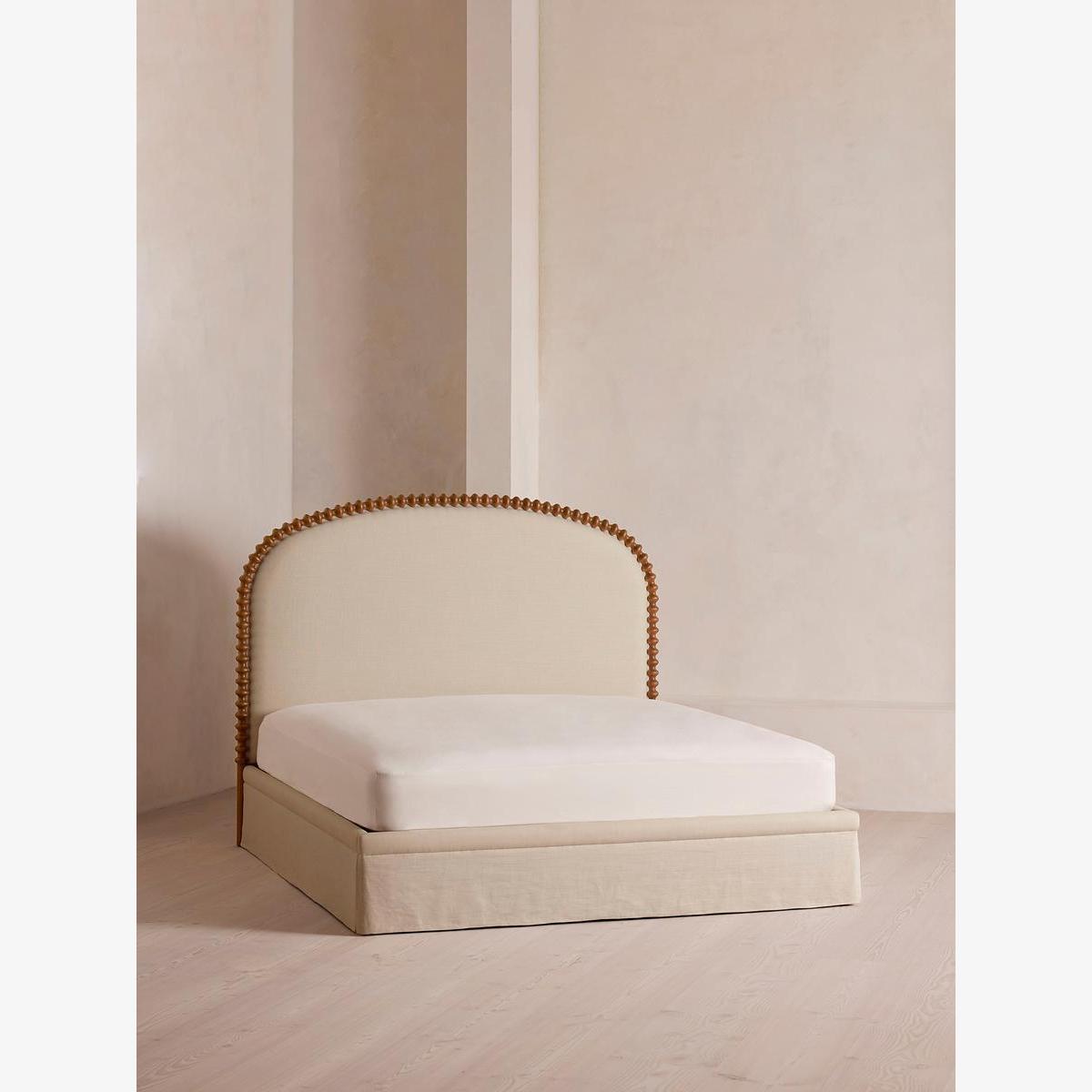 Fully upholstered in natural linen, a curved headboard surrounded by bobbin detailing creates a focal point for your bedroom. Mirroring the styles seen in Soho House Nashville with its curved headboard, the Mika bed is carved from solid turned timber surrounded by intricate bobbin detailing. Fully upholstered in natural linen that comes in our full made-to-order palette, it's trimmed with a matching valance.