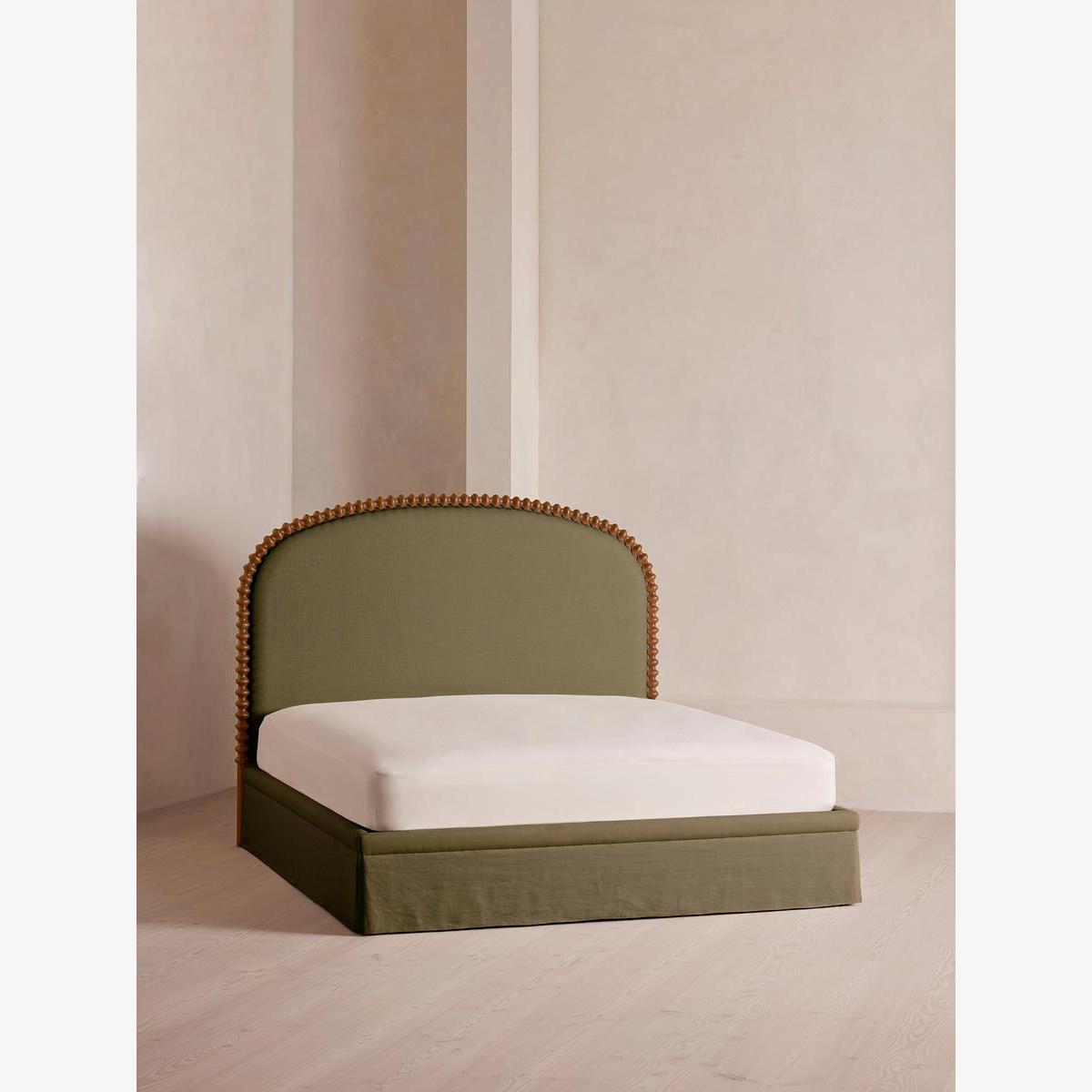 Fully upholstered in natural linen, a curved headboard surrounded by bobbin detailing creates a focal point for your bedroom. Mirroring the styles seen in Soho House Nashville with its curved headboard, the Mika bed is carved from solid turned timber surrounded by intricate bobbin detailing. Fully upholstered in natural linen that comes in our full made-to-order palette, it's trimmed with a matching valance.