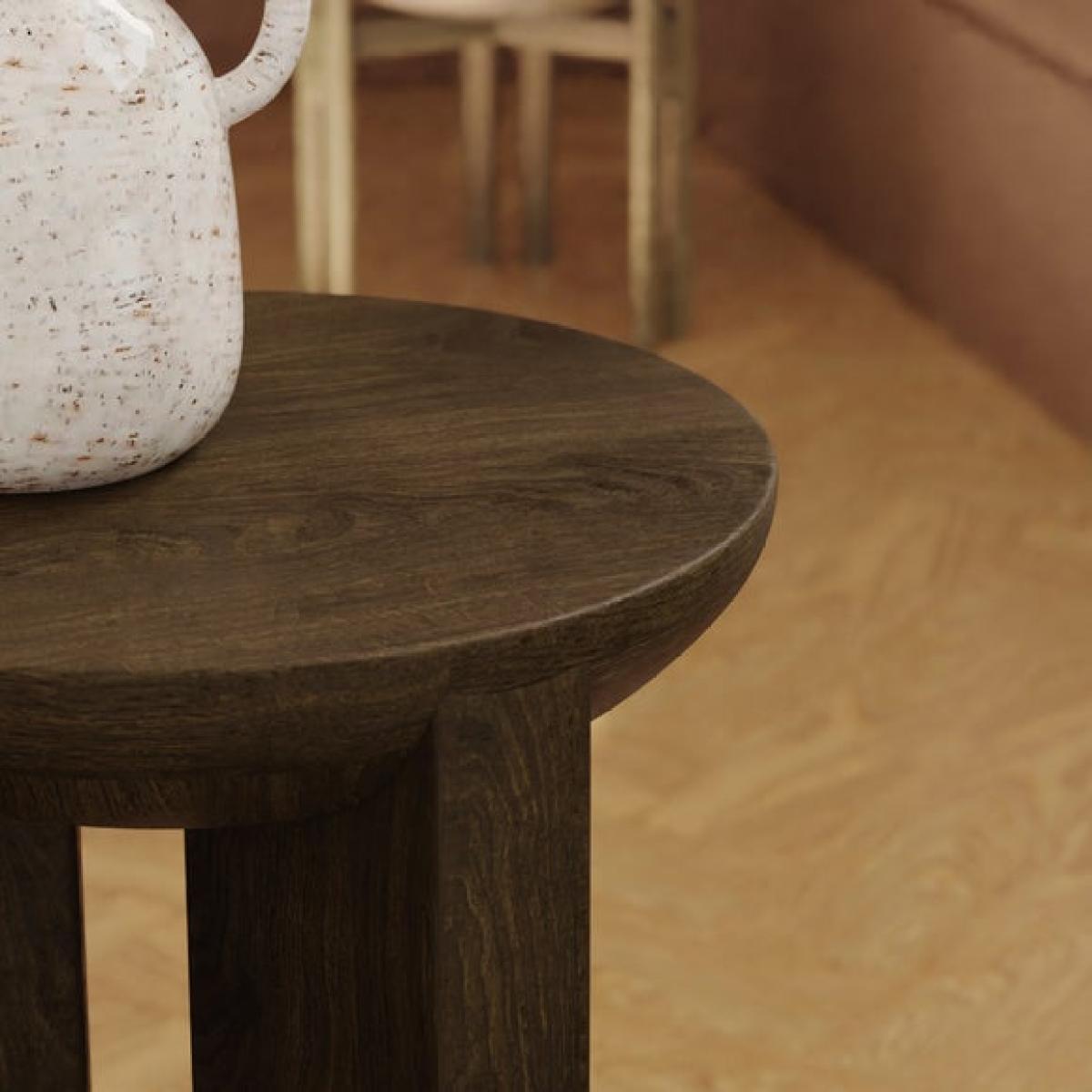 I love this little side table for its contemporary yet versatile design. Its dark wood finish adds warmth and sophistication, making it a great addition to both modern and rustic interiors. It works particularly well in living rooms or cosy reading corners, where it can be styled with a simple lamp, a small tray for essentials, or a decorative object. Its compact size makes it perfect for limited spaces while still providing functionality. To style it effectively, consider pairing it with textured cushions or layered textiles nearby to create a welcoming, layered look. It’s a practical piece that combines form and function seamlessly.
