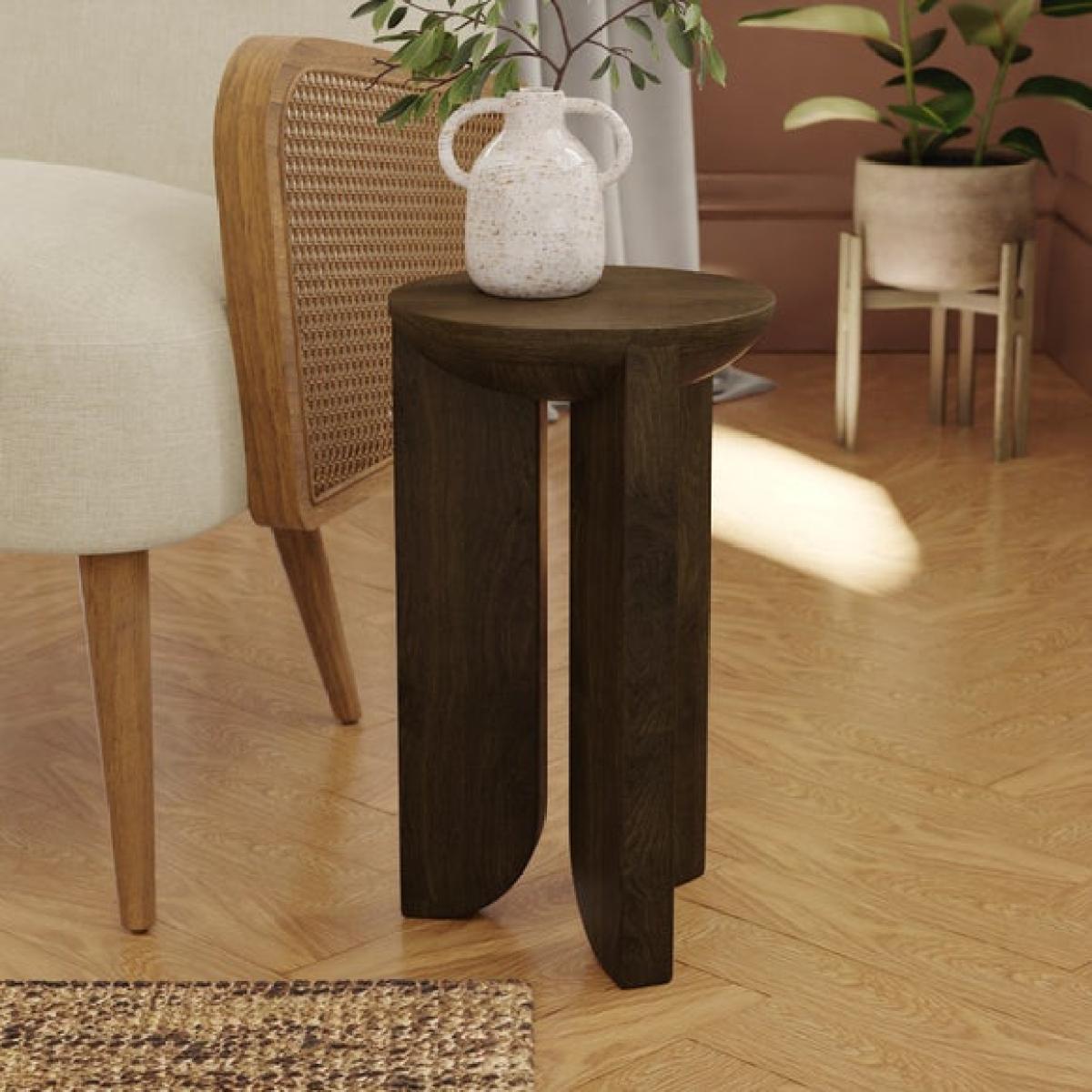 * 100% Mango Wood * Unique shape * No assembly required The Mika side table is crafted from solid mango wood and is available in a variety of finishes including dark mango, whitewash and golden. Designed with a clean, compact and unique silhouette, its a versatile accent piece suitable for a range of interior styles, combining natural texture with timeless appeal.