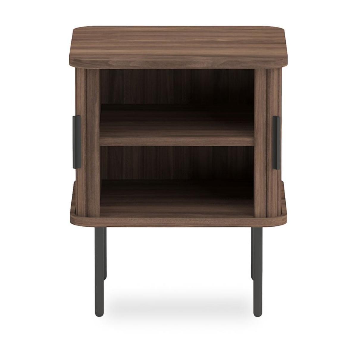 I love this bedside table for its versatile mix of warm walnut and sleek black accents, making it an excellent choice for both contemporary and mid-century styled interiors. Its natural wood grain adds texture and warmth to a bedroom, while the black detailing provides a modern edge. It works well in bedrooms with neutral palettes or those featuring darker tones, and it can be paired with soft textiles or metallic lighting to elevate the overall look. Practically, its compact size makes it ideal for smaller spaces, and the double-door storage keeps essentials neatly tucked away. For styling, consider layering with stackable trays, small plants, or a statement lamp on top to create a balanced and functional bedside vignette.