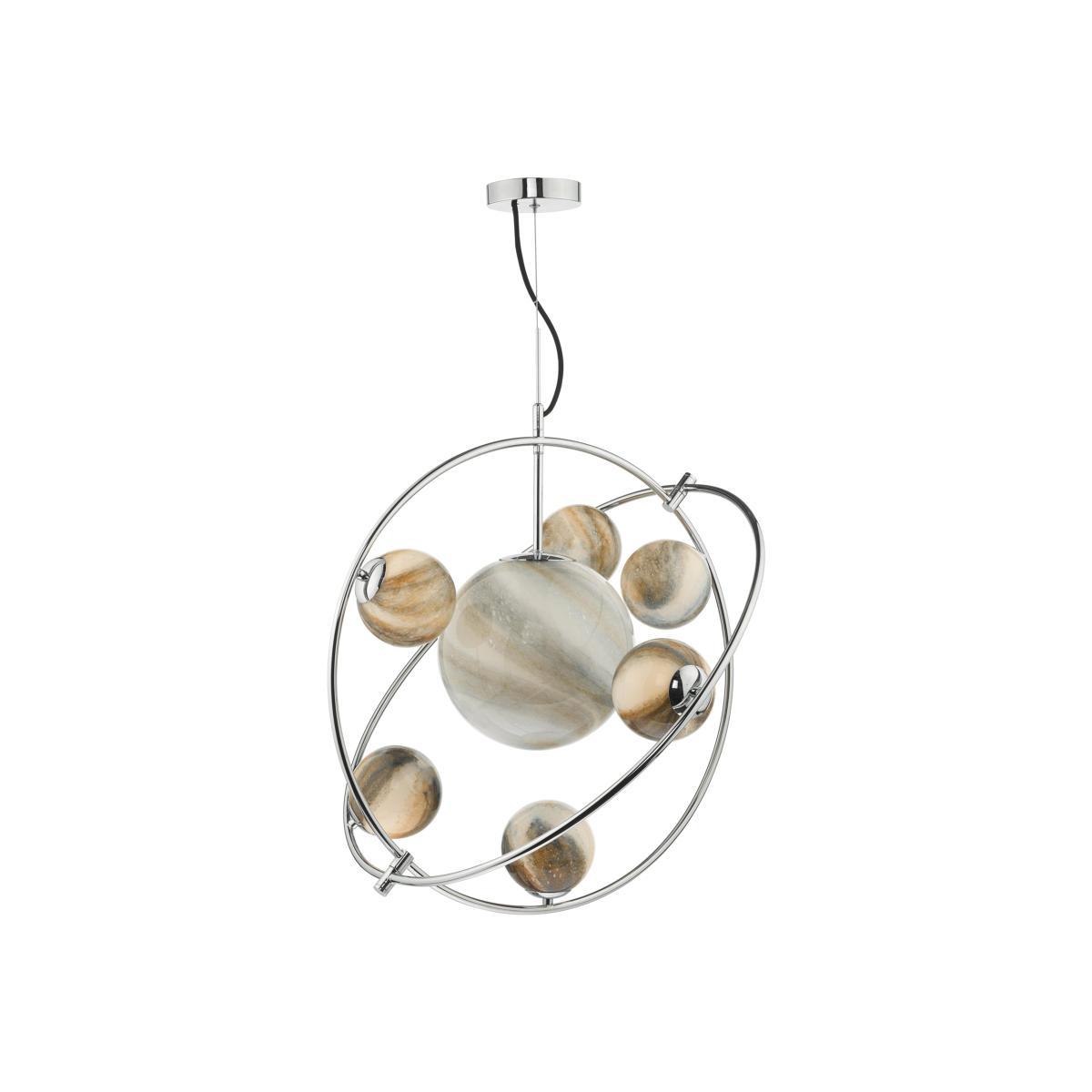 Be inspired by the night sky with the Mikara 7 Light Pendant. Six smaller glass spheres orbit a larger sphere creating a beautiful solar system-type effect. Why you’ll love it. An endlessly eye-catching light that transforms interiors. Ultra-contemporary design inspired by the solar system. Six orange and blue marble-effect glass orbs that look like the surface of a swirling planet. Striking circular chrome frame. Made with care for Furniture Village. What you need to know. Made from polished chrome and glass. Comes with a 1m steel tension cable that can be adjusted at installation. 7 x 5w max G9 or BUL-G9-LED-4 (not included). Dimensions. Width: 60 cm (24 inches). Height: Min. 70 cm – Max. 160 cm (Min. 28 inches – Max. 63 inches).
