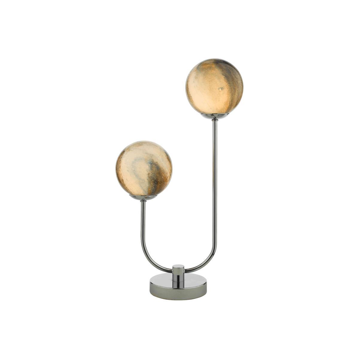The bulbs of this beautiful two-light table lamp are housed within Planet art glass, with colours that are out of this world. A stellar addition to any lounge or bedroom. Why you’ll love it. Avant-garde table lamp. Curved metallic frame and base. Bulbs housed in Planet art glass shades. Cable with inline rocker switch for easy operation. Made with care for Furniture Village. What you need to know. Polished chrome frame. Hand-blown glass shades coloured to mimic planets. 2 x 5W G9 bulbs recommended. Dimensions. Height: 49cm (19.29 in). Depth: 27cm (10.63 in). Width: 12cm (4.72 in).