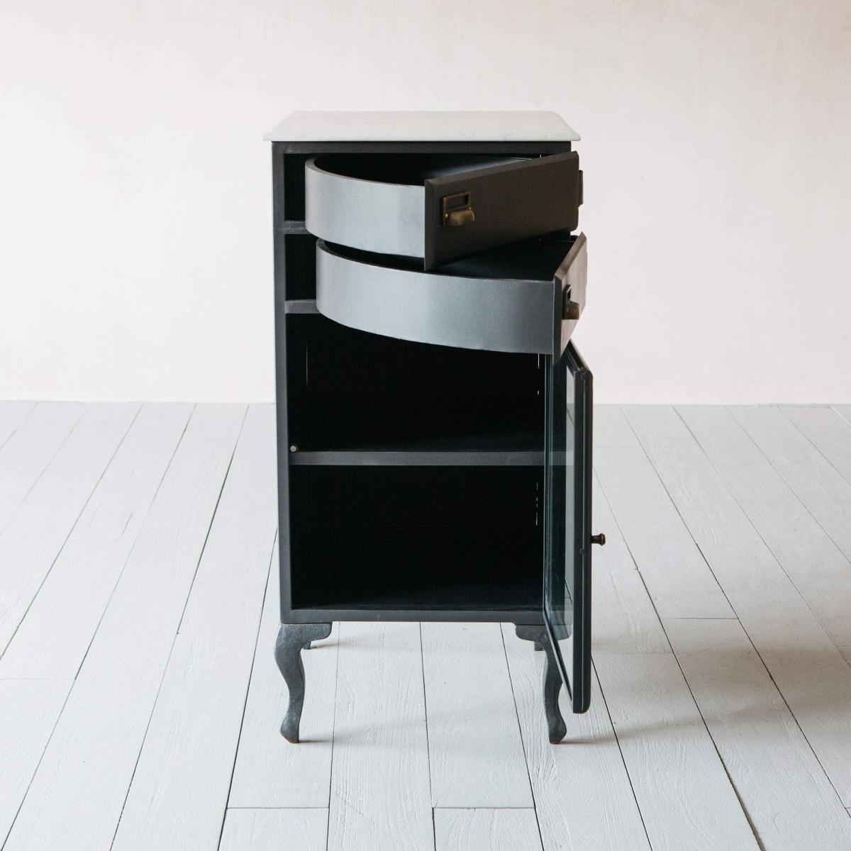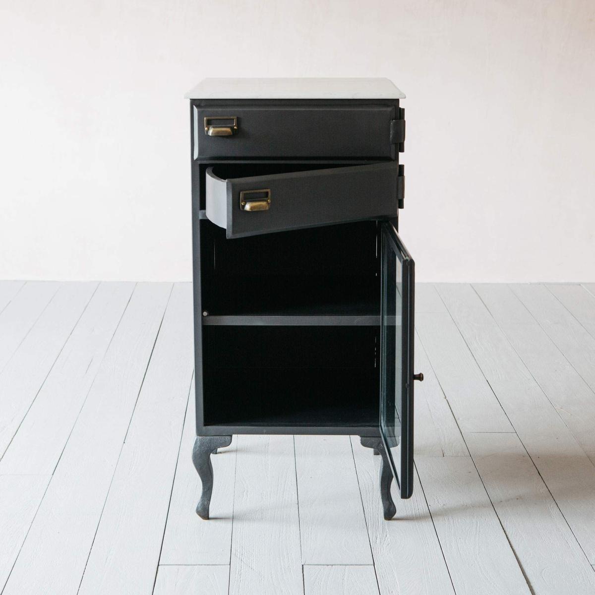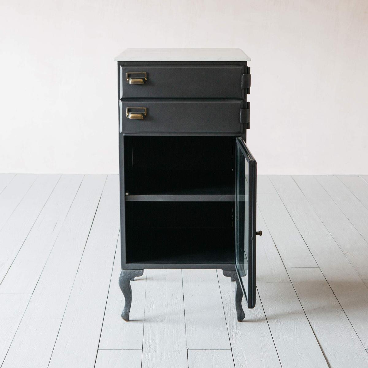 Our contemporary, tall Mikko cabinet is crafted from weighty iron with a polished, white marble top. A blend of rustic and industrial design, this cabinet boasts a solid iron frame, scroll-shaped legs and a glass-fronted cabinet - perfect for displaying items you'd like to find quickly.