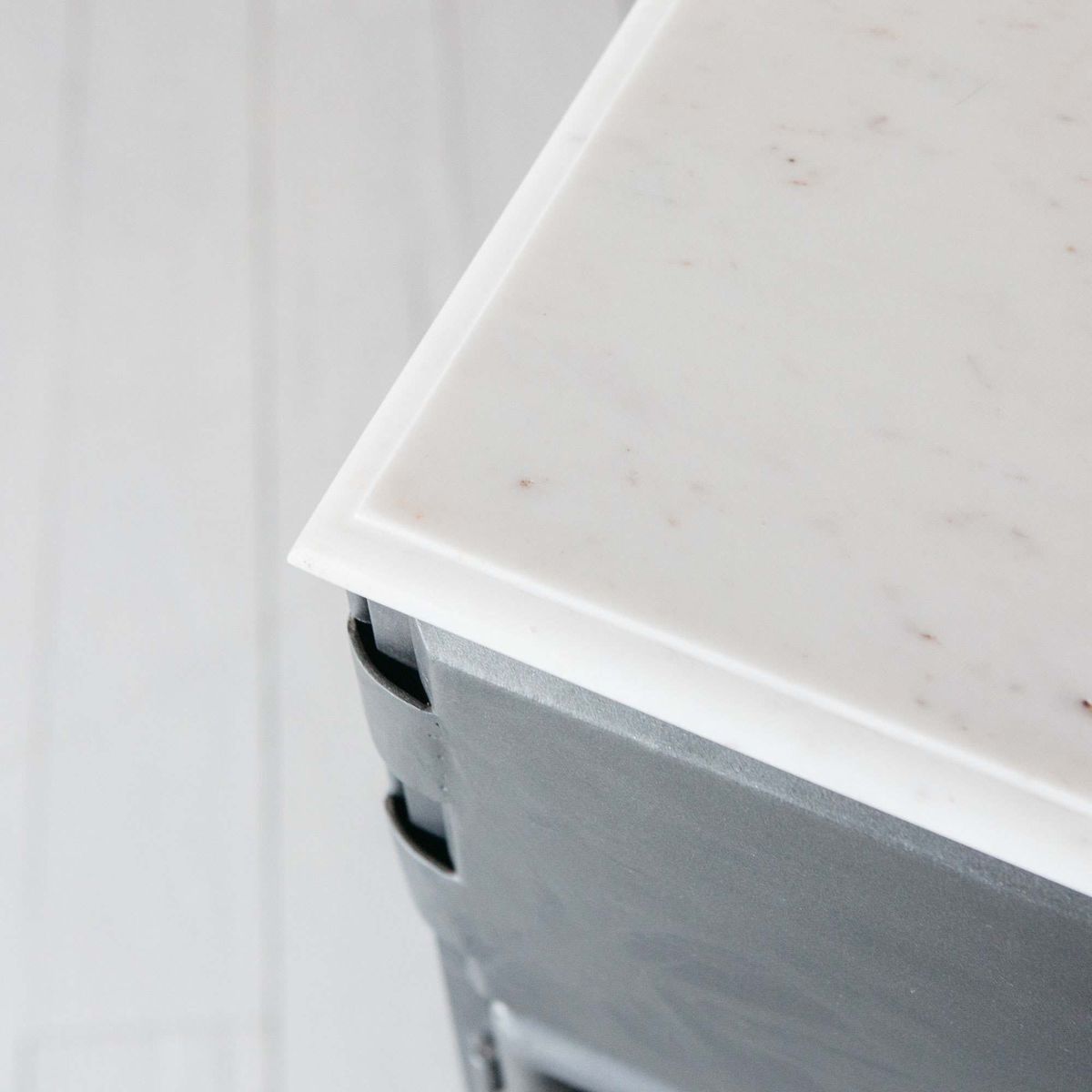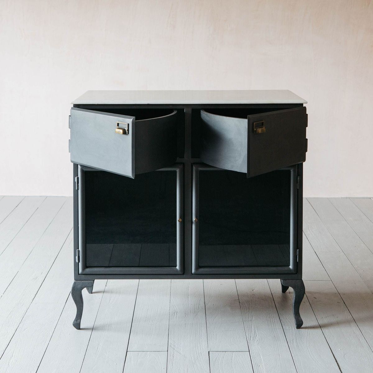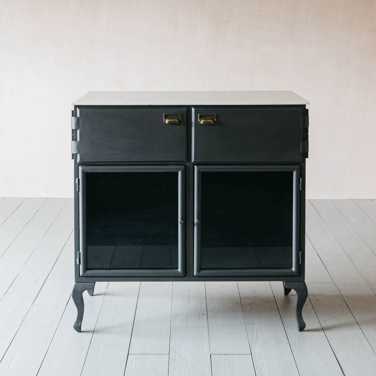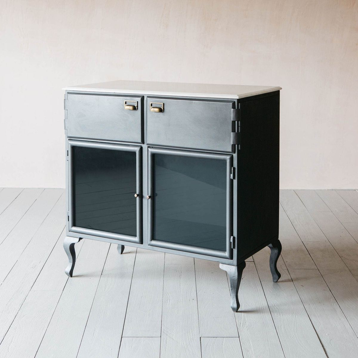 The Mikko two-drawer iron sideboard boasts ample storage space, a durable marble top and glass-panel doors. This sleek design harmoniously combines modern materials with industrial influences.