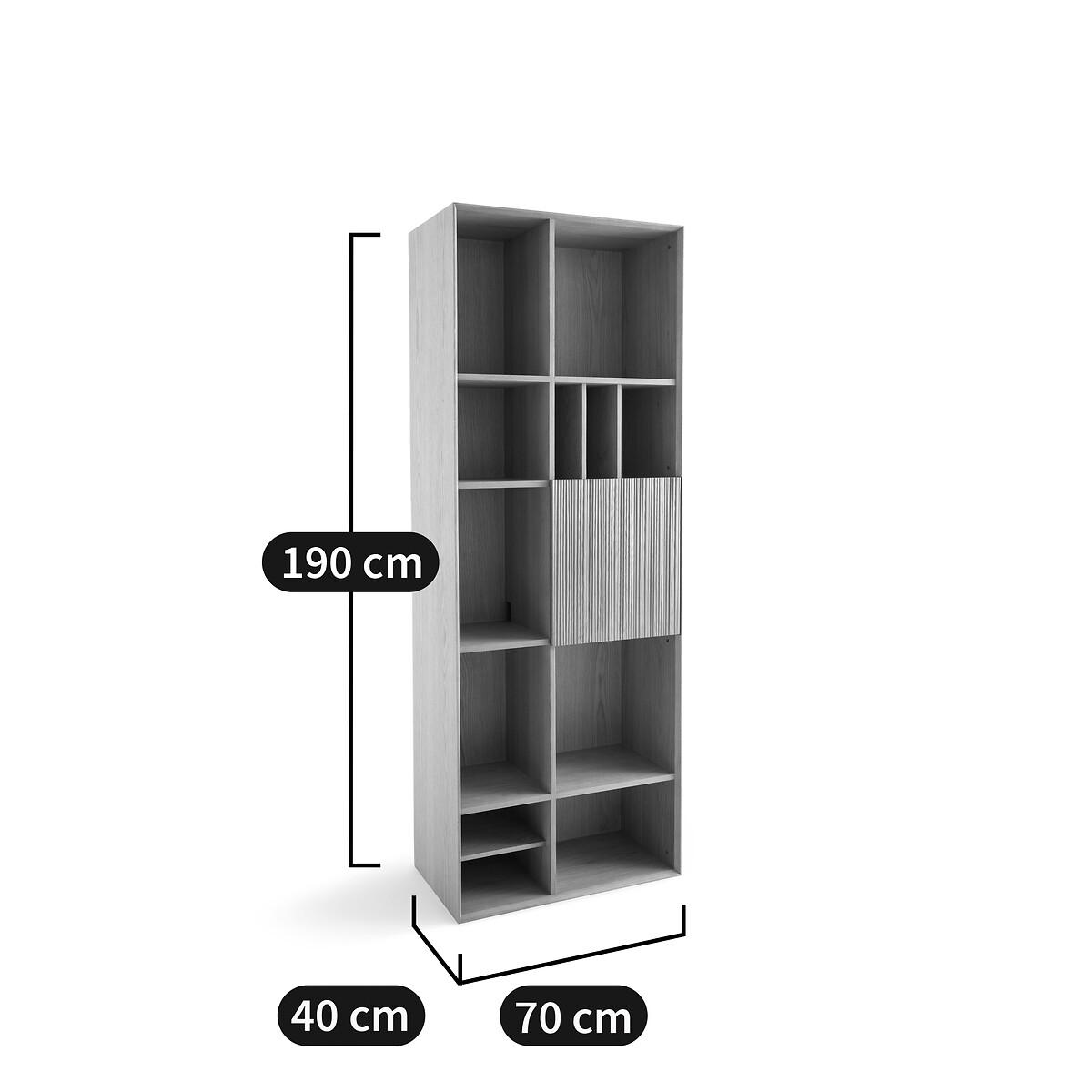 Part of the Mikube modular storage system, the 1-door bookcase is designed to be used alone or with other modules in the range, in order to create, for example, a storage unit or an XXL bookcase. An oak veneered MDF bookcase with several compartments. Its edges have a 45° cut. An AMPM exclusivity designed to adapt to all spaces. Product Details • Cabinet, shelves and base in oak veneered MDF, nitrocellulose finish • 1 door in raised and carved solid oak. The rectilinear relief recalls the sculptural effect worked with a gouge, a traditional tool of cabinetmakers.. • Mixed FSC® certified wood • Nitrocellulose varnish finish • 9 compartments including 1 equipped with vertical partitions + 1 equipped with 1 shelf • Door with push/pull opening system • Cable passes • Wall mounting recommended (screws and plugs not included)Quality Info • German brand hardware: reliable, discreet and functional. These accessories ensure the longevity of your product. • Push/pull opening system: light pressure on the door allows it to be opened or closed without a handle. Dimensions Overall • Width: 70cm • Height: 190cm • Depth: 40cm. Usable space • Left column compartments: L26 x H41-26-12 x D33cm • Right column compartments: L38 x H41-26 x D33cm • Small vertical right column compartments: L10-10-16cmDelivery:. Sold pre-assembled. Available for home delivery. Note! Please ensure all passageways and doorways are wide enough. • WOOD FROM MORE SUSTAINABLY MANAGED FORESTS AND CONTROLLED SOURCES. FSC® Mix wood contains at least 70% FSC® certified and/or recycled wood, the remainder being FSC® controlled wood. Dimensions and weight of parcel1 parcel • L201 x H79 x D50cm, 69kg