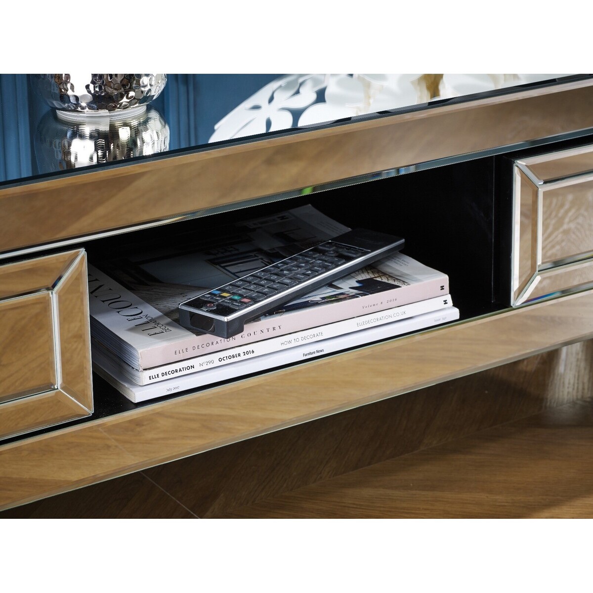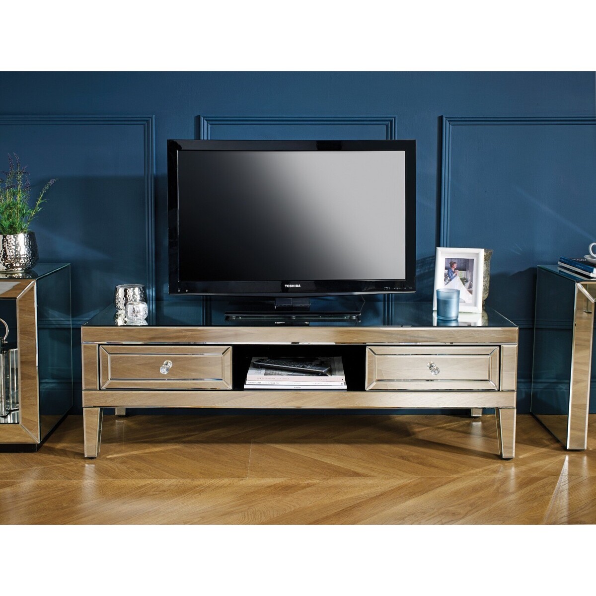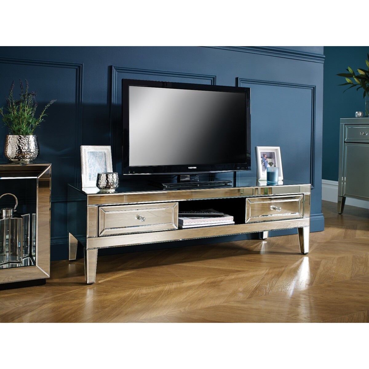 A beautiful high shine mirror finish and ornate paneling are the highlights of the Mila TV cabinet table which features two drawers, a shelf and a large surface space. Hide remotes in the spacious drawers and the shelf is the ideal spot for a set top box. The whole Mila collection is designed with luxury living in mind and each piece is made from hard-wearing MDF meaning it's built to last. Elegant mock crystal handles. Two drawers, ideal for storing remotes and games. Pre-assembled. High shine mirrored finish.