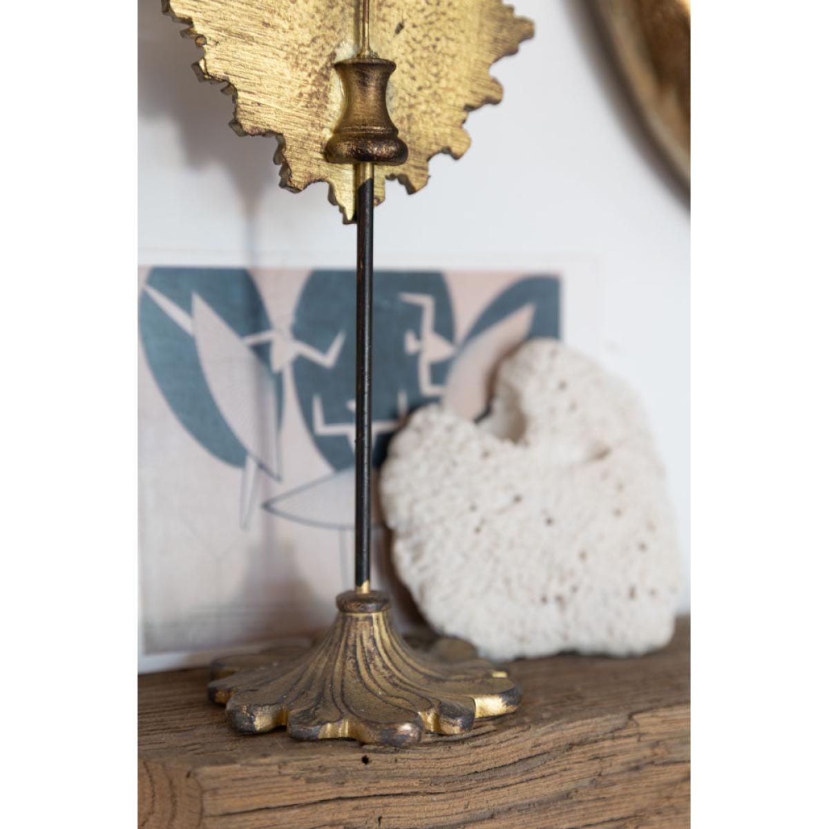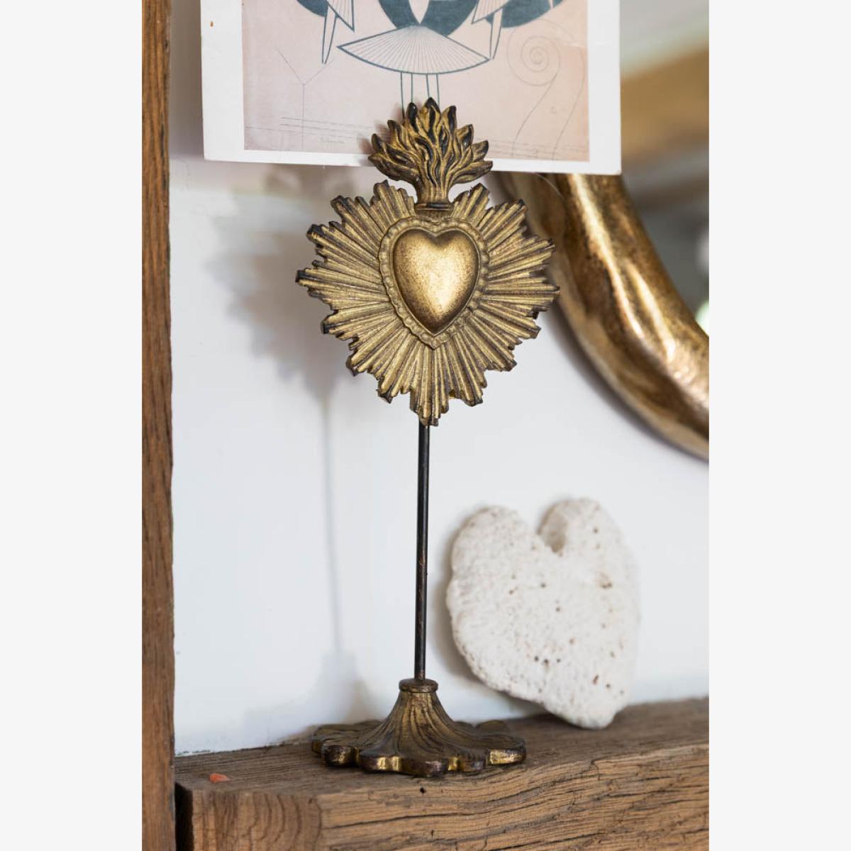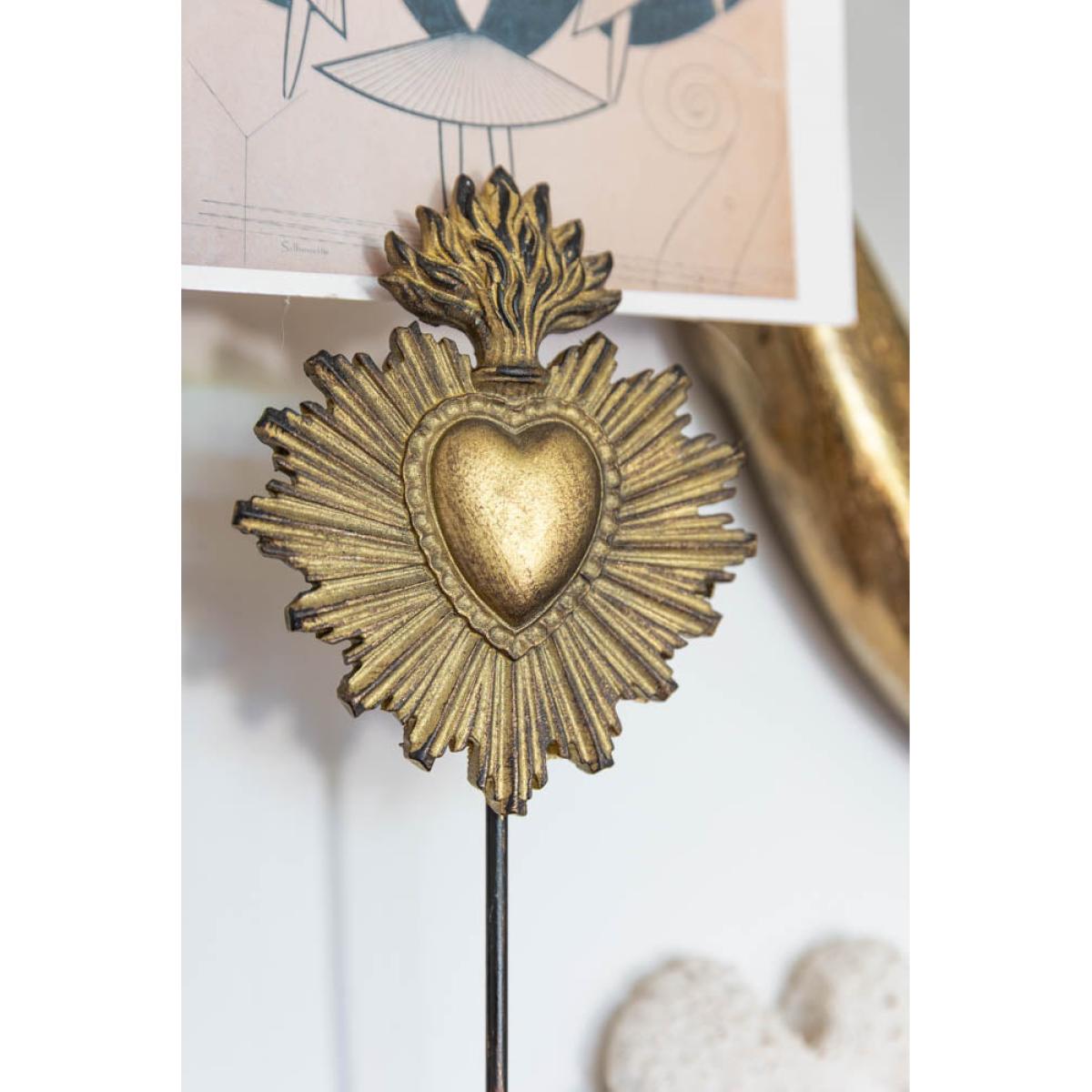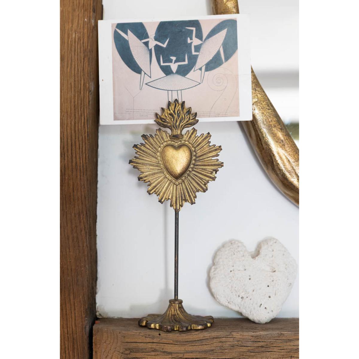 Celebrate life's special moments with the Milagro Heart Clip-On Photo Frame. Inspired by traditional Mexican milagro charms – tokens of love, hope, and protection – this ornate picture frame doubles as a quirky decorative ornament to transform cherished memories with soulful glamour. Featuring a standing, sacred heart design, simply clip your favourite photo or add a postcard from a gallery or exhibition for a unique take on displaying art in the home. Whether styled solo or as part of a curated style spot, this heart-shaped beauty brings a sense of romance and drama to your living room accessories. Think love at first sight! - Gold Milagro heart clip photo frame on a stand- Measures: W10cm x H26.5cm- Made from resin with an antique gold finish