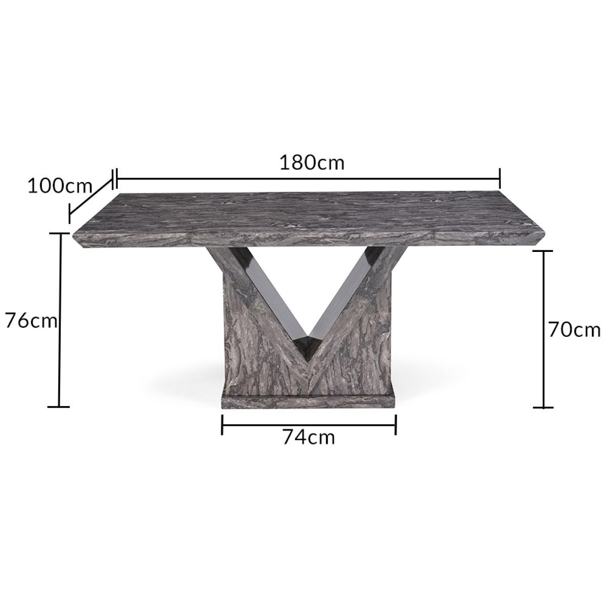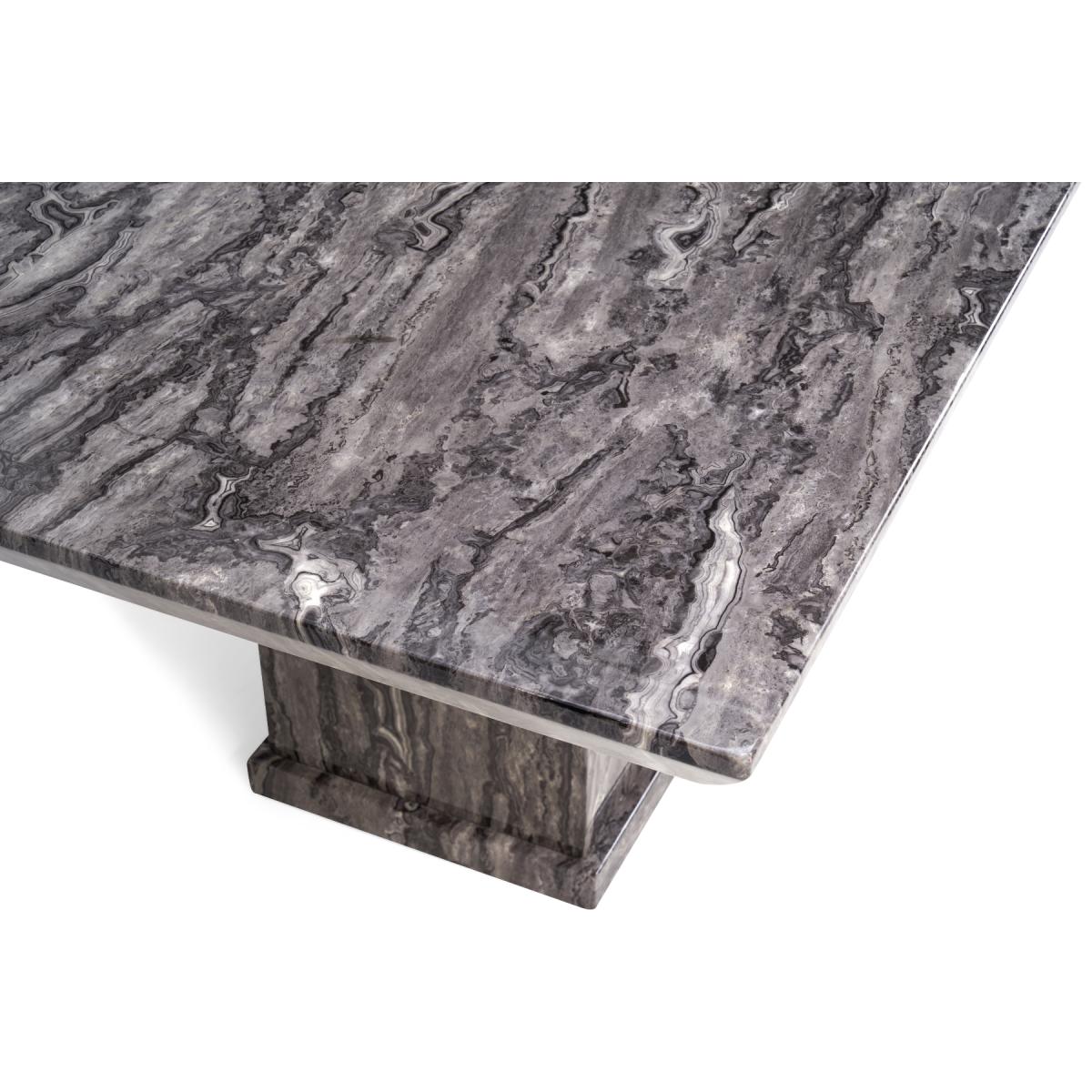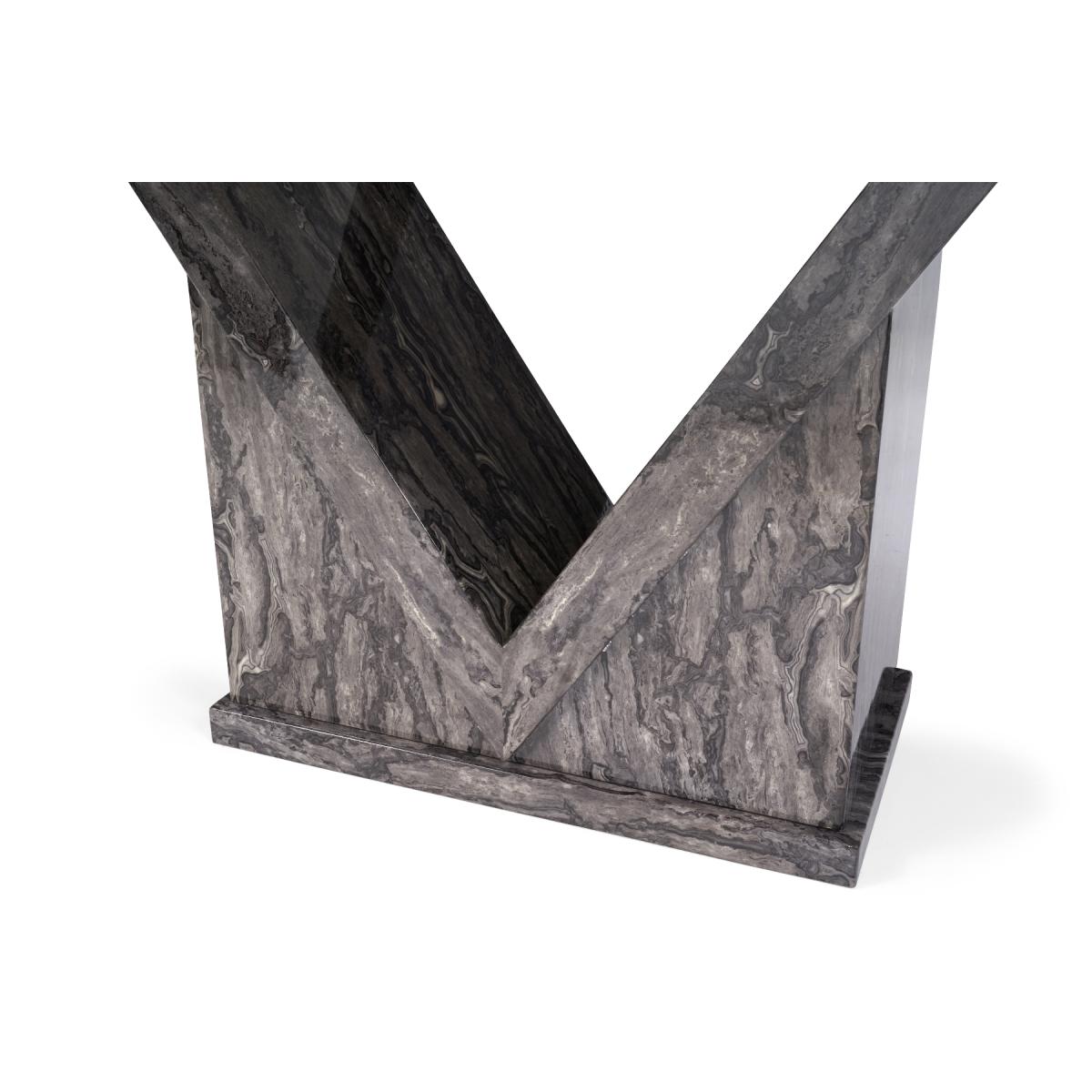 A unique V-shaped base complements the overall marble structure, adding a polished sensibility to the Milan marble table.