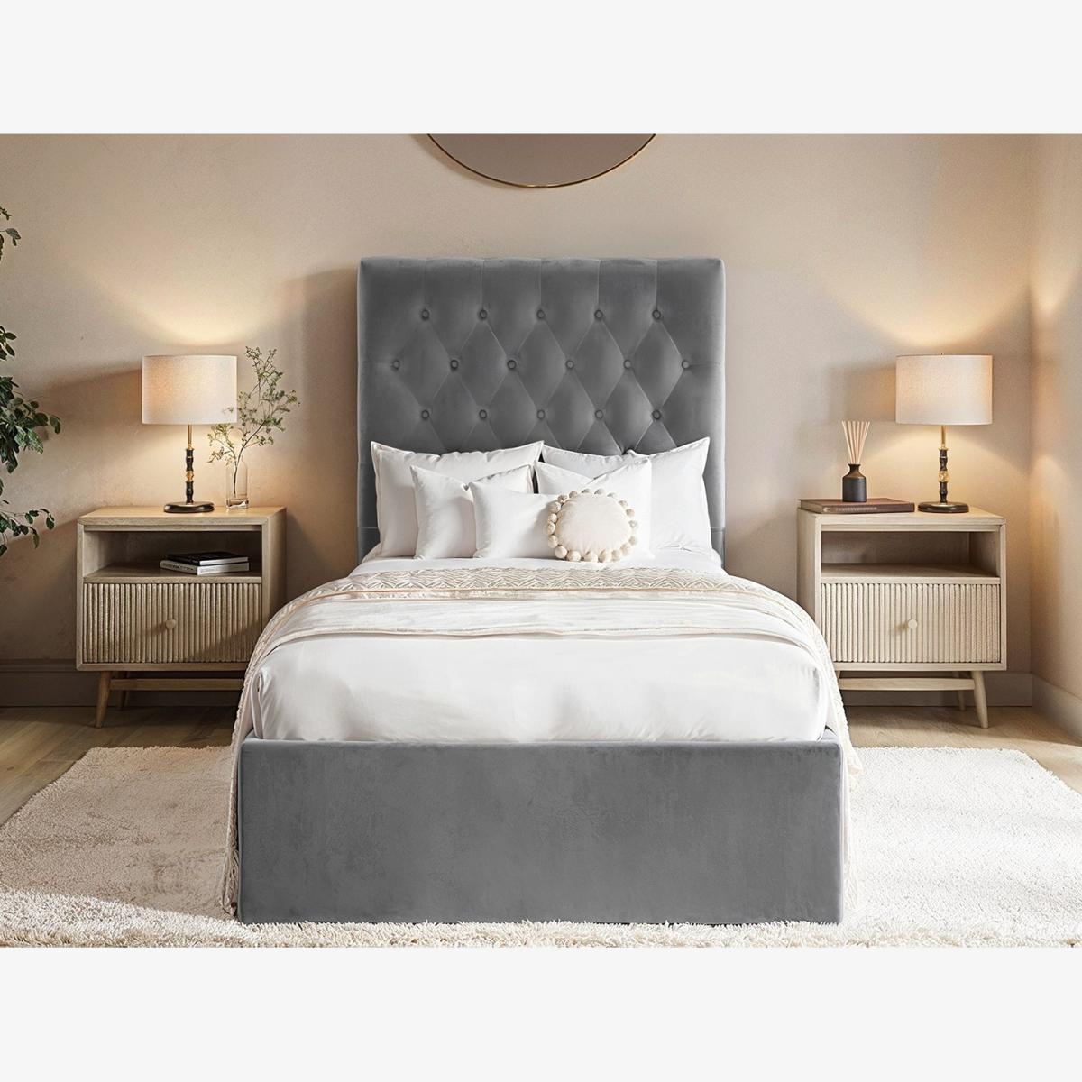 Our Milan Velvet Single Ottoman Bed will add a touch of elegance to any young person's room with its generous deep padded headboard and sideboards and sumptuously soft velvet upholstery. The base of this beautiful bed provides valuable additional storage space, ideal for bedding, toys and other belongings, easily accessed with the help of a gas lift system. The Milan has a sprung slatted base for excellent postural support, adjusting to where pressure is most exerted to provide greater comfort. Available in Two stunning colours, choose from Blush Pink or Steel Grey. This exquisite bed frame is perfect for a child's room and will make an excellent guest bed too.