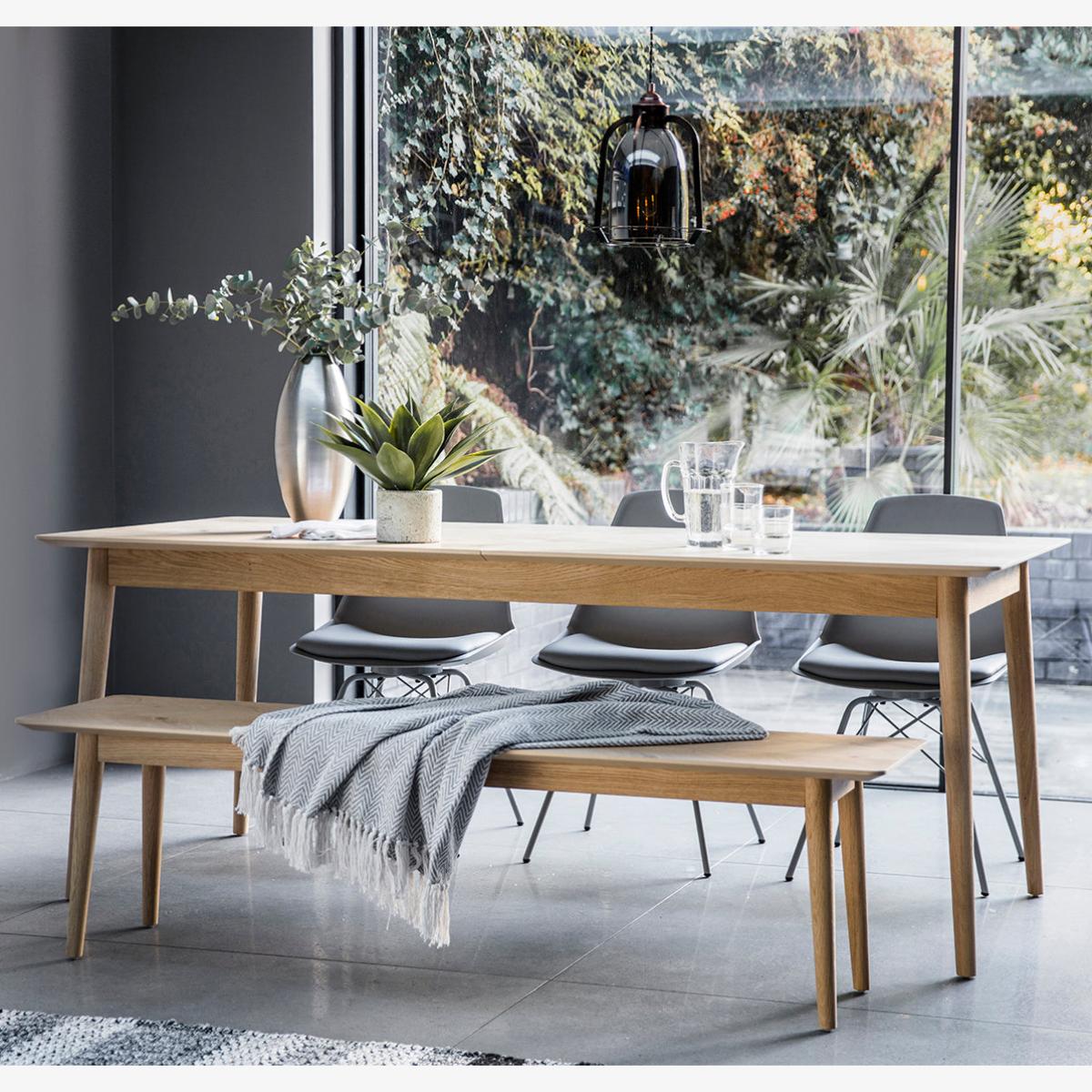 This stunning extending dining table features a beautiful inlay chevron design, and is made using European oak and rustic oak structured veneers which show the natural beauty of the oak grain and knots. Finished in a specialist mat lacquer, which keeps the timber looking natural and dry, with brushed out grain, the table is tactile to touch and looks amazing. W 2000-2520.