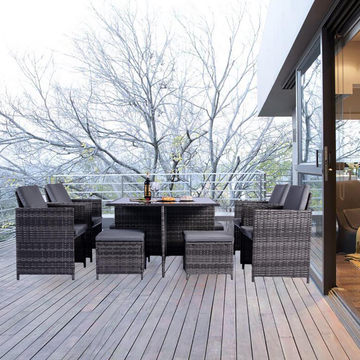Ideal for al fresco dining on the patio or garden decking, this grey rattan dining furniture set has everything you need to relax in the summer sun. Comprising of four high quality chairs coupled with a sturdy table and four stools, the entire set has been designed with the strength to withstand the elements. The Milano 9 piece cube sets the standard for high design as a compact, nine seat set that is perfect for all garden spaces. The tables large square top adds elegance and modernity to your outdoor area, with a super-sturdy construction made of powder coated steel and tempered glass. With a woven rattan seat this dining set comes in a grey on grey, making it the perfect addition to any garden or patio. A classic choice for outdoor dining, this 9 Seat Set will look the part in any contemporary or traditional garden. This set includes a table, 4 chairs and 4 stools that can be easily placed together into a cube for easy storage when not in use.