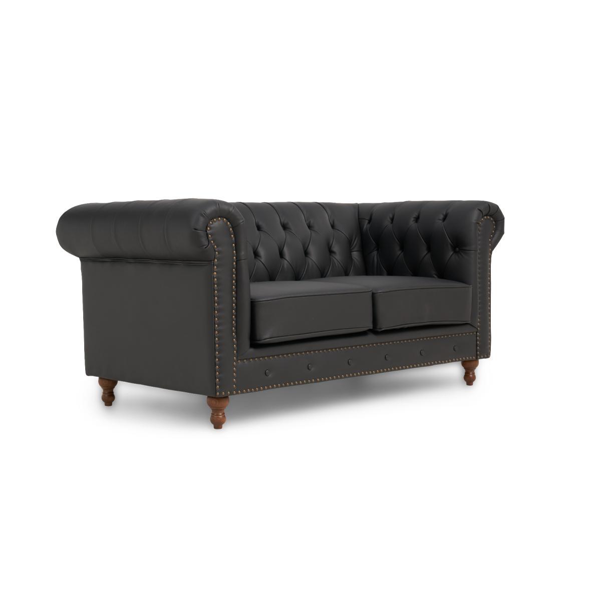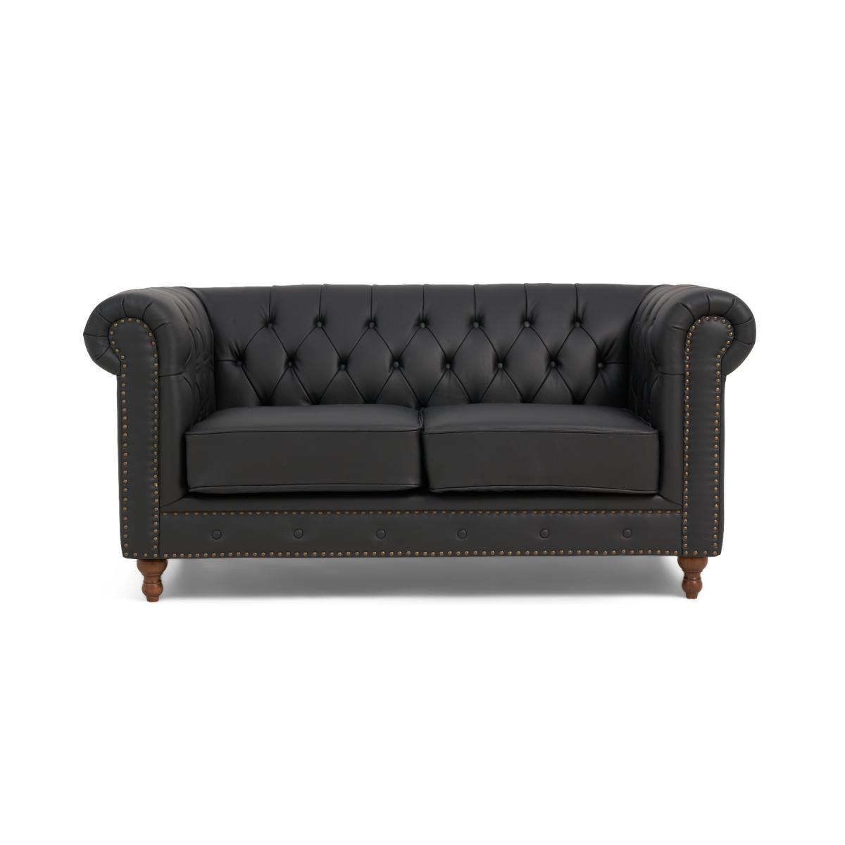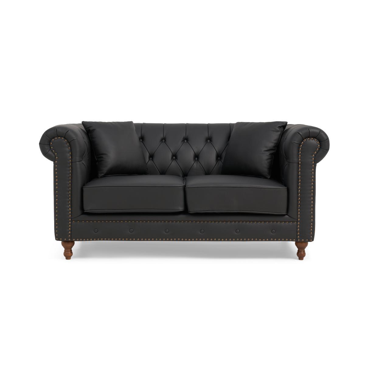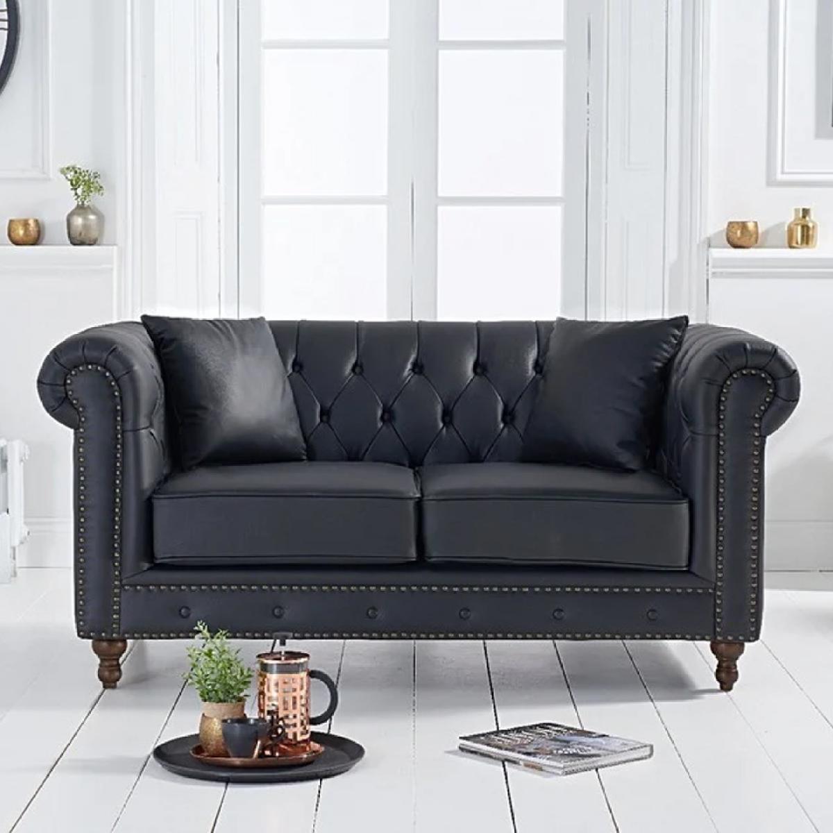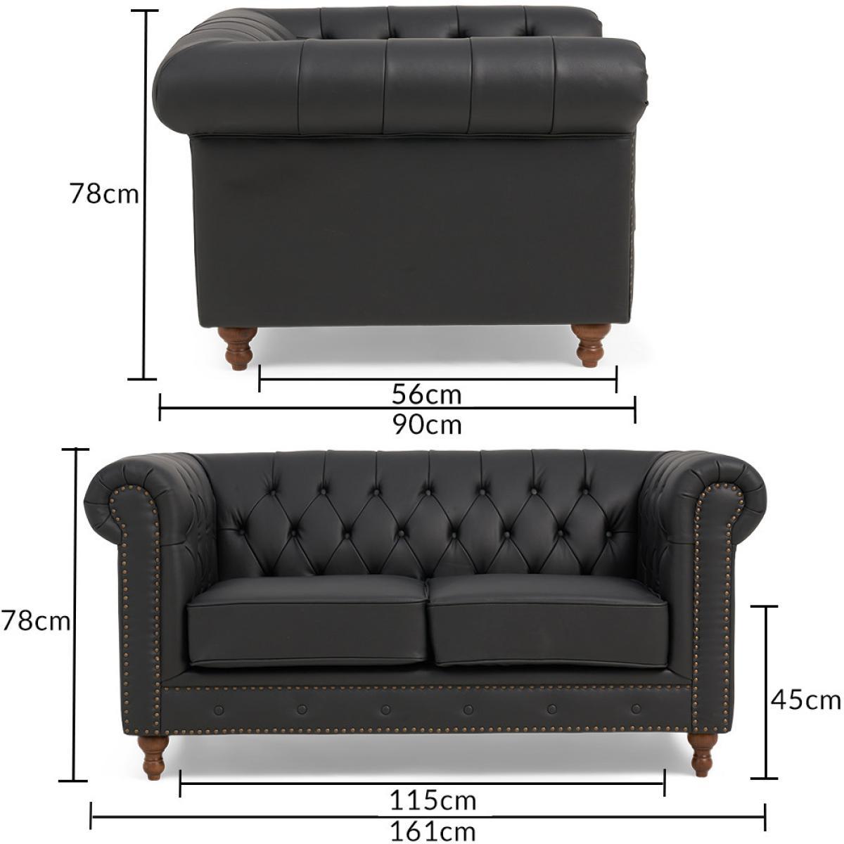 Upholstered in smooth black leather, the Milano 2 Seater Sofa is classically stylish. Featuring a deep-buttoned backrest and scrolled arms, the Chesterfield sofa is complete with a metal stud trim. Deep filled seat cushions offer a comfortable sit while the solid wood legs are stylish and supportive with an ornate design. Leather sofa with classic Chesterfield design. Stunning buttoned backrest and scrolled arms Complete with chic metal stud trim. Carefully crafted, with ornate solid wood feet. Plump, deep filled seat cushions provide a comfortable sit. Comes with two free matching scatter cushions. Also available in:Brown Leather, Grey Linen, Blue Plush, Green Plush, Grey Plush.