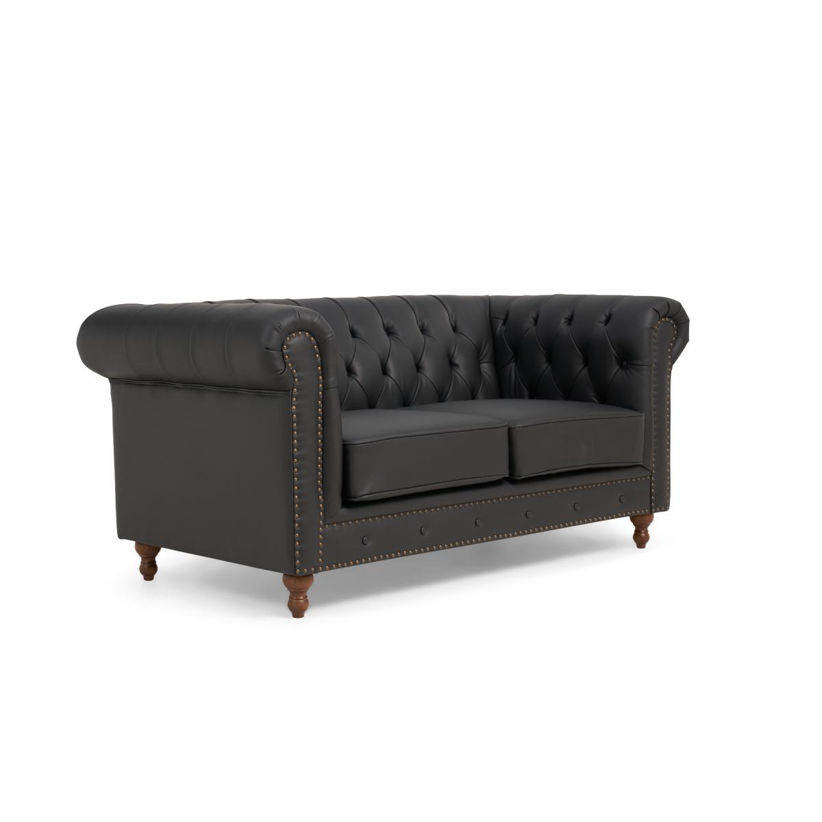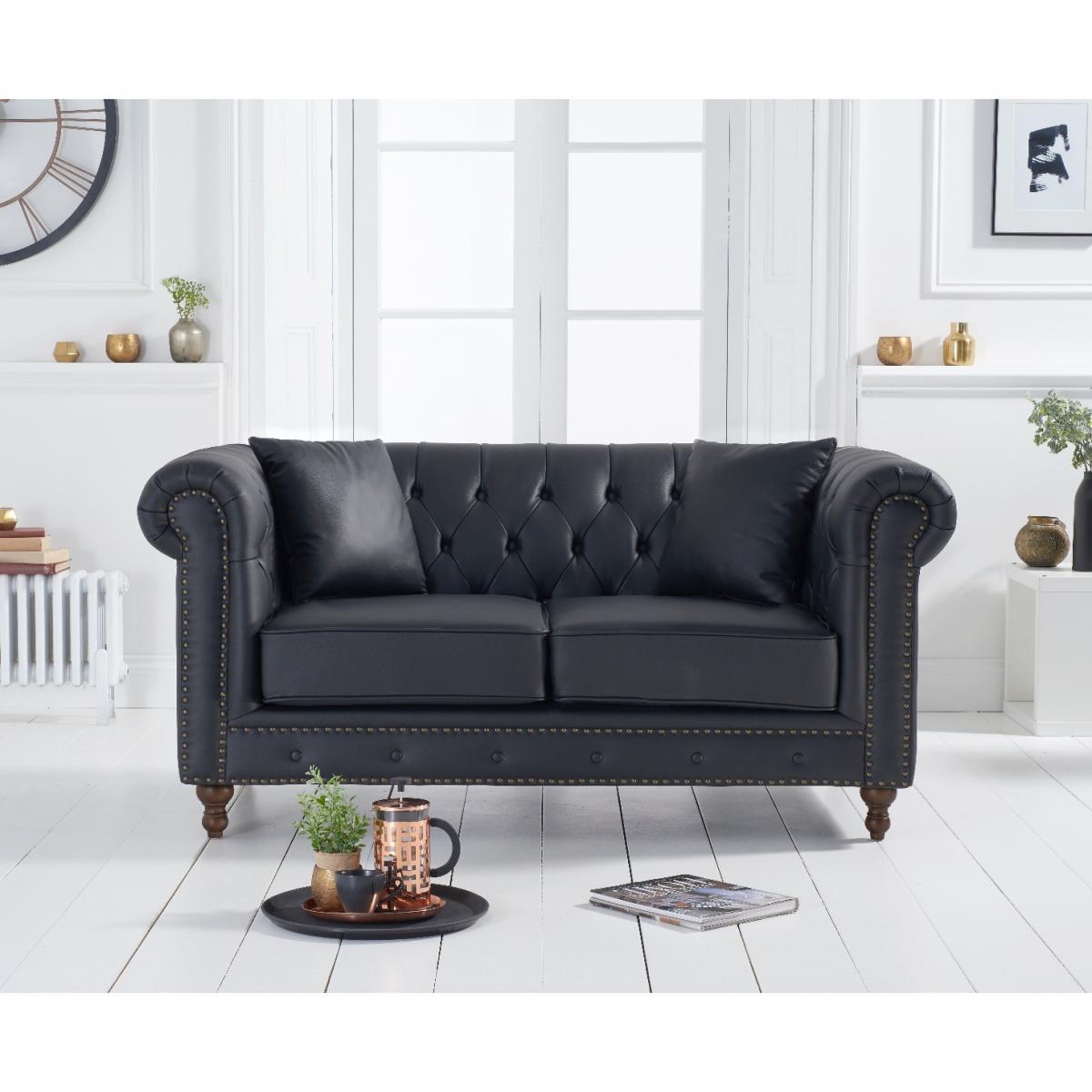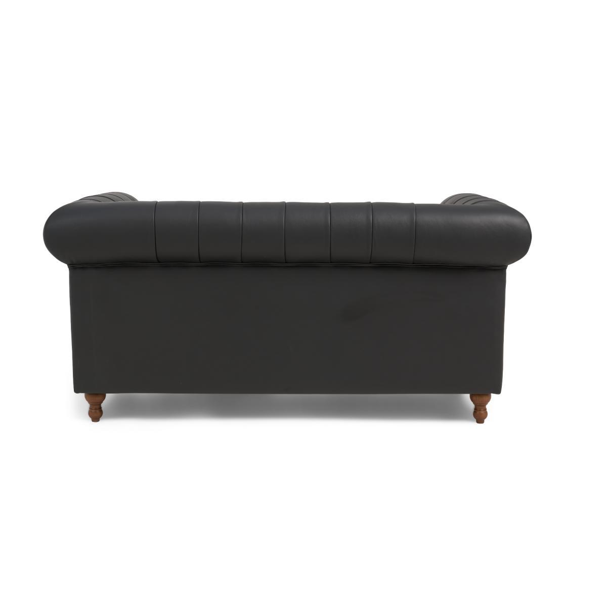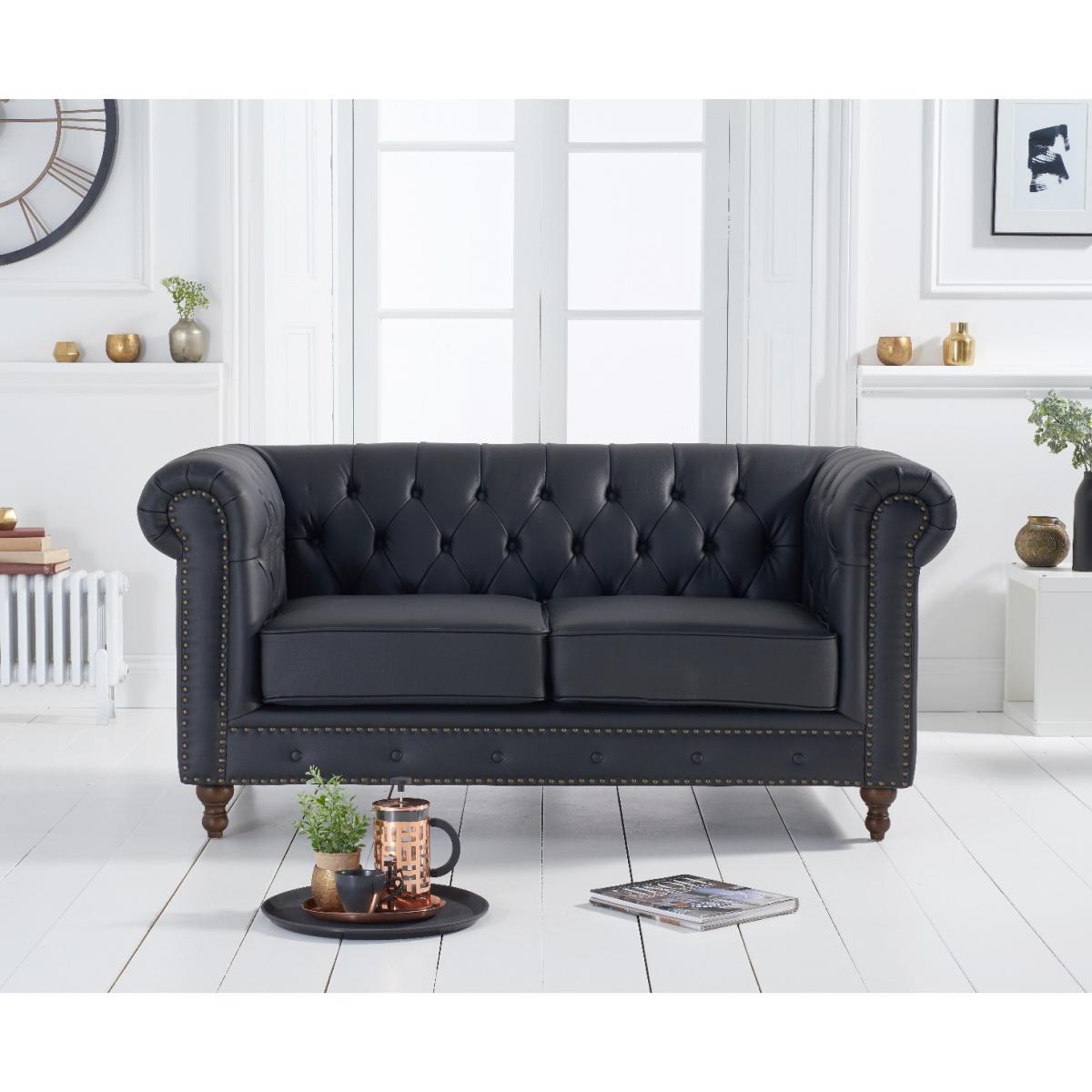 Upholstered in smooth black leather, the Milano 2 Seater Sofa is classically stylish. Featuring a deep-buttoned backrest and scrolled arms, the Chesterfield sofa is complete with a metal stud trim. Deep filled seat cushions offer a comfortable sit while the solid wood legs are stylish and supportive with an ornate design. Leather sofa with classic Chesterfield design. Stunning buttoned backrest and scrolled arms Complete with chic metal stud trim. Carefully crafted, with ornate solid wood feet. Plump, deep filled seat cushions provide a comfortable sit. Comes with two free matching scatter cushions. Also available in:Brown Leather, Grey Linen, Blue Plush, Green Plush, Grey Plush.