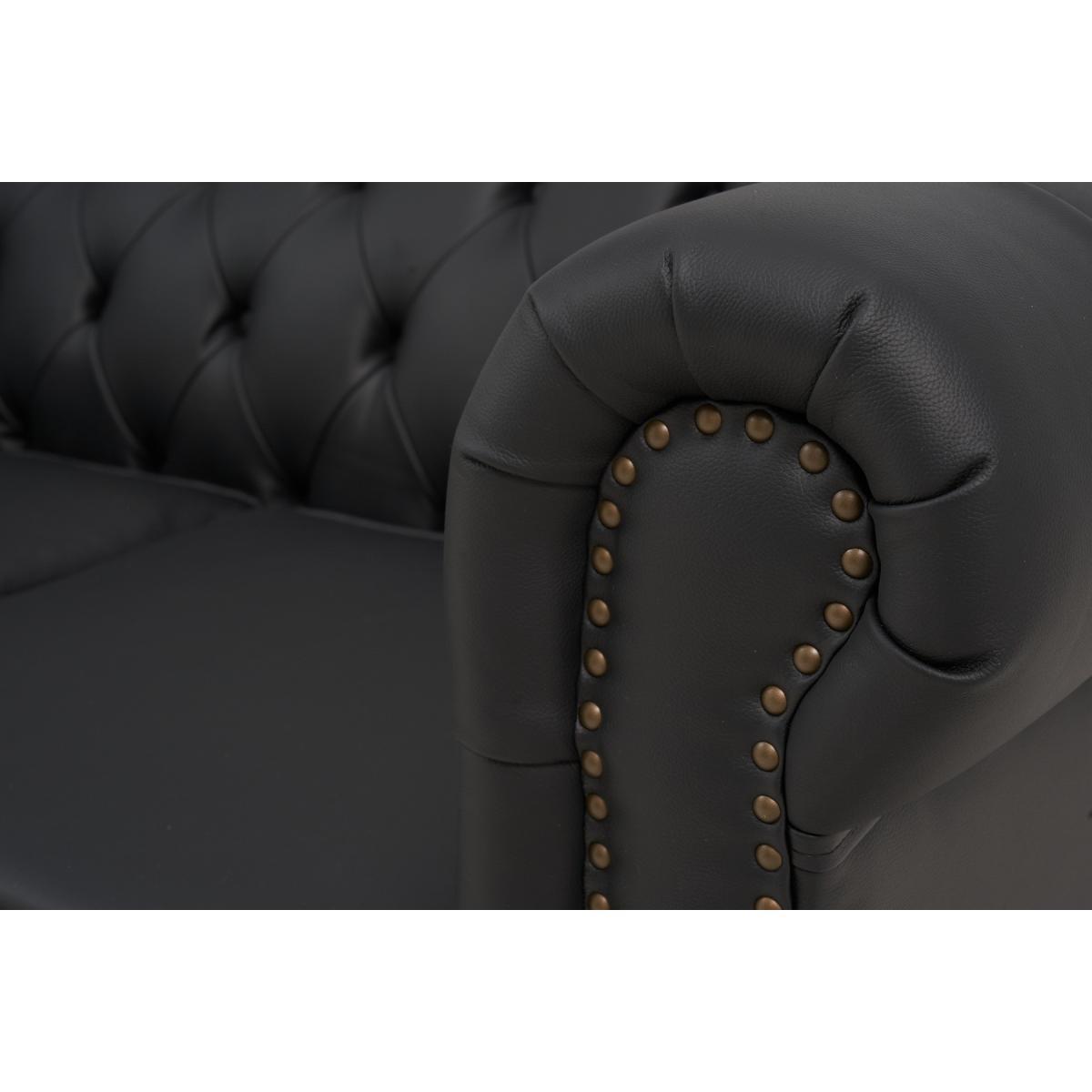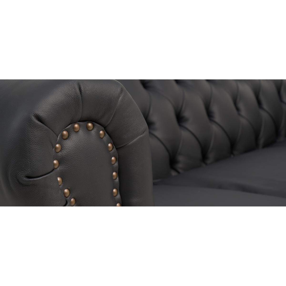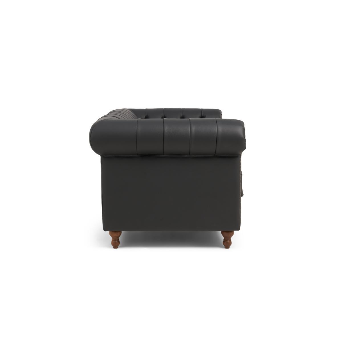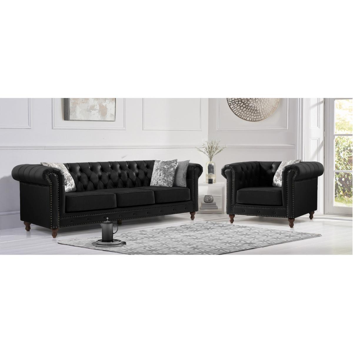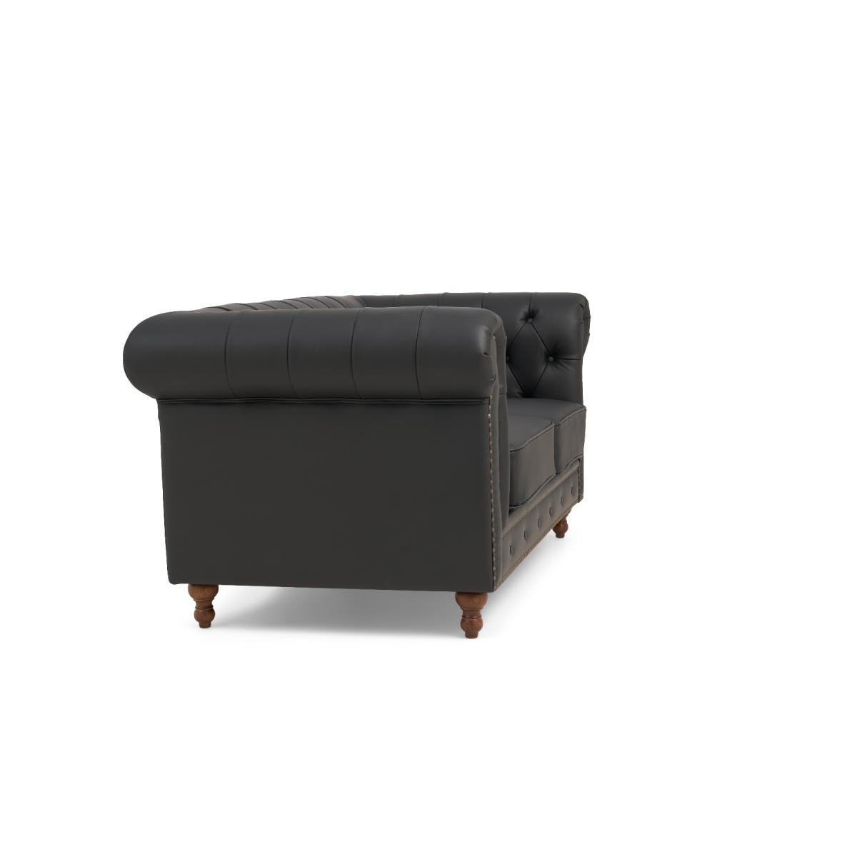 Upholstered in smooth black leather, the Milano 2 Seater Sofa is classically stylish. Featuring a deep-buttoned backrest and scrolled arms, the Chesterfield sofa is complete with a metal stud trim. Deep filled seat cushions offer a comfortable sit while the solid wood legs are stylish and supportive with an ornate design. Leather sofa with classic Chesterfield design. Stunning buttoned backrest and scrolled arms Complete with chic metal stud trim. Carefully crafted, with ornate solid wood feet. Plump, deep filled seat cushions provide a comfortable sit. Comes with two free matching scatter cushions. Also available in:Brown Leather, Grey Linen, Blue Plush, Green Plush, Grey Plush.