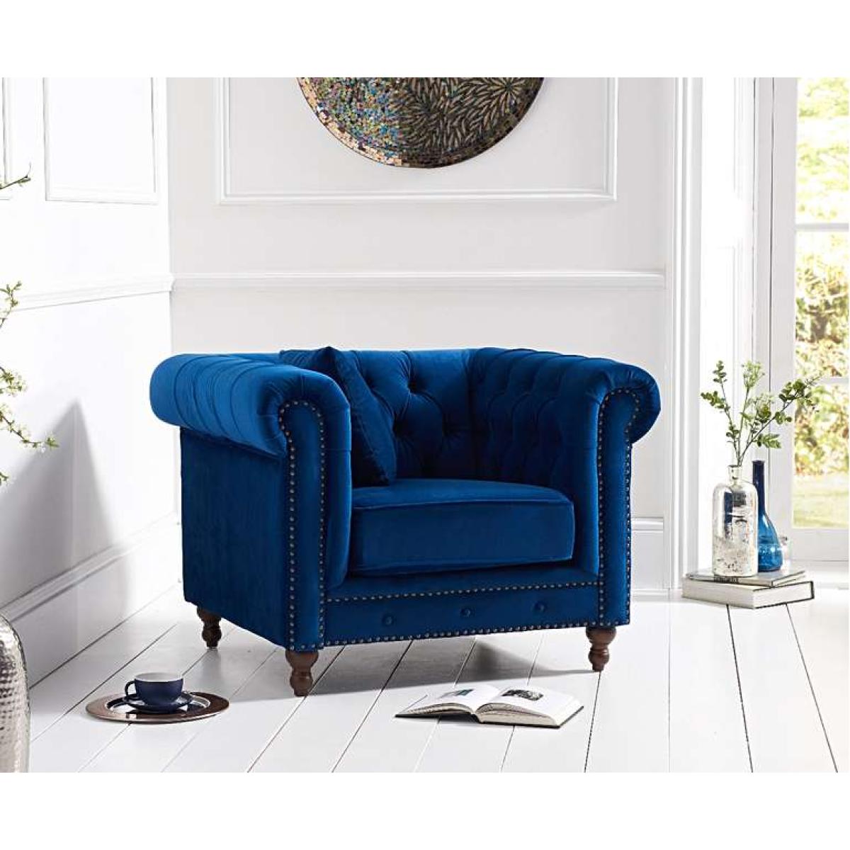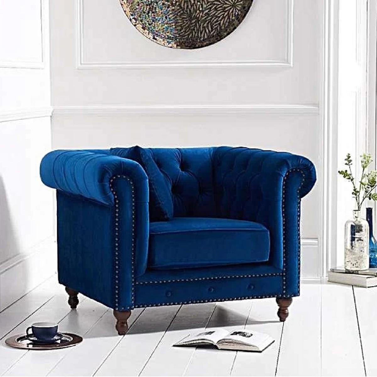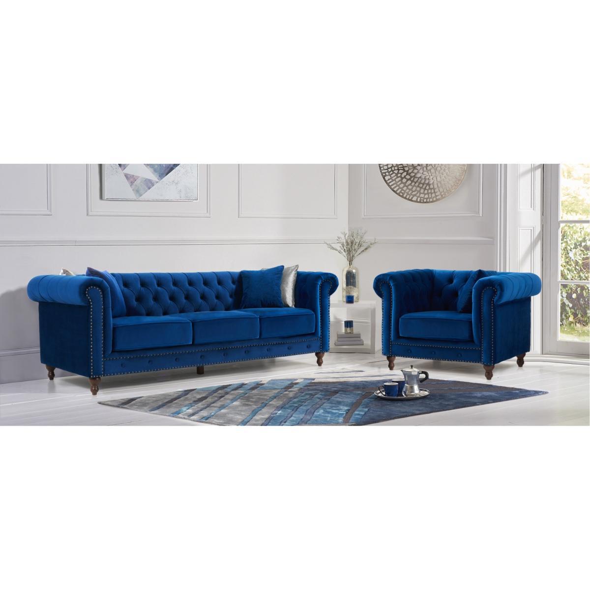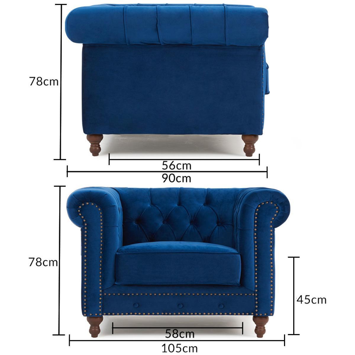 Milano Chesterfield Blue Plush Velvet Armchair brings a hint of glamour to any interior. Inspired by the classic Chesterfield design, the armchair is upholstered in rich blue plush fabric and features a deep-buttoned backrest and rolled armrests. The design of the chair is finished beautifully by metal studs that run around the edges and elegant yet resilient solid wood feet. The Milano Plush Armchair is also available in a choice of grey or green and is complete with 1 free scatter cushion.