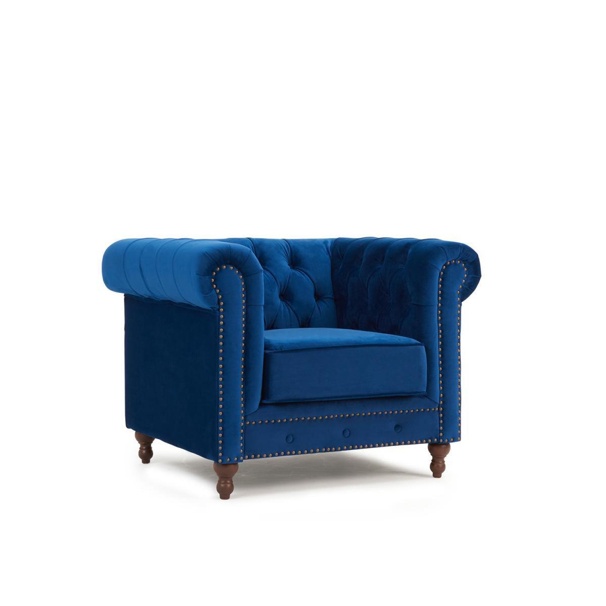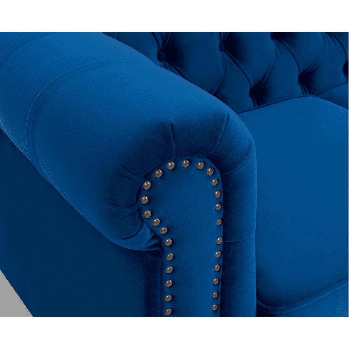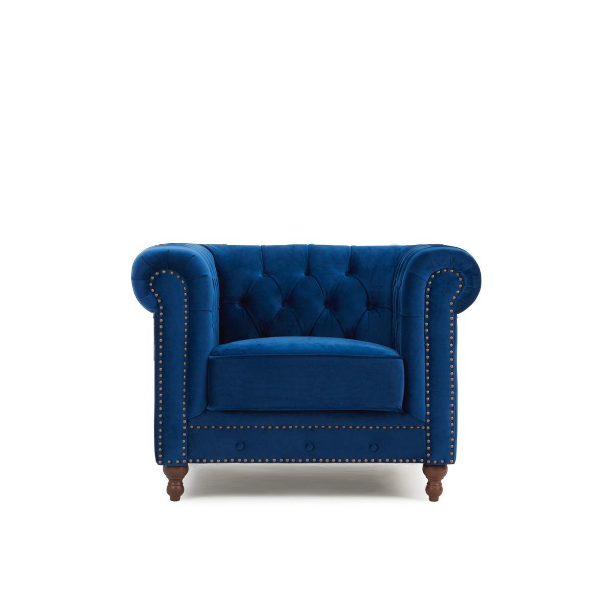 Milano Chesterfield Blue Plush Velvet Armchair brings a hint of glamour to any interior. Inspired by the classic Chesterfield design, the armchair is upholstered in rich blue plush fabric and features a deep-buttoned backrest and rolled armrests. The design of the chair is finished beautifully by metal studs that run around the edges and elegant yet resilient solid wood feet. The Milano Plush Armchair is also available in a choice of grey or green and is complete with 1 free scatter cushion.